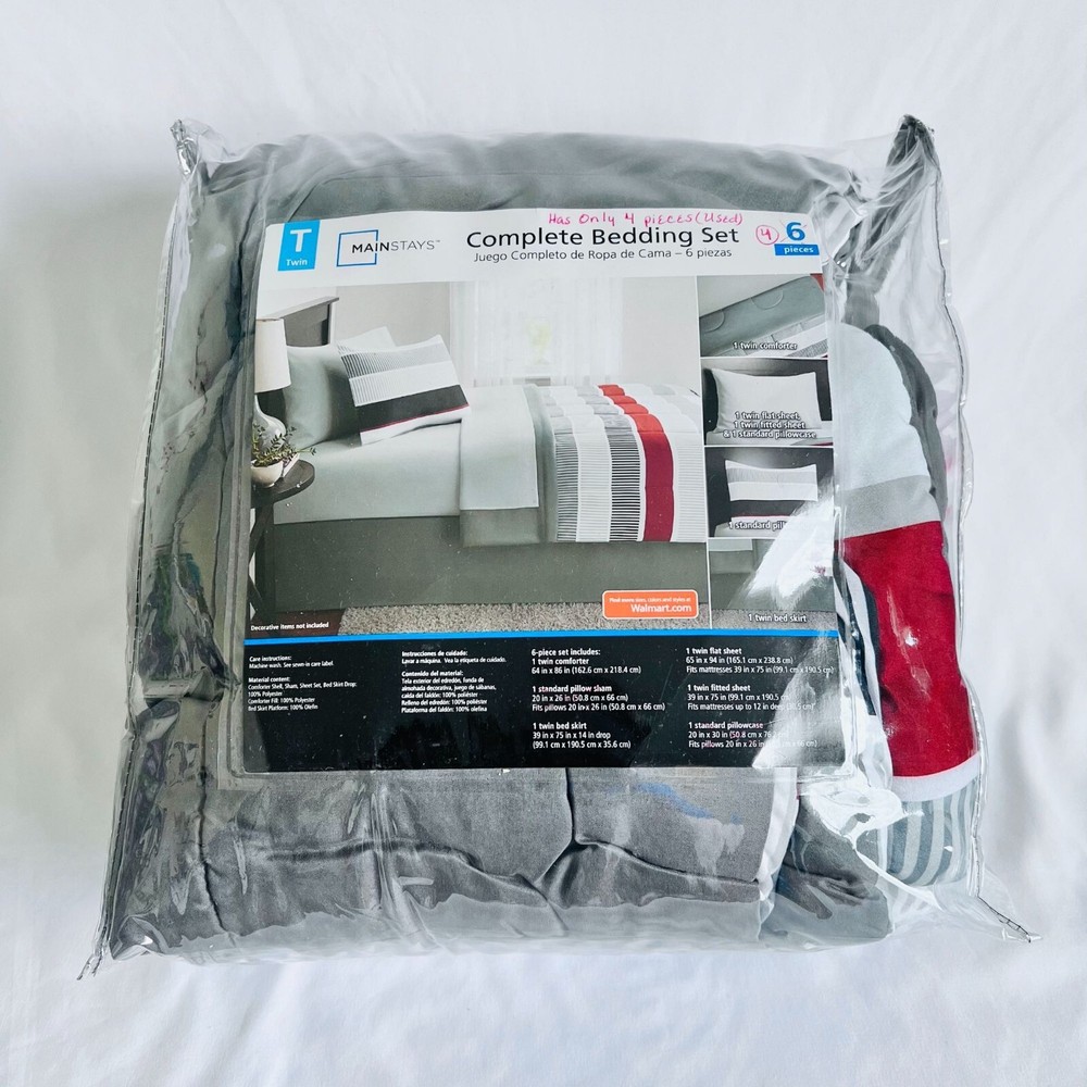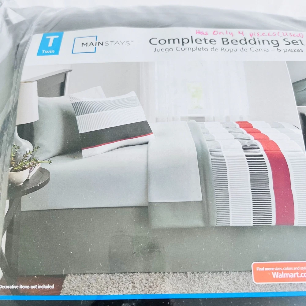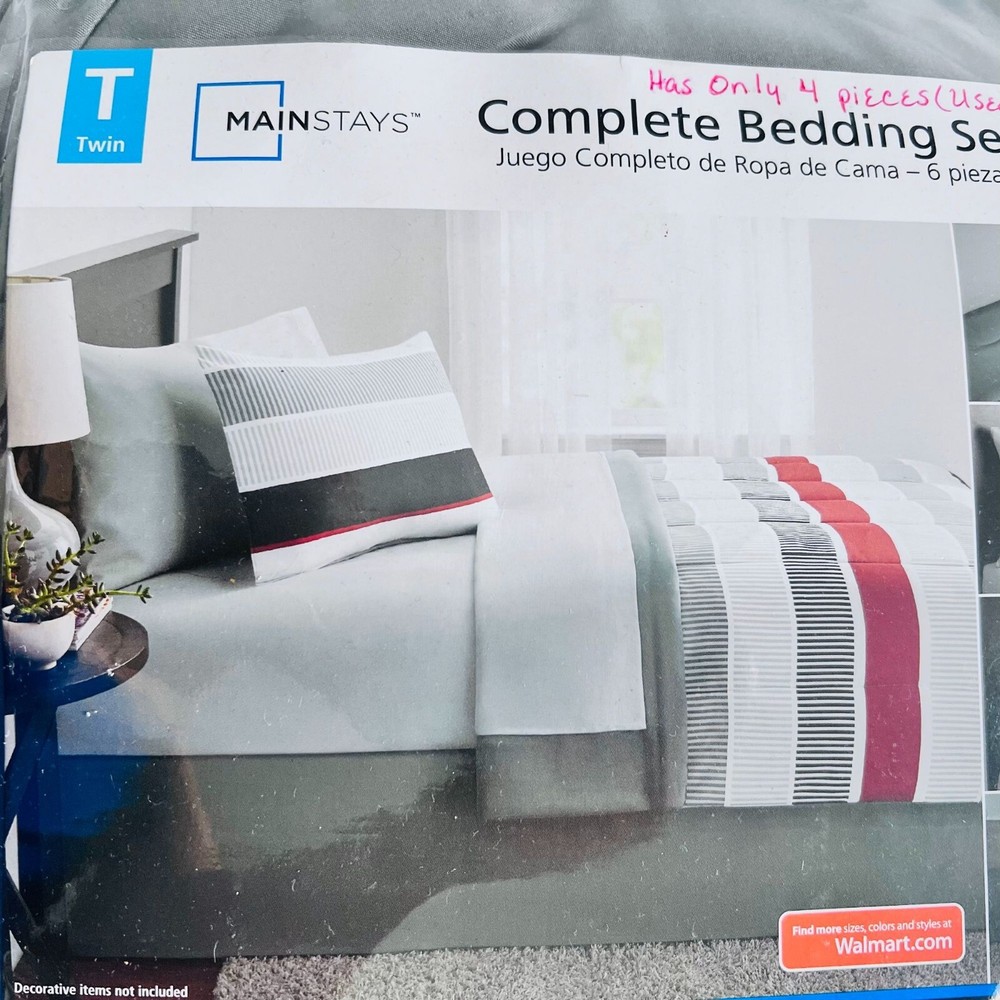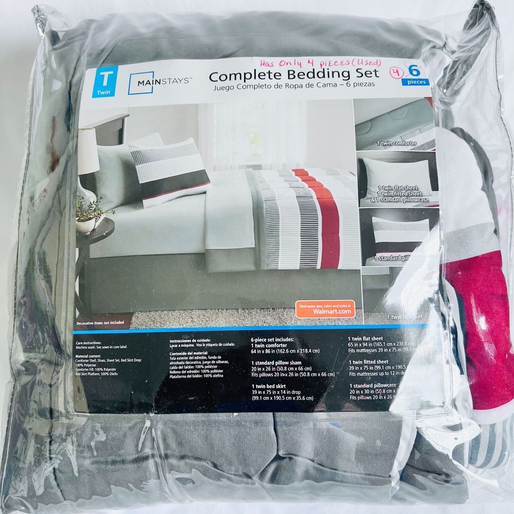 Mainstays Red and Gray Stripe 4-Piece (Twin) Comforter Set with Sheets. Twin. This Mainstays Red and Gray Stripe 4-Piece Comforter Set with Sheets brings a cozy, stylish touch to your twin bed. Featuring vibrant stripes, it adds a modern splash to your bedroom décor. • Twin size comforter set from Mainstays • Includes 4 pieces • Red and gray stripe design • Adds a stylish, modern touch • Cozy and comfortable This is NOT a 6-piece set. It is a 4-piece matching set only. Matching Twin Set includes: 1 Twin Comforter (64 inches by 86 inches) 1 Twin Bed Skirt 1 Twin Flat Sheet 1 Twin Fitted Sheet Pre-owned The entire set has been thoroughly washed, cleaned and is in very good condition. Ready to use. Smoke free, pet free environment. Thank you😊 Features: • Striped • Multi-Seasonal • Striped • Made in China • Machine Washable Size: Unisex Twin Measurements: Length 16 in / 41 cm Width 9 in / 23 cm Height 14 in / 36 cm Condition: Pre-Owned Good In Very Good Condition. Washed, cleaned and ready to use.