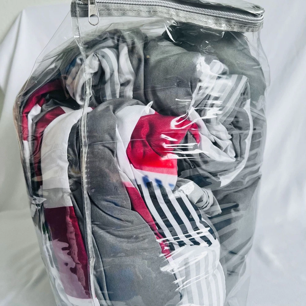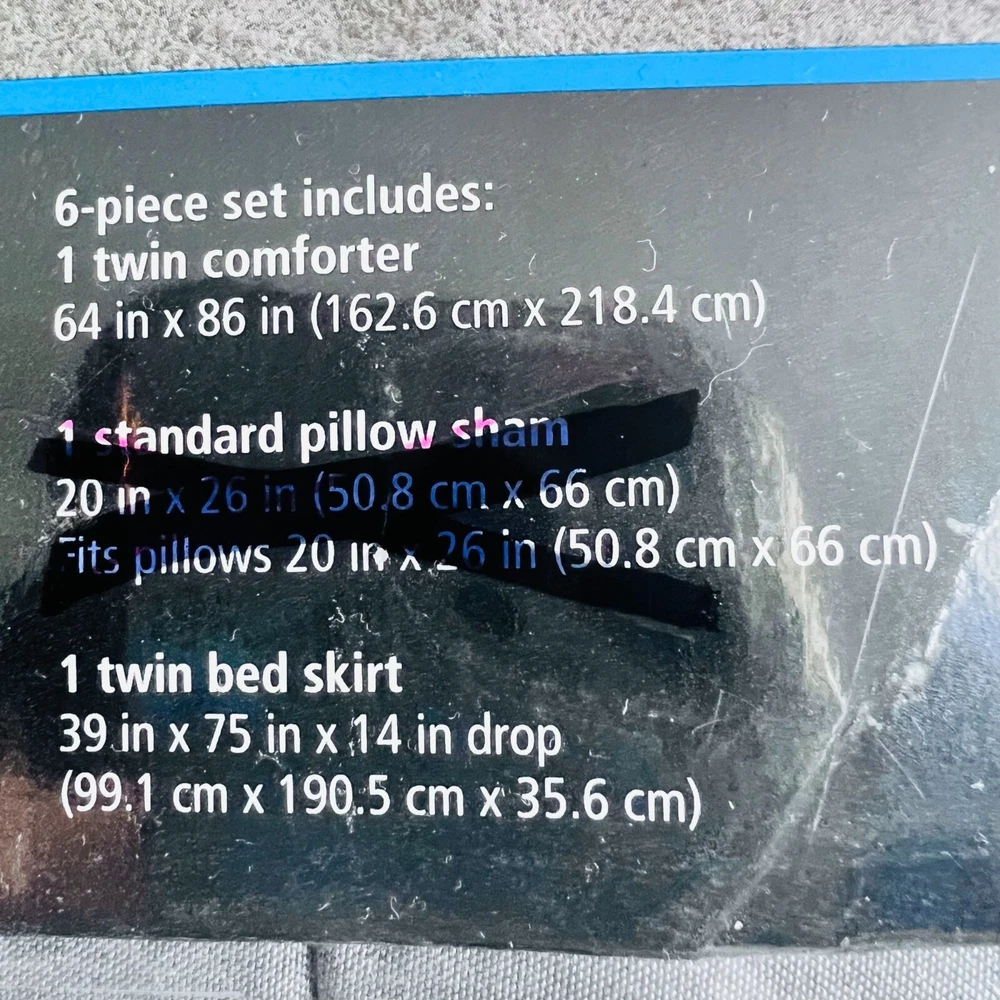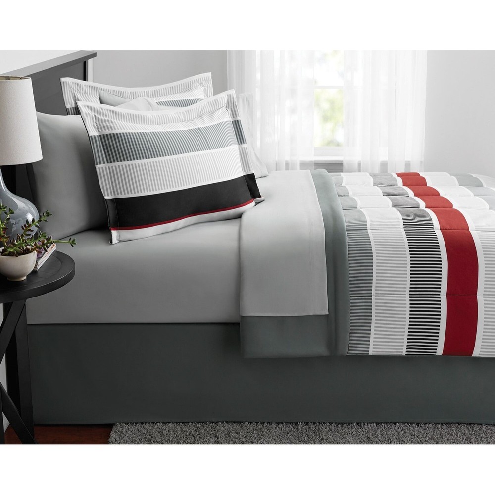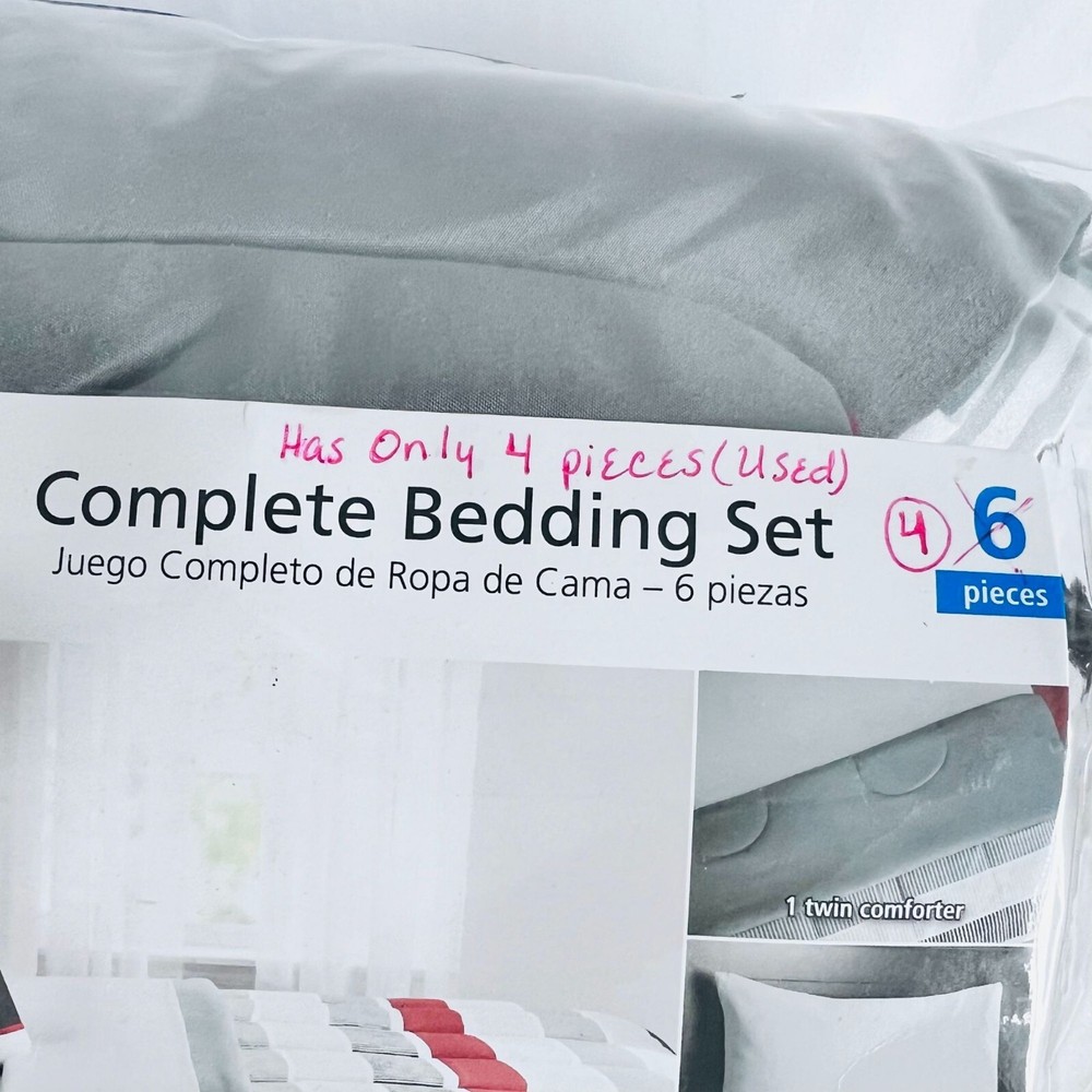 Mainstays Red and Gray Stripe 4-Piece (Twin) Comforter Set with Sheets. Twin. This Mainstays Red and Gray Stripe 4-Piece Comforter Set with Sheets brings a cozy, stylish touch to your twin bed. Featuring vibrant stripes, it adds a modern splash to your bedroom décor. • Twin size comforter set from Mainstays • Includes 4 pieces • Red and gray stripe design • Adds a stylish, modern touch • Cozy and comfortable This is NOT a 6-piece set. It is a 4-piece matching set only. Matching Twin Set includes: 1 Twin Comforter (64 inches by 86 inches) 1 Twin Bed Skirt 1 Twin Flat Sheet 1 Twin Fitted Sheet Pre-owned The entire set has been thoroughly washed, cleaned and is in very good condition. Ready to use. Smoke free, pet free environment. Thank you😊 Features: • Striped • Multi-Seasonal • Striped • Made in China • Machine Washable Size: Unisex Twin Measurements: Length 16 in / 41 cm Width 9 in / 23 cm Height 14 in / 36 cm Condition: Pre-Owned Good In Very Good Condition. Washed, cleaned and ready to use.