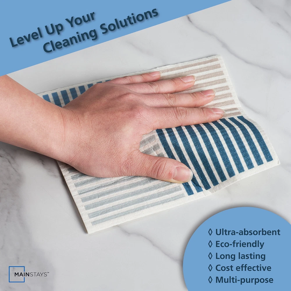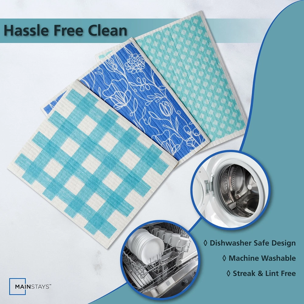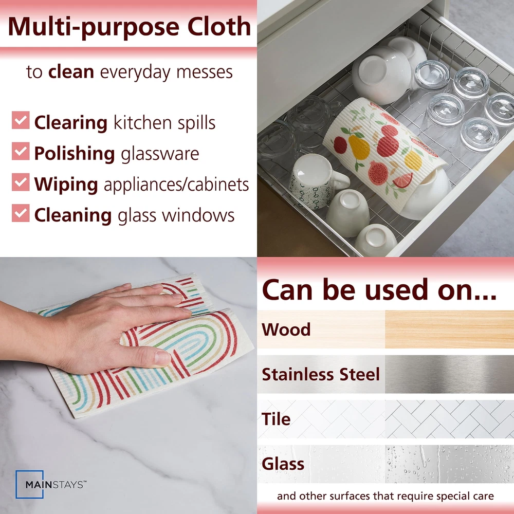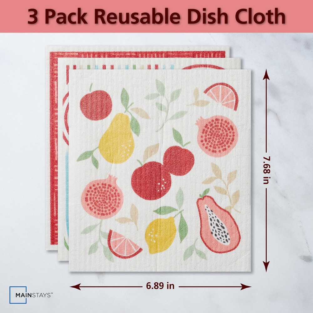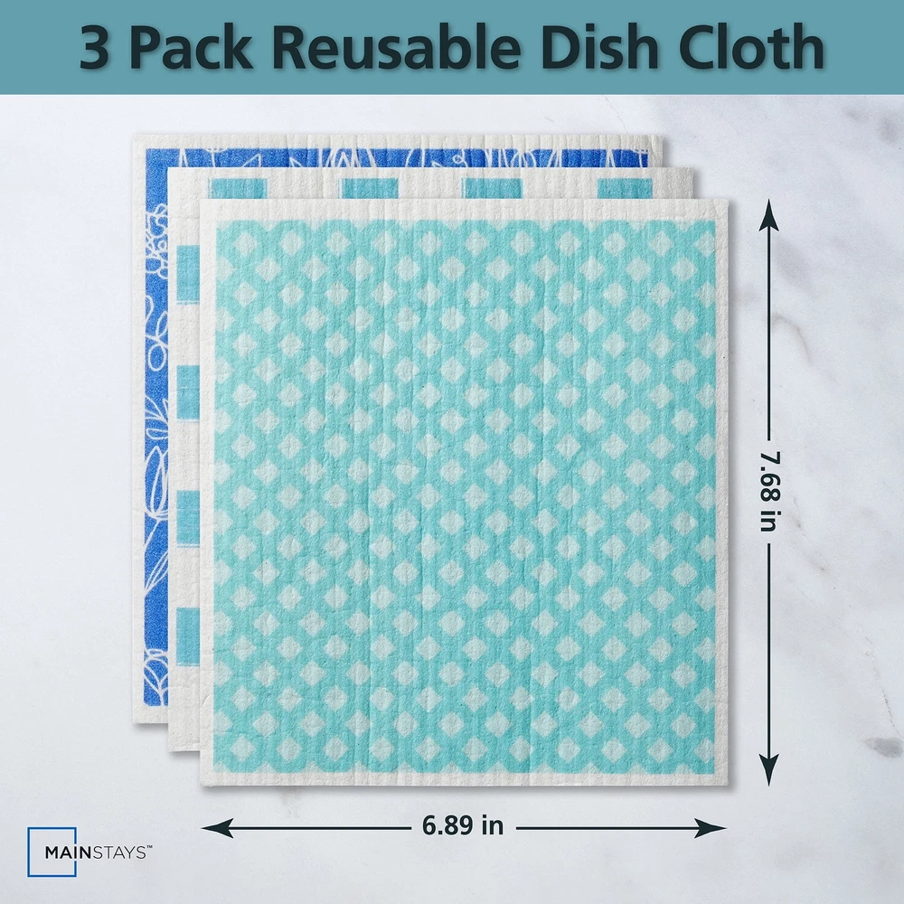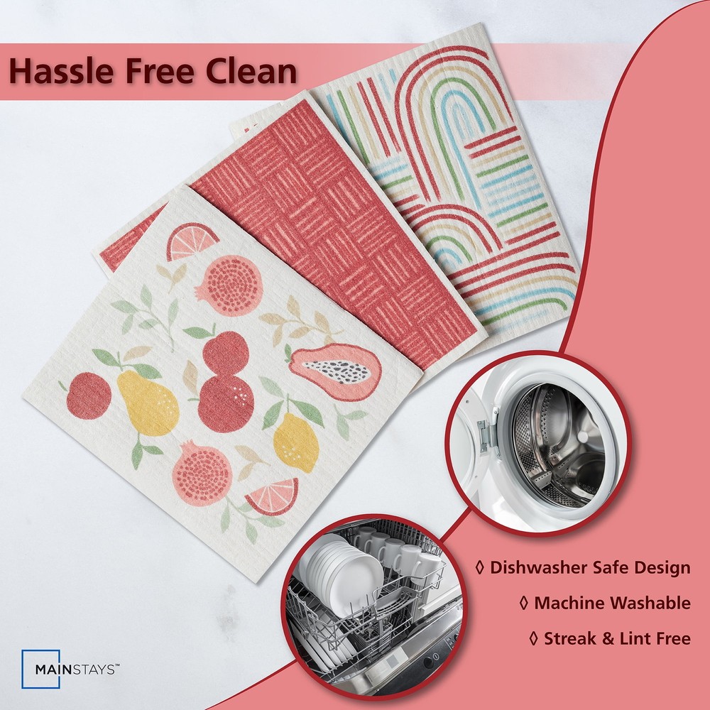 Eco-Friendly Cleaning: Made from sustainable materials, our 70% cellulose and 30% cotton swedish dish cloths provide an eco-friendly alternative to traditional disposable cleaning options. Ultra Absorption: These 6.9 in x 7.7 in reusable dishcloths boast exceptional absorbency, efficiently tackling spills, cleaning surfaces, and ensuring a thorough and effective cleaning experience. Reusable and Durable: Designed for long-lasting use, Mainstays sponge cloths are reusable and durable, standing up to the demands of daily cleaning tasks without losing effectiveness. Cloths feature a machine washable, dishwasher-safe design and are streak/lint free. Hygienic: Unlike traditional sponges, our reusable paper towels resist bacteria buildup, providing a hygienic cleaning solution that contributes to a healthier and cleaner environment in your home or workspace. Microwave safe for up to 60 seconds to sanitize. Cost-Effective Solution: Due to their reusable nature and long-lasting durability, our reusable kitchen cloths present a cost-effective cleaning solution, saving you money in the long run by minimizing the need to invest in as many paper towels. Elevate your kitchen cleaning experience with the Mainstays 3 pack swedish dishcloths—a versatile tool designed for efficiency and sustainability. Soft and naturally highly absorbent, these 6.9in x 7.7in reusable dish towels are made from 70% cellulose, 30% cotton and come in handy for cleaning countertops, clearing spills or messes, polishing glassware and more. From scrubbing dishes to wiping down surfaces, its flexibility ensures a gentle touch on all kitchen essentials. These dual-sided reusable paper towels are streak and lint-free for a hassle-free clean. Simply wash and reuse so you can cut back on excess laundering and paper towel expenses. These paper towels are top-rack dishwasher safe so you can throw them in with the dishes for a nice clean. To sanitize, wet and place in the microwave for up to 60 seconds. For easy care, machine wash cold. This pack includes three rectangular paper towels, featuring colorful, bold prints in red hues on both sides to add natural style to your kitchen decor.