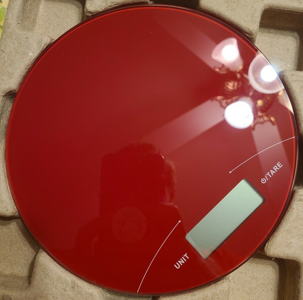 Brand new in open box. No scratches at all. Tested and works great. Box does have slight damage. Mainstays Round Digital Glass Scale - Red (Up to 11lbs). Shipped with USPS Priority Mail.