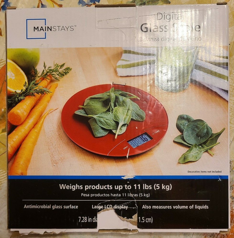 Brand new in open box. No scratches at all. Tested and works great. Box does have slight damage. Mainstays Round Digital Glass Scale - Red (Up to 11lbs). Shipped with USPS Priority Mail....