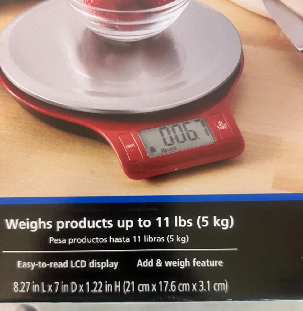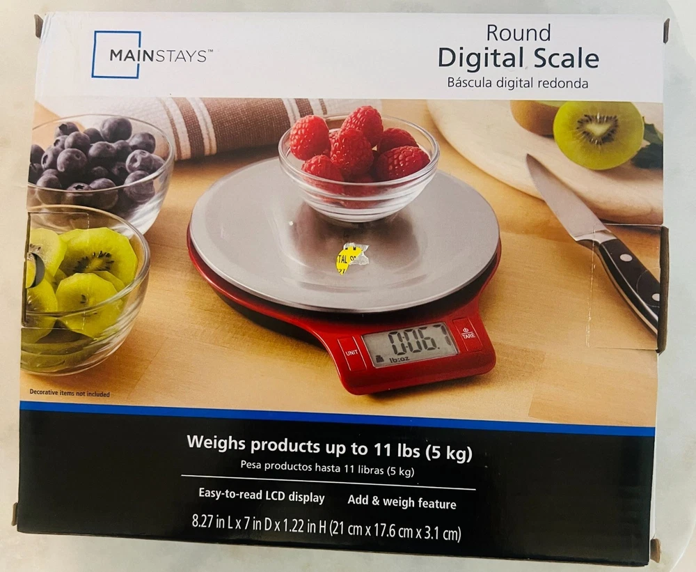 Mainstays Round Digital Scale With LCD Display Postage Food or Kitchen Scale 11 lbs max batteries included. Trying to figure out if that fruit bowl is heavier than your patience level? This digital scale can weigh up to 11 lbs, so you’ll know exactly how many raspberries it takes to tip the scale. • Weighs Up To 11 lbs (5 kg) • Easy-to-Read LCD Display • Add & Weigh Function • Round Design 8.27 in L x 7 in D x 1.22 in H (21 cm x 17 cm x 3.1 cm) Tested - Works Our items are carefully examined, measured, photographed and stored in a smoke free environment. We do our best to describe accurately and measure approximately at the time of listing,. Please contact me if you have any questions or issues. Please note that the color you see on the monitor may not be the exact color of the item. 100% authenticity is guaranteed. Items typically ship same or next business day. 240821-01B04 Size: Womens 8.27" X 7" X 1.22" Condition: Pre-Owned Good Tested & it works great. Batteries included.