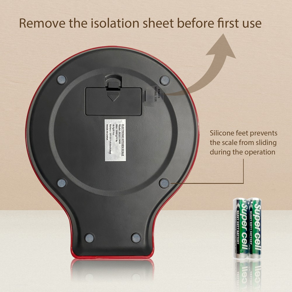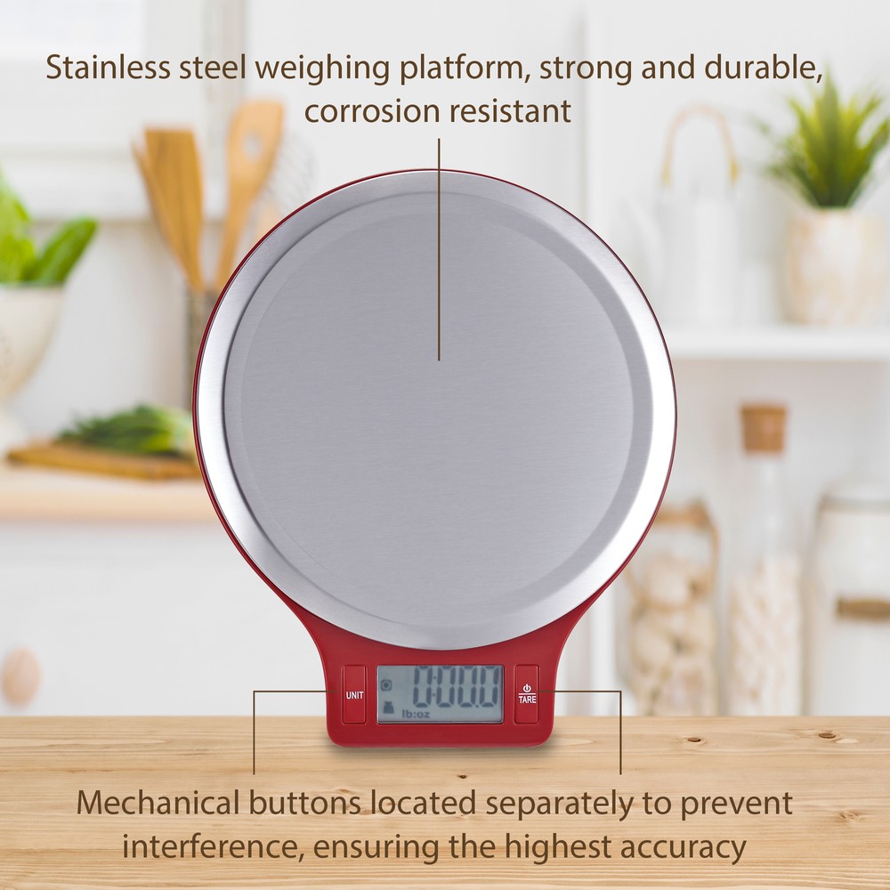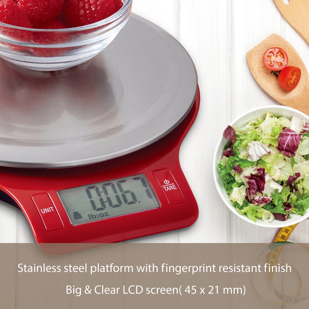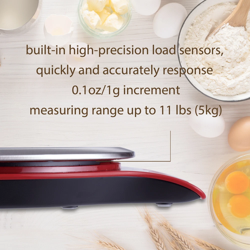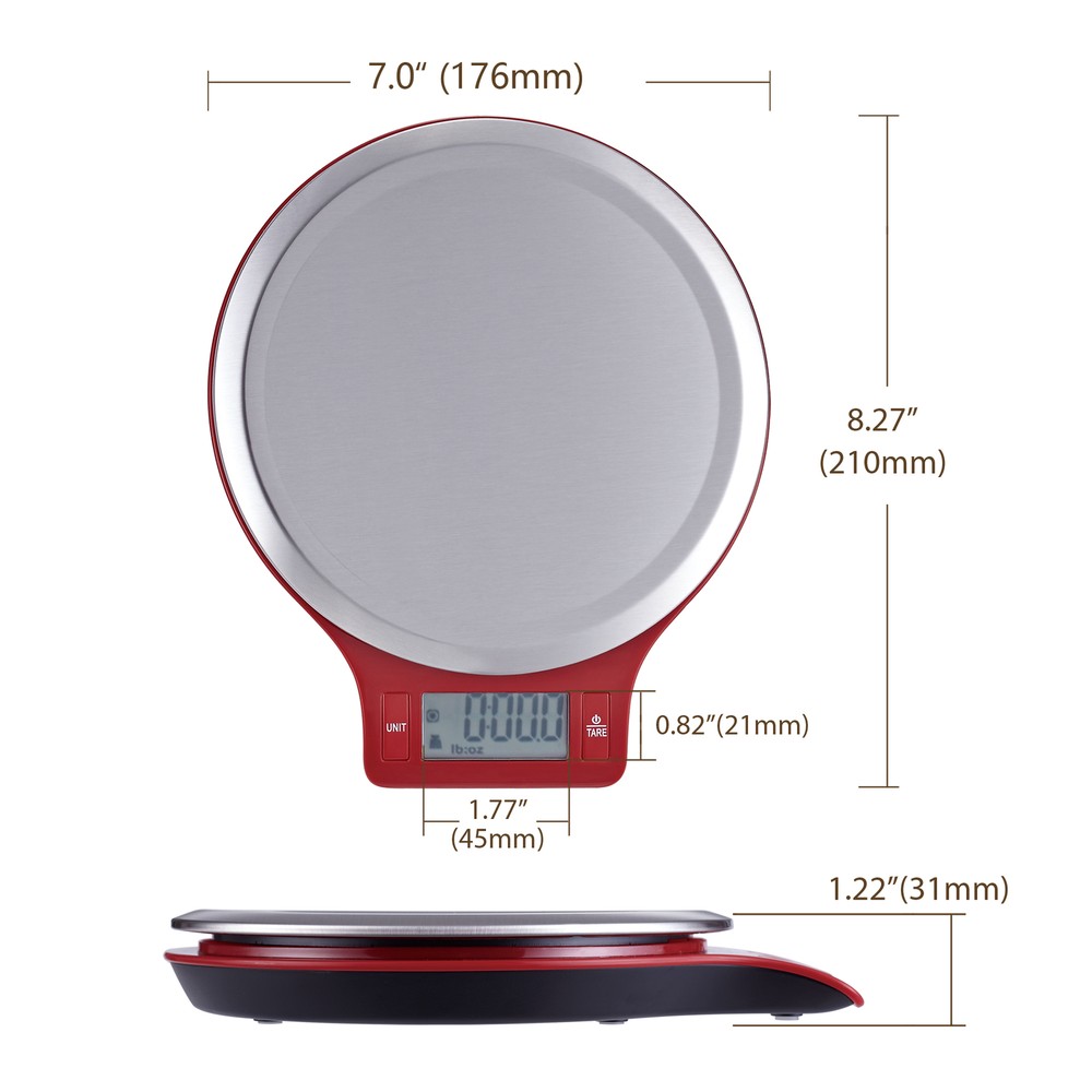 Mainstays Round Stainless Steel Digital Kitchen Scale, Red Mainstays Round Stainless Steel Digital Kitchen Scale, Red Mechanical button with big LCD screen( 45 x 21 mm) Round stainless steel weighing platform with fingerprint resistant finish Built-in high-precision load sensors, quickly and accurately display in 0.1 oz/1 g increments Measuring range up to 11 lbs (5kg) Advanced sensor technology delivers quick, accurate responses Easily convert units to help you measure different types of foods and ingredients Tare button subtracts container weight to zero out the scale so you only measure what you want Has both modes of "manual off" and "auto off" (occurs if no operation on the scale for about 3 seconds) to save power Powered by two AAA batteries( included) Measures approximately: 8.27"L x 7.0"W x 1.22"H (L 21 cm x W 17.6 cm x H 3.1 cm)