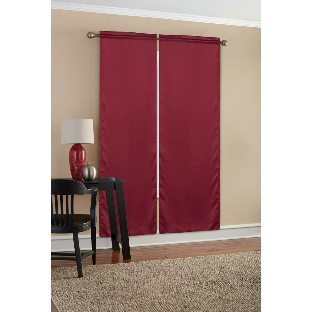 Mainstays Solid Color Room Darkening Rod Pocket Curtain Panel Pair - 30'' x 84'' Listing is for a set of TWO PANELS Measuring 30'' x 84''. New condition - No retail package. Curtains have been handled but never installed. Color is a deep red. Product details Give your space an instant makeover with Mainstays Room Darkening Window Curtain Panel Pairs. Available in grommet or rod pocket top construction with multiple solid colors or patterned prints to choose from making it easy to mix, match and personalize your window space. The Room Darkening properties help to block out unwanted light. These Mainstays Room Darkening Panel Pair window curtains are perfect for the living room, bedroom, or dining room. Combine style and innovation with Mainstays Solid Room Darkening Panel Pair. Mainstays Room Darkening Rod Pocket Window Curtain Panel Pairs Sold as a set of 2 Curtains Patterns available include Medallion Print, and Distressed Ikat Print Room Darkening Properties help keep out unwanted light 100% Polyester Machine wash cold; line dry Specifications Features Energy-efficient, Room Darkening Country of Origin - Textiles Imported Material Polyester Size 30 x 84 Curtain Panel Style Rod Pocket Assembled Product Weight 1.17 lb Brand Mainstays Manufacturer Part Number FZJ007T44BRK Color Brick Red
