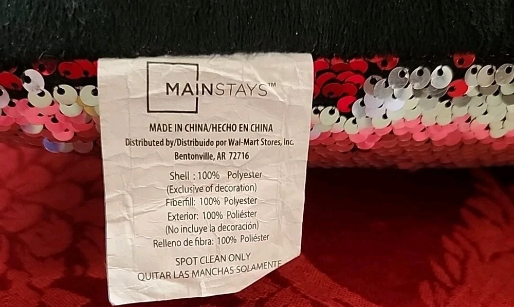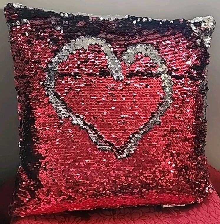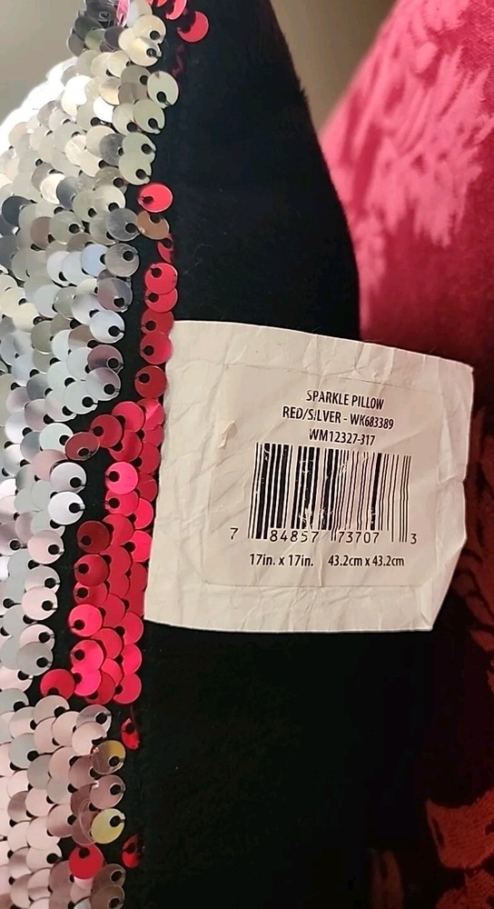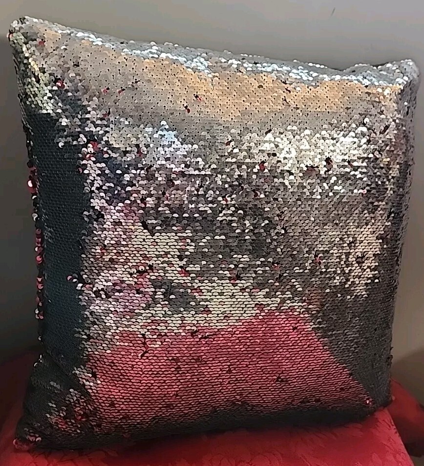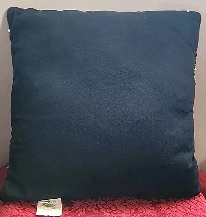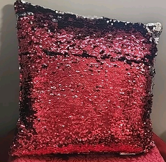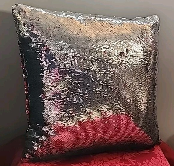 Mainstays Sparkle Pillow Red/Silver Sequins Reversible side Black Back Polyester Measures approximately 17"×17" Good used condition. Has signs of use as would be expected in a pre-owned item. Not all the Sequins flip to the other side. See photos for more information. Item in photos is the item you will receive.