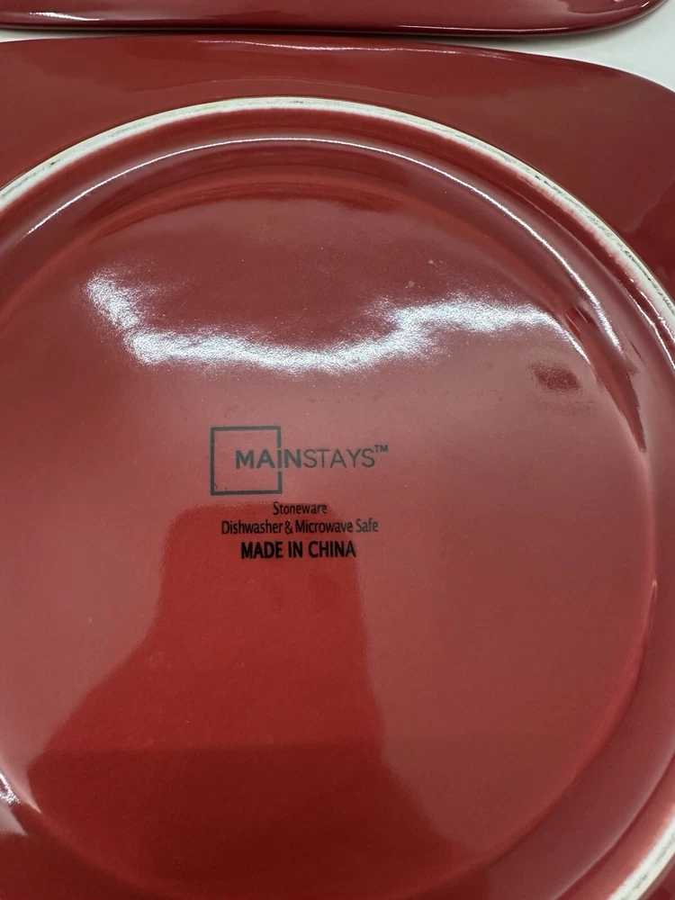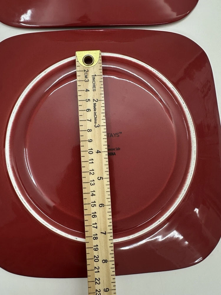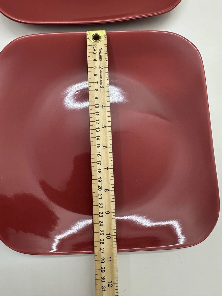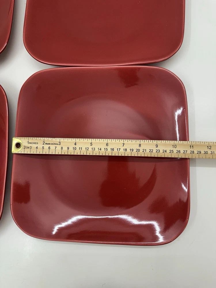 Mainstays Stoneware Plates Set of 4 Red Sedona Big Square Dinner Plates **chip on side of one, little nick on the bottom of another, some scratches and wear** Open to offers :) Measurements in photos, request for additional. *We recommend you wash your item when you receive it. We wash what we can (some clothing must be dry cleaned or professionally cleaned). Looking to bundle? First item you pay original shipping and every item after is $2.99. Five or more items- original shipping plus $1.99 per item. Ten or more items- original shipping plus $0.99 per item.