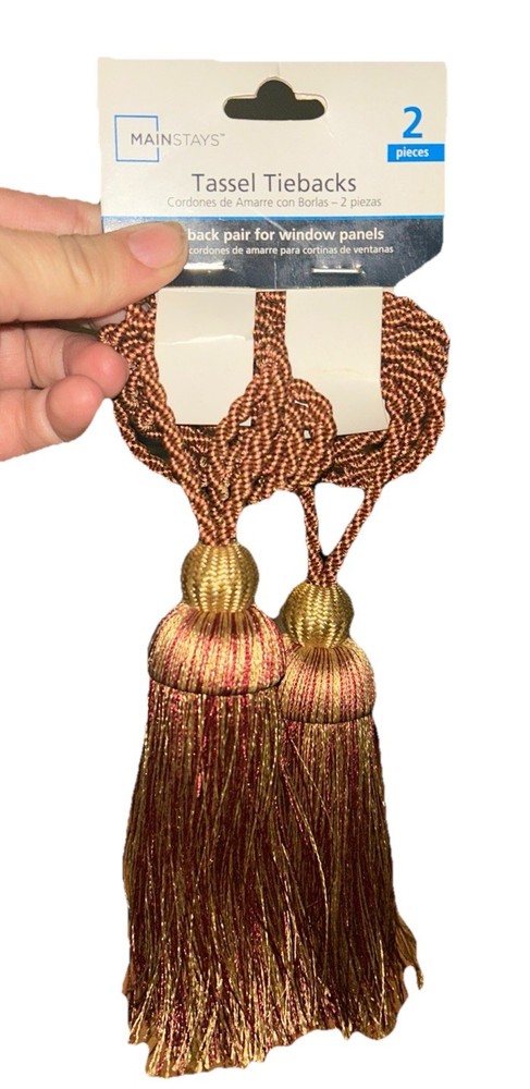 Elevate your home decor with the Mainstays Tassel Drapery Tie-Backs, a traditional addition that brings a touch of elegance to any curtain. This set includes two tie-backs, each featuring a stunning gold and wine color combination that complements a variety of interior styles. Crafted in India, these tie-backs are designed for durability and ease of use, ensuring your curtains are held back with both function and fashion. Ideal for those who appreciate a blend of sophistication and practicality, these tie-backs are made for curtains needing a stylish touch. The pack size provides a convenient set of two, perfect for coordinating multiple windows or for having spares on hand. With the included items, achieving a polished look for your window treatments is both simple and stylish.