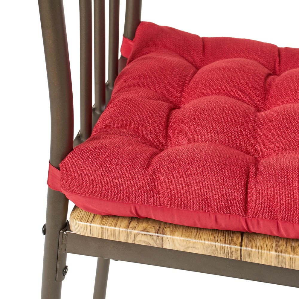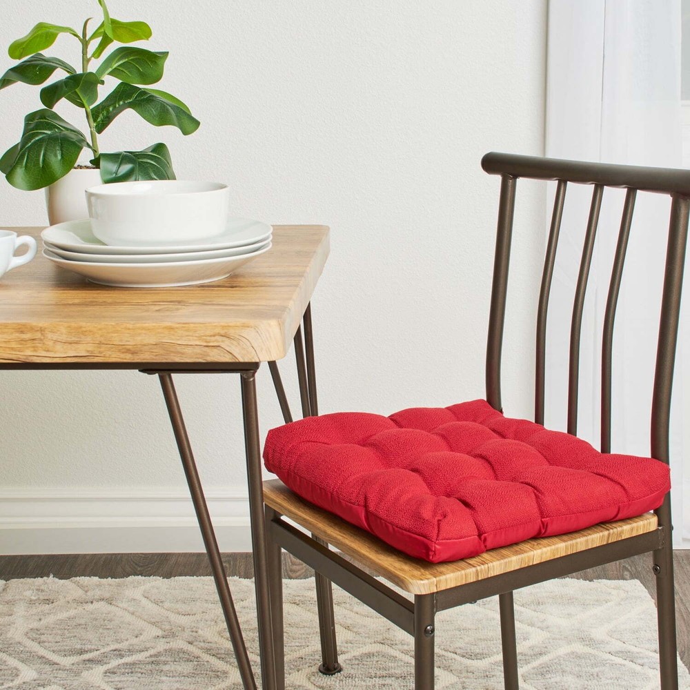 This is the perfect way to make almost any dining or kitchen chair more comfortable for longer, more enjoyable meals and get-togethers. Each cushion features textured fabric for a casual charm and is button-tufted to provide that classic look that welcomes your family members, friends, neighbors, and visitors and invites them to take a seat and relax. These cushions are crafted of 100% polyester with polyester fill for a long life of comfy use. Each cushion attaches quickly and easily to virtually any chair with Velcro loops that hold the cushion securely in place. Fits standard dining table and kitchen chairs Each cushion dimensions: 15.5" x 16" x 2.95" Each cushion dimensions: 15.5" x 16" x 2.95" To maintain color, we recommend spot cleaning only as necessary and allowing to air dry Each cushion weight: 1.17 lbs. Textured fabric for a casual charm Tucked finish for a classic look that welcomes your family members, friends, neighbors, and visitors and invites them to take a seat and relax Velcro loops attach quickly and easily and hold the cushion securely in place To maintain color, we recommend spot cleaning only as necessary and allowing to air dry