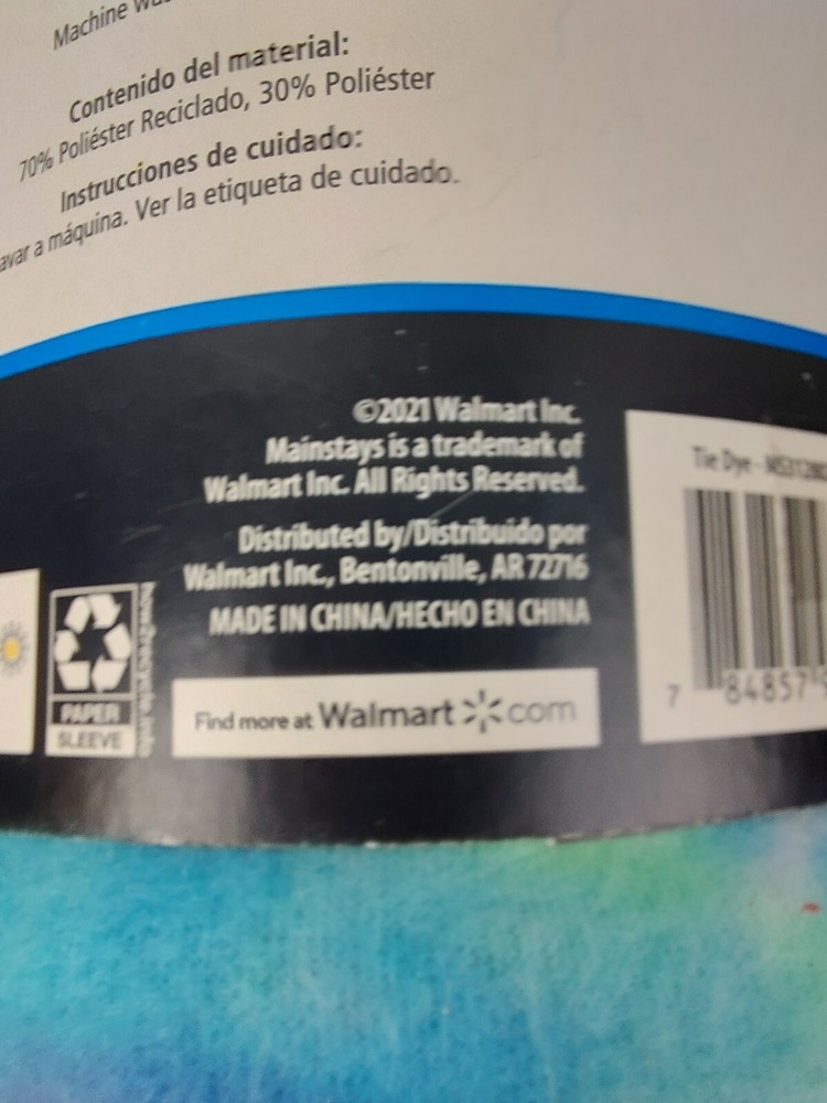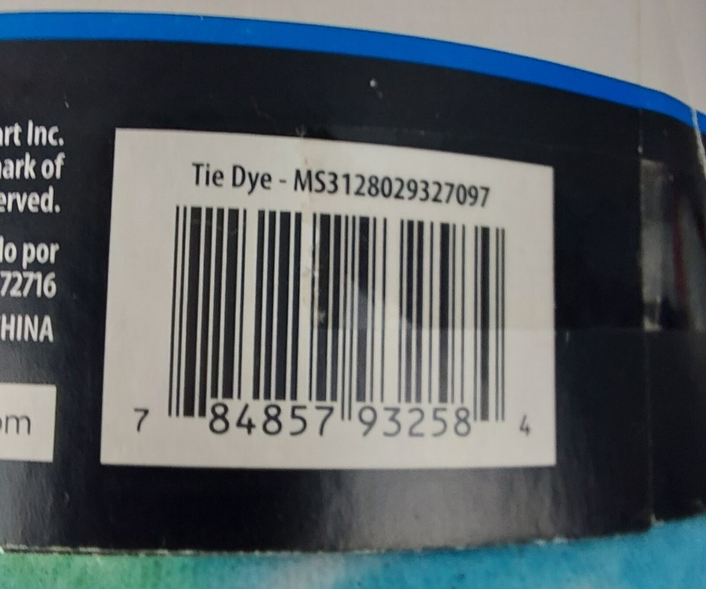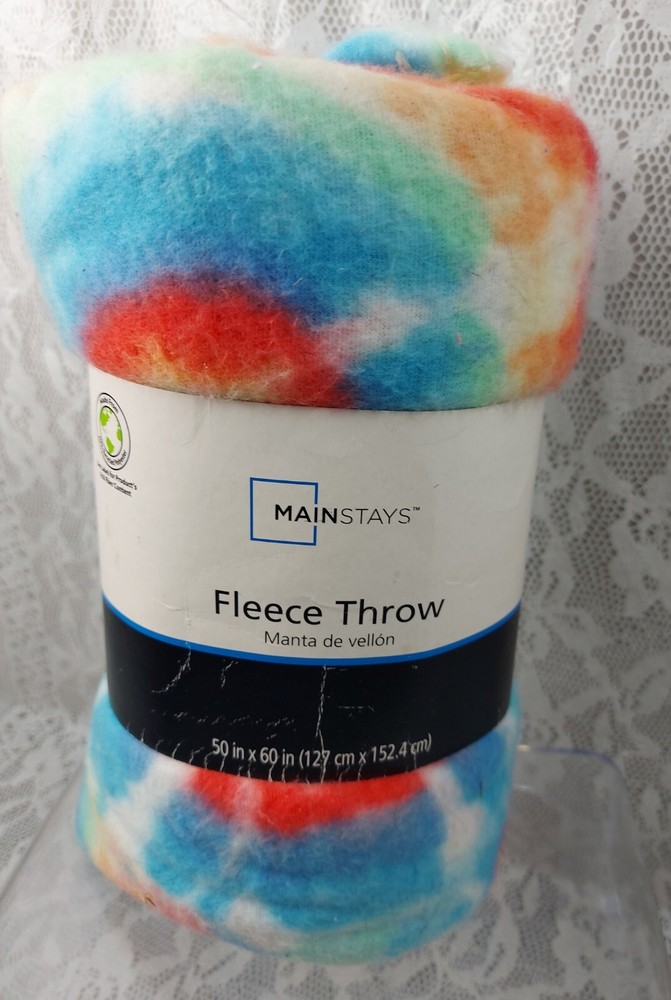 Mainstays Fleece Tie Dye Throw Blanket, Measures 50 inches by 60 inches. New. There is some wear to the store paper labeling around it.