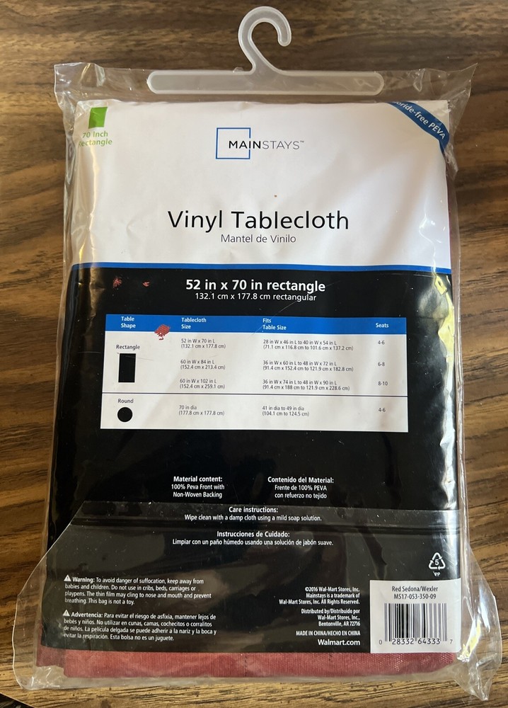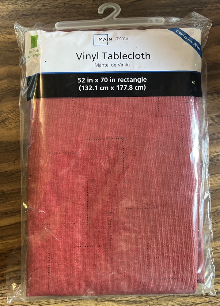 New in original packaging Mainstay Peva Vinyl Tablecloth - 70 inch rectangle. Red Sedona/Wexler This Mainstays Peva vinyl tablecloth in red sedona is perfect for any occasion. Measuring 52 inches in width and 70 inches in length, it is made of 100% Peva front and non-woven backing, ensuring that it is waterproof and stain-resistant. The tablecloth is designed in a traditional style with a solid pattern and rectangular shape, making it a great addition to any room. In addition to being functional, this tablecloth also adds a touch of style to your home decor. It is easy to clean with just a damp sponge and mild soap solution, and it is chloride-free. Whether you are hosting a holiday dinner or a casual get-together with friends, this tablecloth is sure to impress.