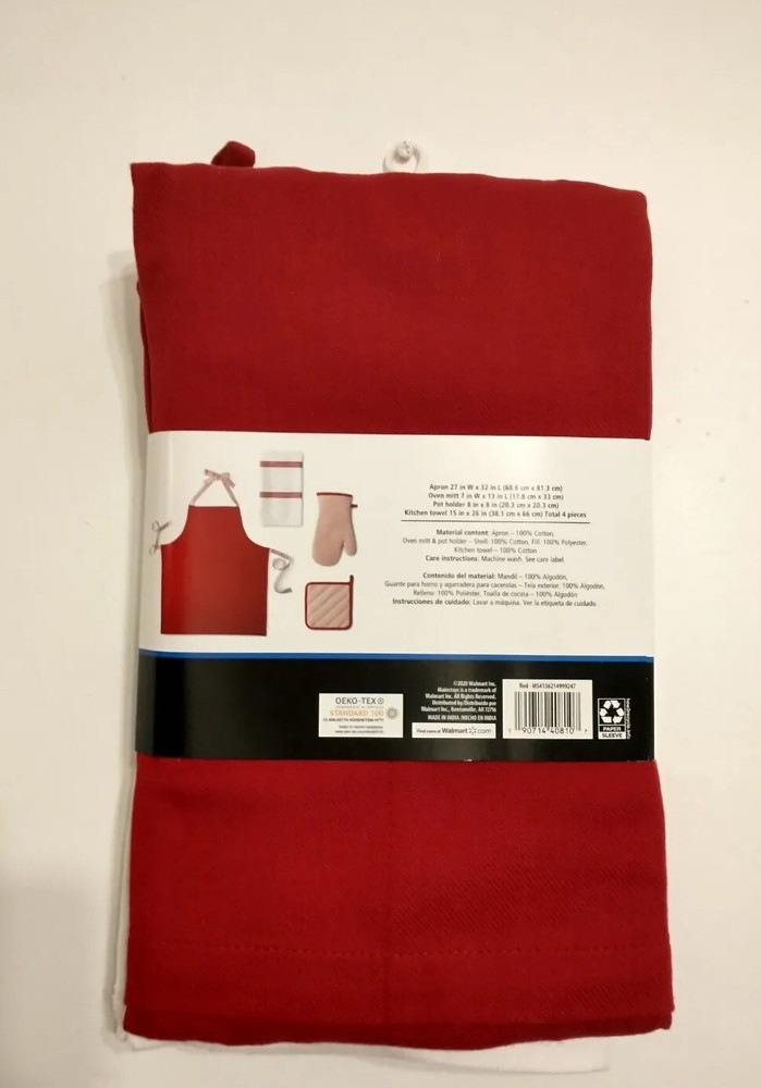 Add a touch of country charm to your kitchen with this Mainstays 4-piece accessory set. The set includes a red apron, kitchen towel, oven glove, and pot holder, all made of 100% cotton and machine washable up to 140°F. The solid or stripped pattern and French country style make this set a perfect addition to any home decor. Ideal for Mother's Day, Christmas, Winter, New Home, International Women's Day, Multipurpose, or Valentine's Day, this set is a great gift for any occasion. The Martha Stewart model and warm homemade goodies character family add a personal touch to this charming set.