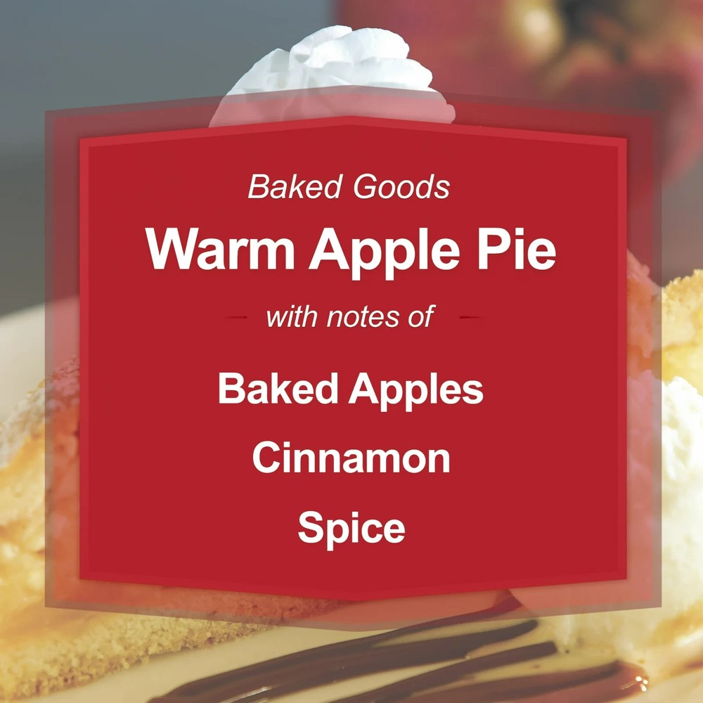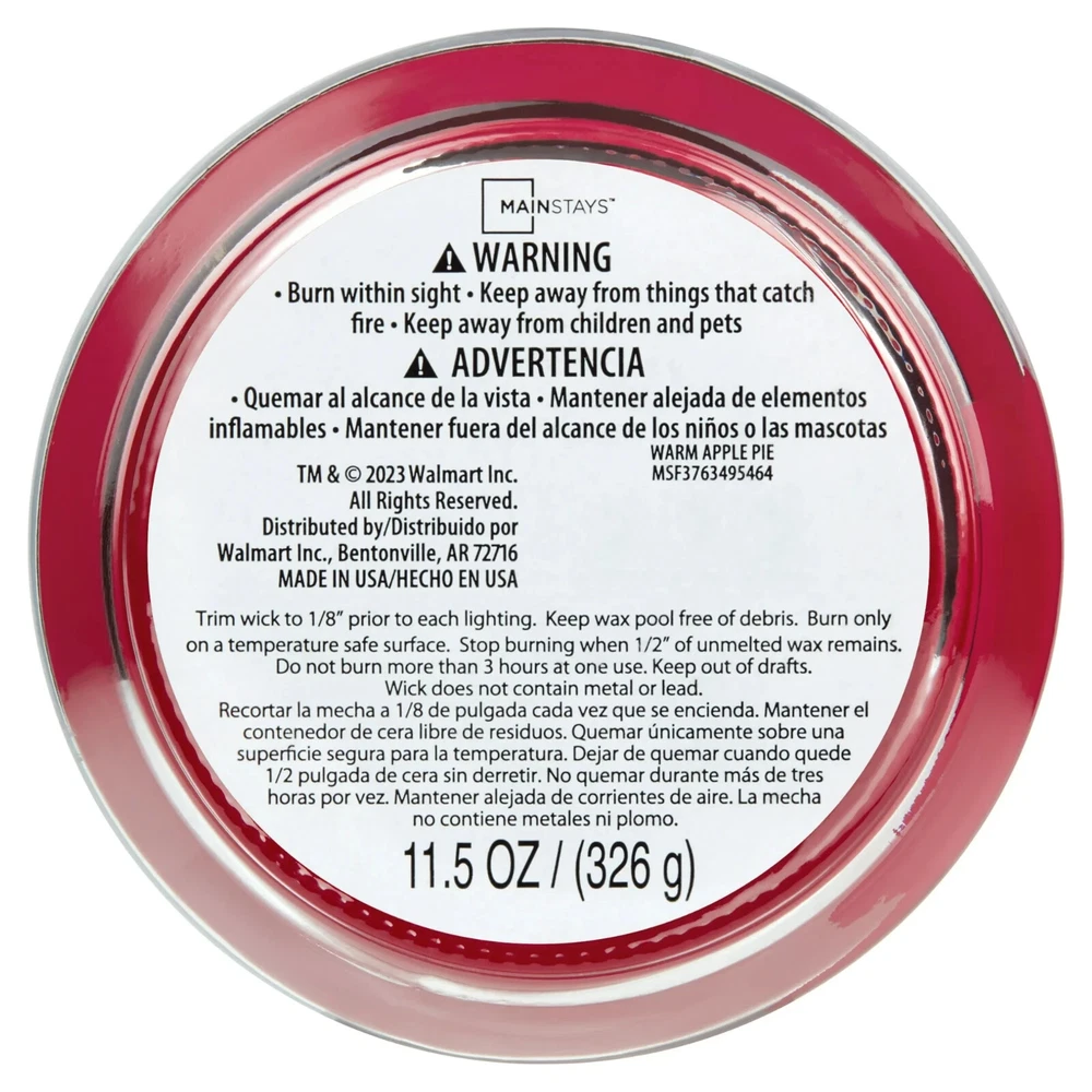 Mainstays Warm Apple Pie Scented 3-Wick Glass Jar Candle, 11.5oz The joy of baking is captured in this all-time favorite treat. Mainstays Warm Apple Pie fragrance, contains orchard apples, red pear and orange zest, embraced at the heart with cranberry, nutmeg, clove and allspice. Cinnamon stick, graham cracker crust and vanilla add a touch of decadence at the bottom. This is in the GOURMAND category. Premium-grade paraffin wax blended with premium quality ingredients to create distinctive true-to-life scents Clear glass container complements virtually any room décor and provides just the right amount of illumination with a 3-wick design Pleasant scent for a relaxing environment without becoming overpowering. Helps improve concentration, mood, and positive thinking Product measures 4.12" D x 3.2" H Product weighs 1.37 lbs