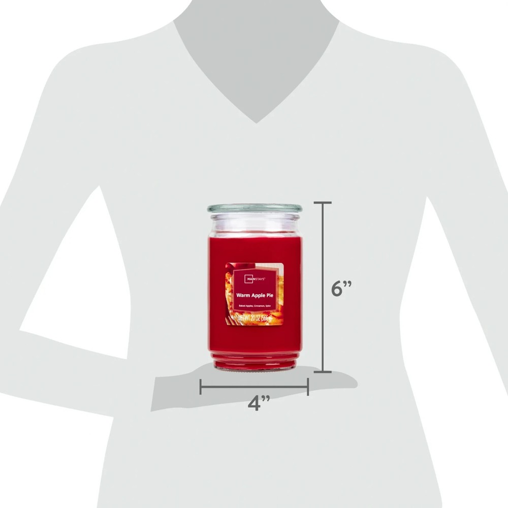 Mainstays Warm Apple Pie Scented Single-Wick Large Glass Jar Candle, 20 oz Orchard apples, red pear, and orange zest are embraced at the heart with cranberry, nutmeg, clove, and allspice. Cinnamon stick, graham cracker crust, and vanilla add a touch of decadence at the bottom Complements virtually any room decor 20 oz. single-wick candle burns for approximately 100-120 hours Features a decorative beveled edge glass vessel Mainstays single-wick scented candles are highly fragranced, and provide a clean and even burn that will fill your home with beautiful and enticing aromas Our candles are made from high quality, non-toxic, clean-burning wax that is specifically developed to hold optimal fragrance loads Our Mainstays 20oz candle is available in a variety of scents