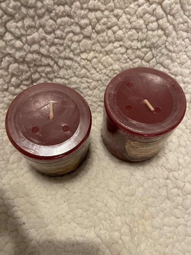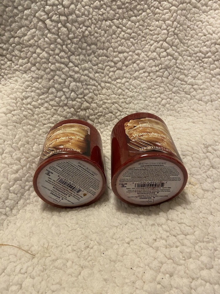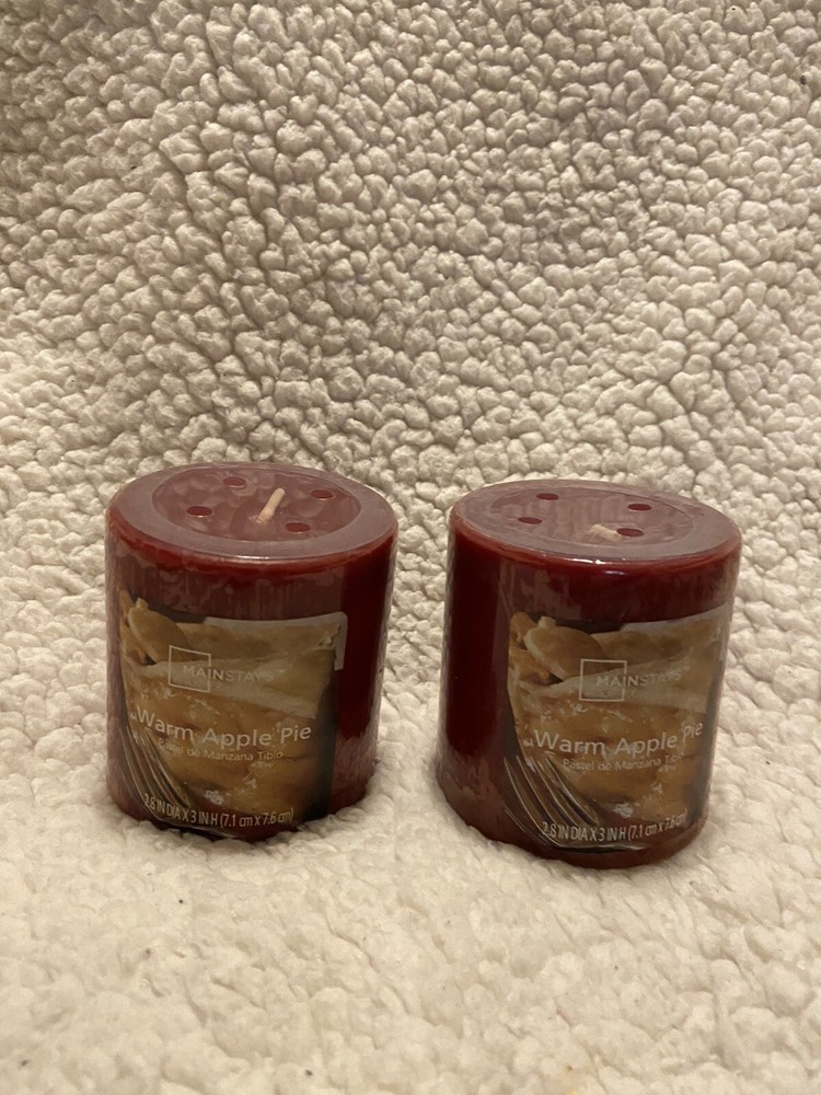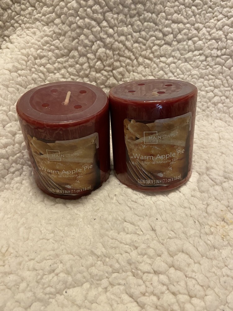 Mainstays Warm Apple Pie candles New. Condition is New. Shipped with USPS Priority Mail. The candles are 2 7/8 height and the top is 2 5/8 wide.