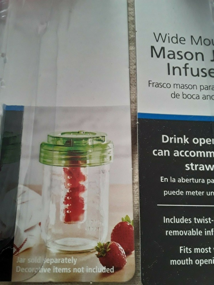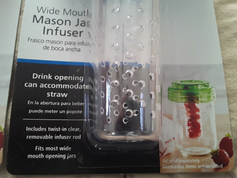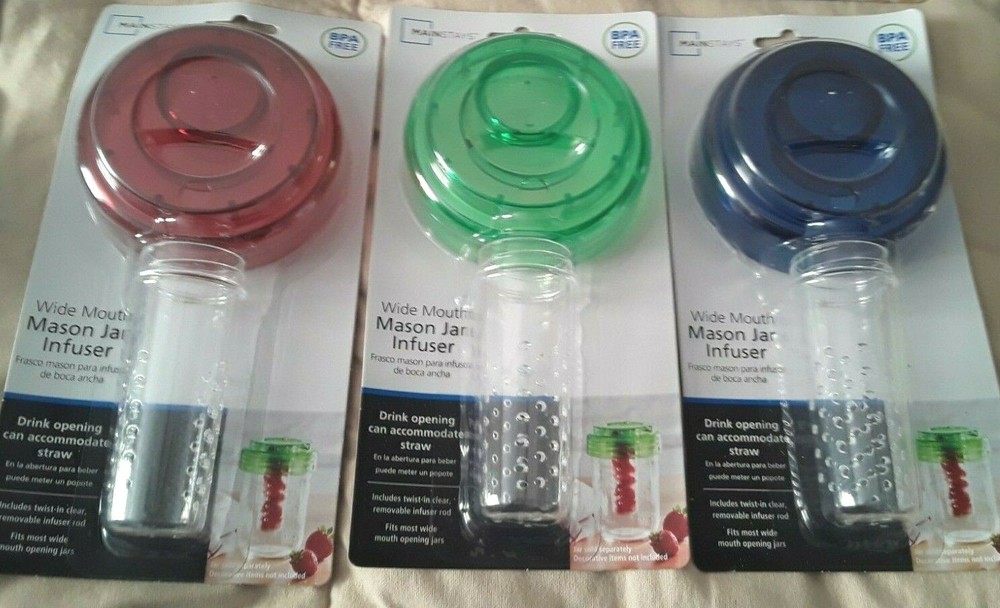 Mainstays Wide Mouth Mason Jar Lid And Infuser Lot #2 Red Blue Green BPA Free Straw Opening lot of 3 perfect for spring/summer holidays, party favors, weddings and gift giving lid 3.66" D x 1.34" H infuser 1.45" D x 3.66" H