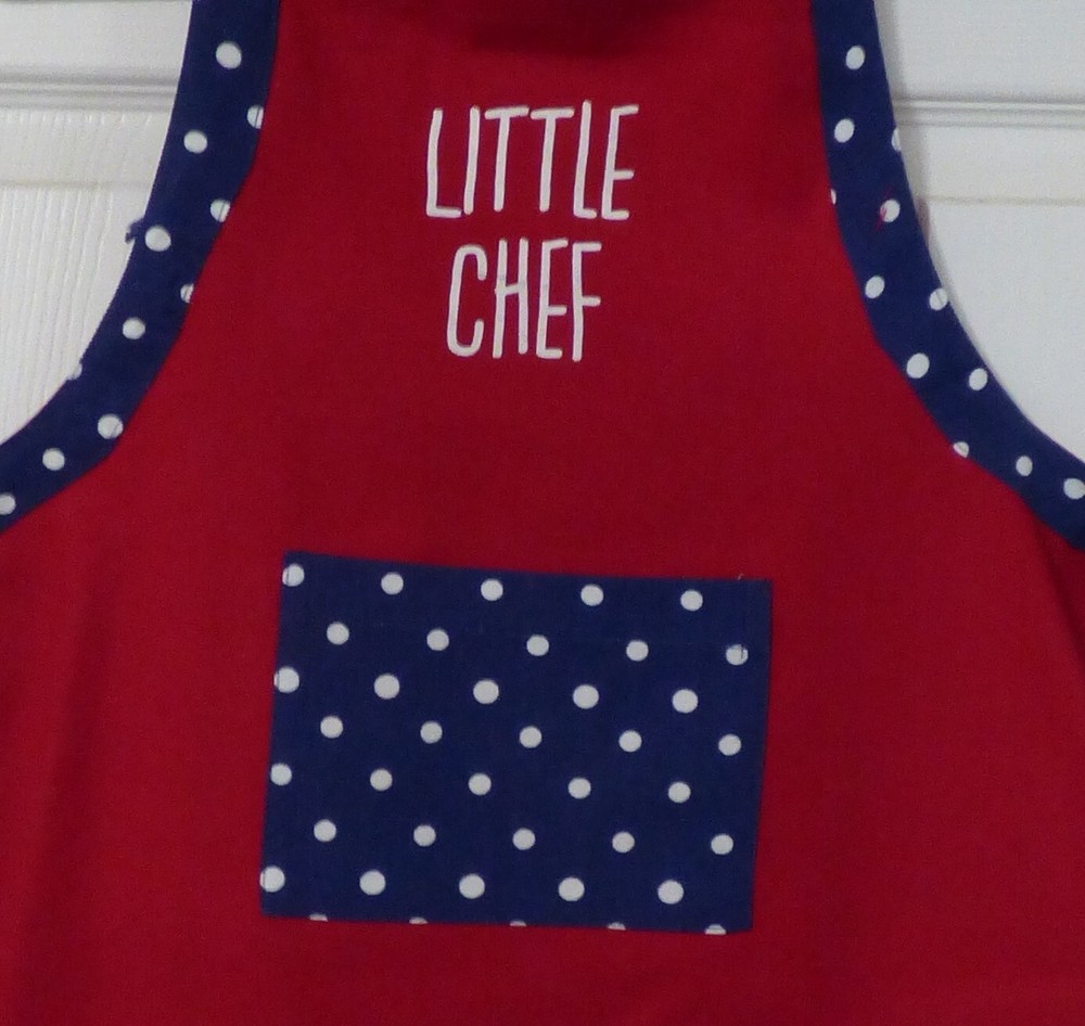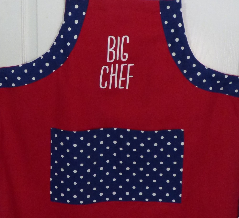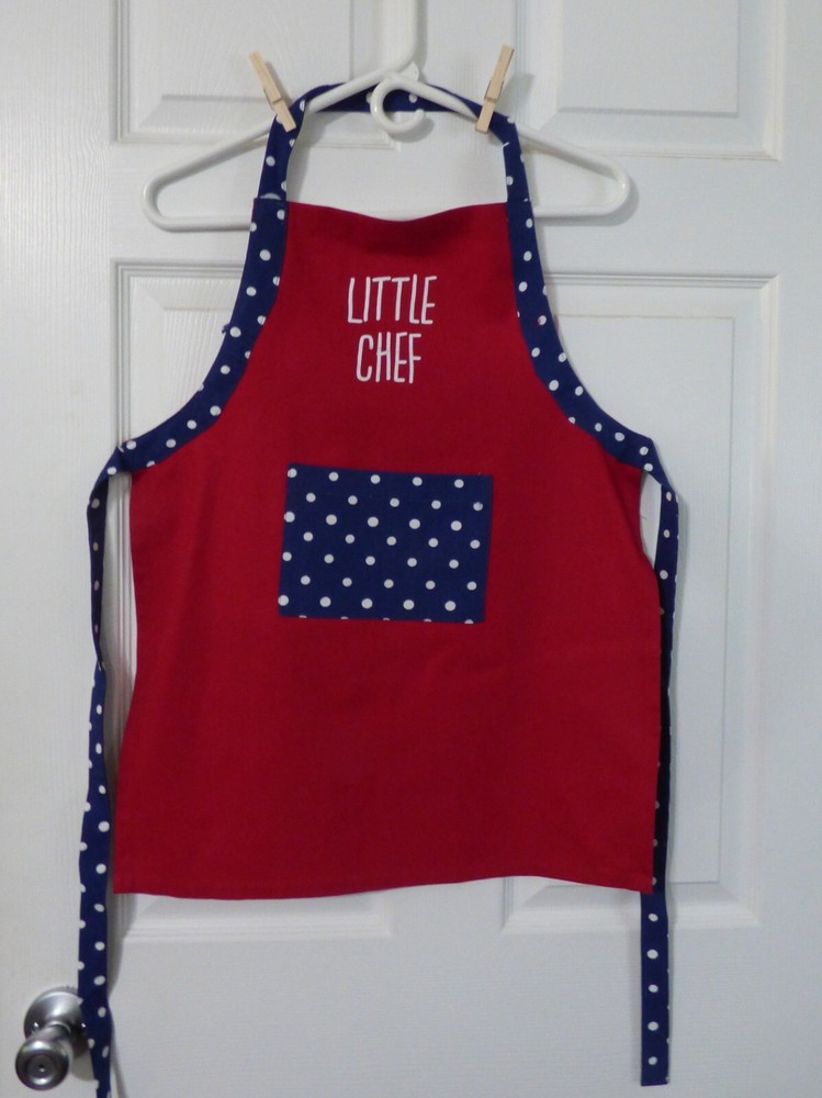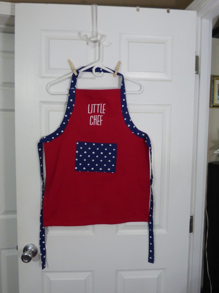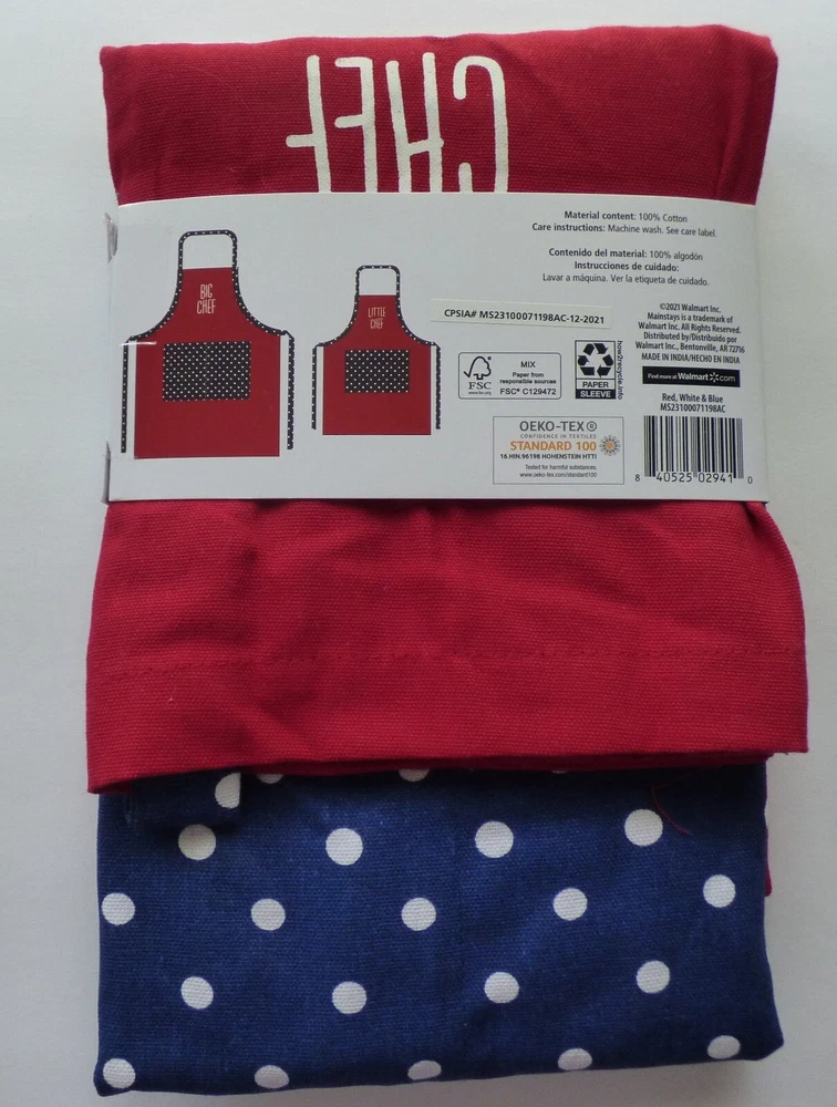 MainstaysAdjustable Parent & Me Apron Set of 2 For Baking Big & Little Chef Big Chef-- AdultSize 27 Wide X 34 Long From The Top Of The Bib. The Neck Loop and The ApronStrings Are The Same Cloth Measuring 126 Inches Long, Allowing A Custom Fit. LittleChef --Child Size 19 Wide X 24 Long From Top Of The Bib. The Neck Loop18 Inches Long With A 5 inch Velcro To Allow For A Custom Fit. The ApronStrings Each Measure 23 Inches Long. Each Apron Has A Loop InThe Back To Allow For Hanging up. Adult Apron Has 2 Pockets And The Child Has 1Pocket. Vivid Solid Red Apron Accented By Solid Blue With White Dots Ties and AMatching Pocket. Both Aprons Are MadeFrom 100 % Cotton. Machine Washable (see Label). Great Gift For The Adult& Child Who Are Starting To Cook Together or for Those That Have LovedCooking Together Already. Also Great To Use While Doing Crafts. ColorOf The Item May Not Be An Exact Match Due To Lighting, Varies By Camera,Flash Or Computer Monitor And Phone Screens. You Will Get New In Package. The ItemShown Is One I Opened To Take Pictures Smoke Free Environment