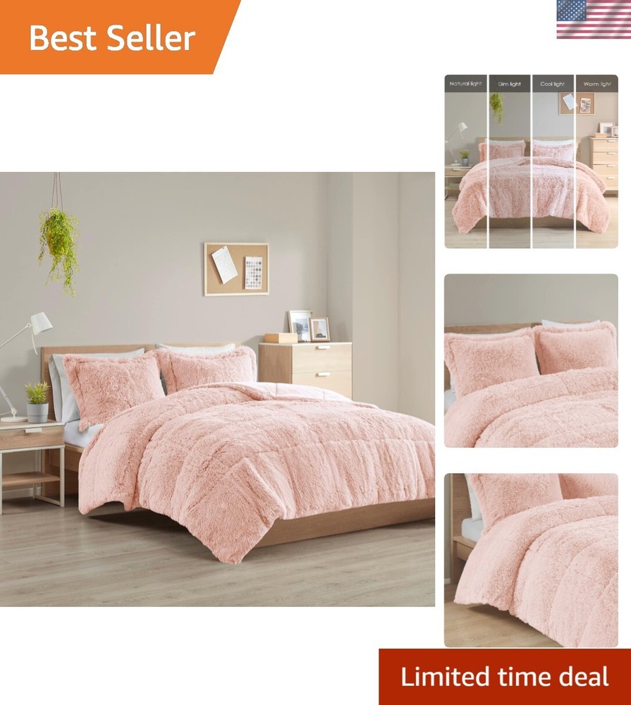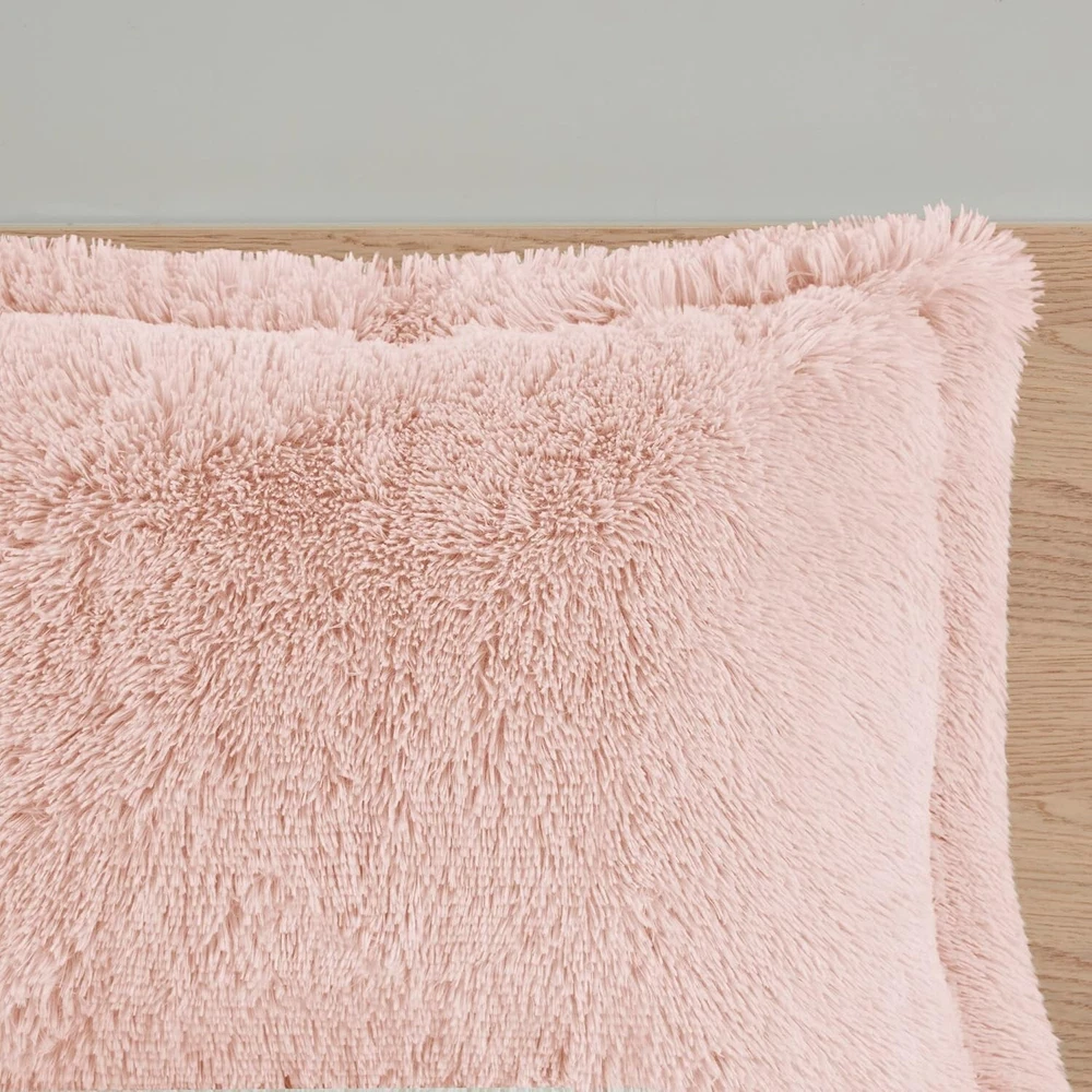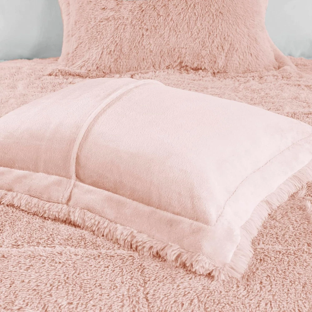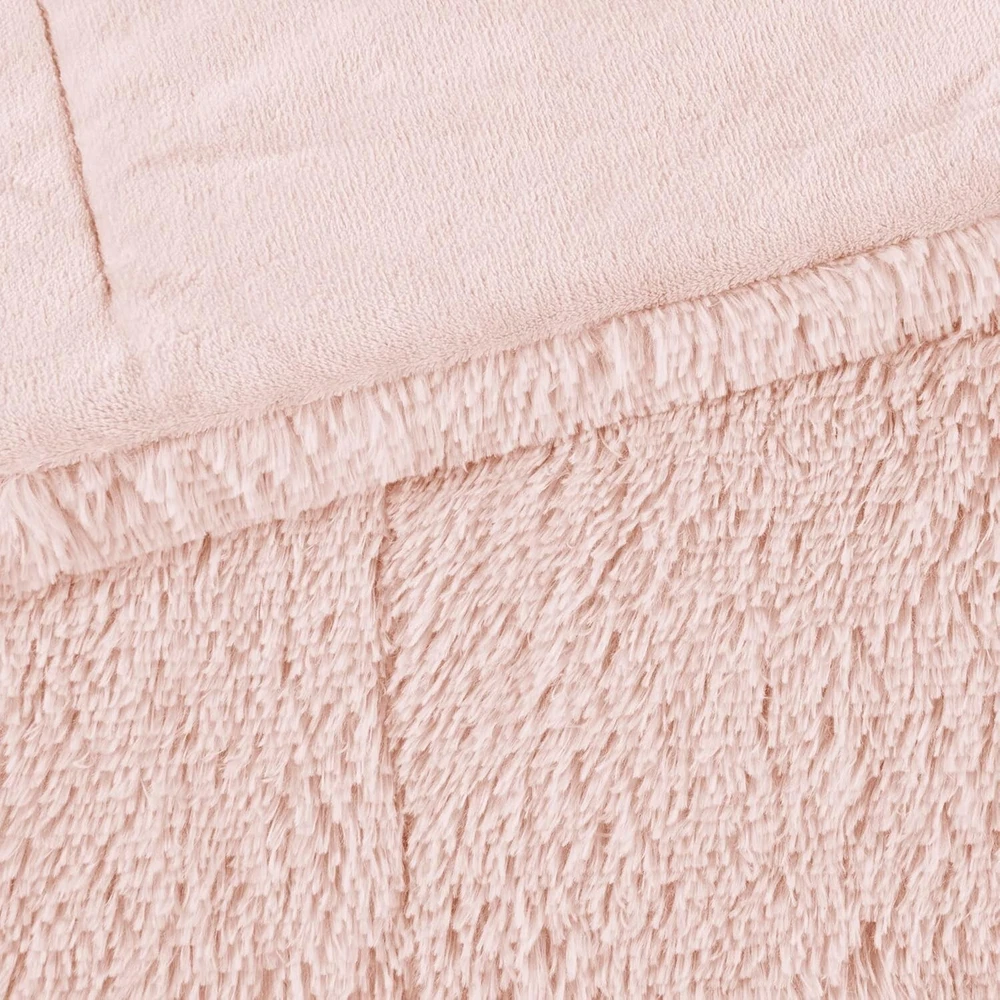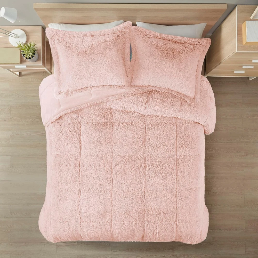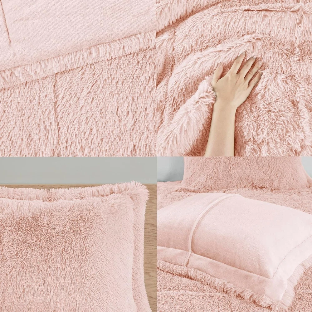 Malea Shaggy Comforter Set, Long Faux Fur Cozy Down Alternative, Modern Casual Ultra Soft All Season Fluffy Bedding with Matching Sham, Full/Queen, Blush 3 Piece Faux Fur STYLE - Modern, casual and cozy comforter set to upgrade your bedroom with a luxe bedding and a hint of glam. Featuring ultra cozy long faux fur comforter that reverses into soft plush with end-to-end box quilting and comes with matching shams fuzzy shams. MATERIAL - Feel the gentle long faux fur comforter set which offers ultra soft material to give you comfort and warmth. The comforter features double sided box quilting to fasten this fluffy comforter set. The brushed microfiber solid reverse will make you feel extra cozy giving you a better quality rest every night. Oeko-Tex Certified, includes no harmful substances or chemicals ALL SEASON - Our all season comforter set offers a soft plush fabric reverse. bedding collection aims to offer you a better quality sleeping experience. Our cozy bedspread will give you the right amount of warmth and comfort no matter the season WHAT'S INSIDE? - Full/Queen Comforter: 90"W x 90"L, Matching Standard Sham: 20"W x 26"L + 2"D (2) CARE: Machine wash cold on gentle cycle, tumble dry on low heat, and do not bleach to keep the color vibrant. Commercial size washer is recommended. Minor shedding is expected with faux fur material and should subside after 3-4 washes The Malea Shaggy Long Faux Fur Comforter Mini Set brings a soft contemporary update to your bedroom. The comforter and shams feature stylish shaggy faux fur that creates a soft fluffy texture and modern look. The solid plush reverse adds a soft and warm touch. Items in the set may come in a rolled or compressed packaging, which will need to be fluffed up or steam ironed before use to remove wrinkles.