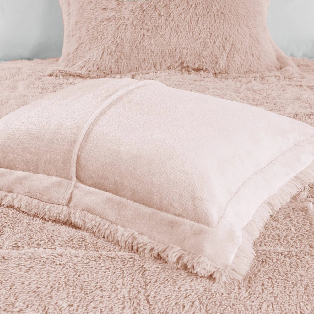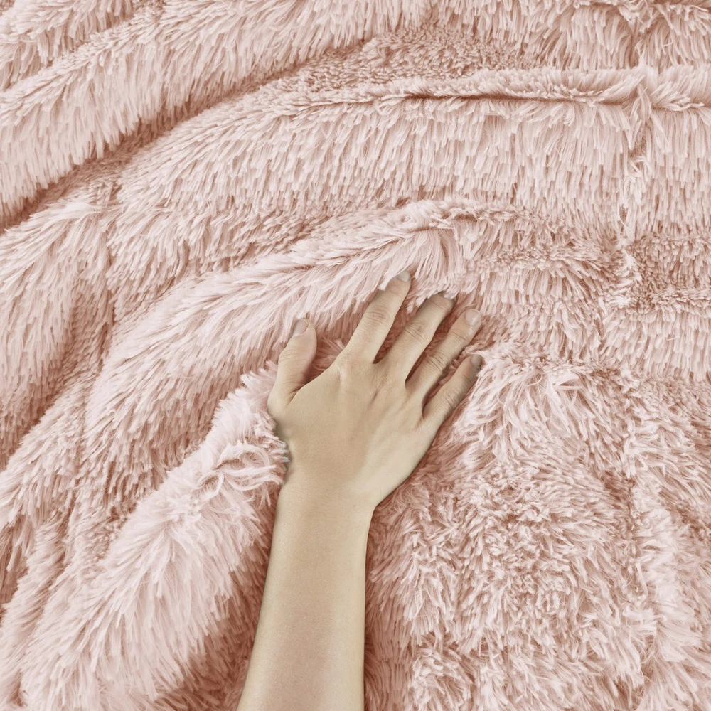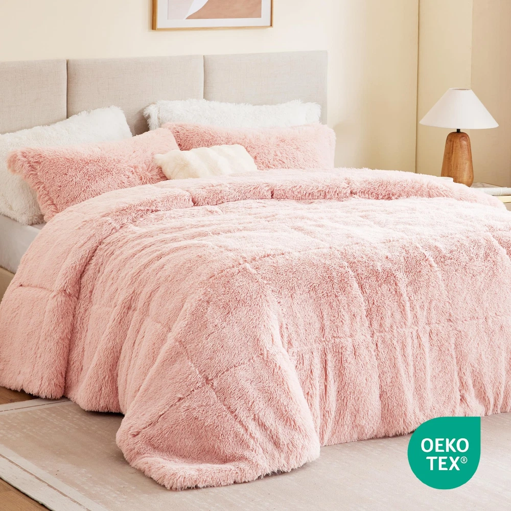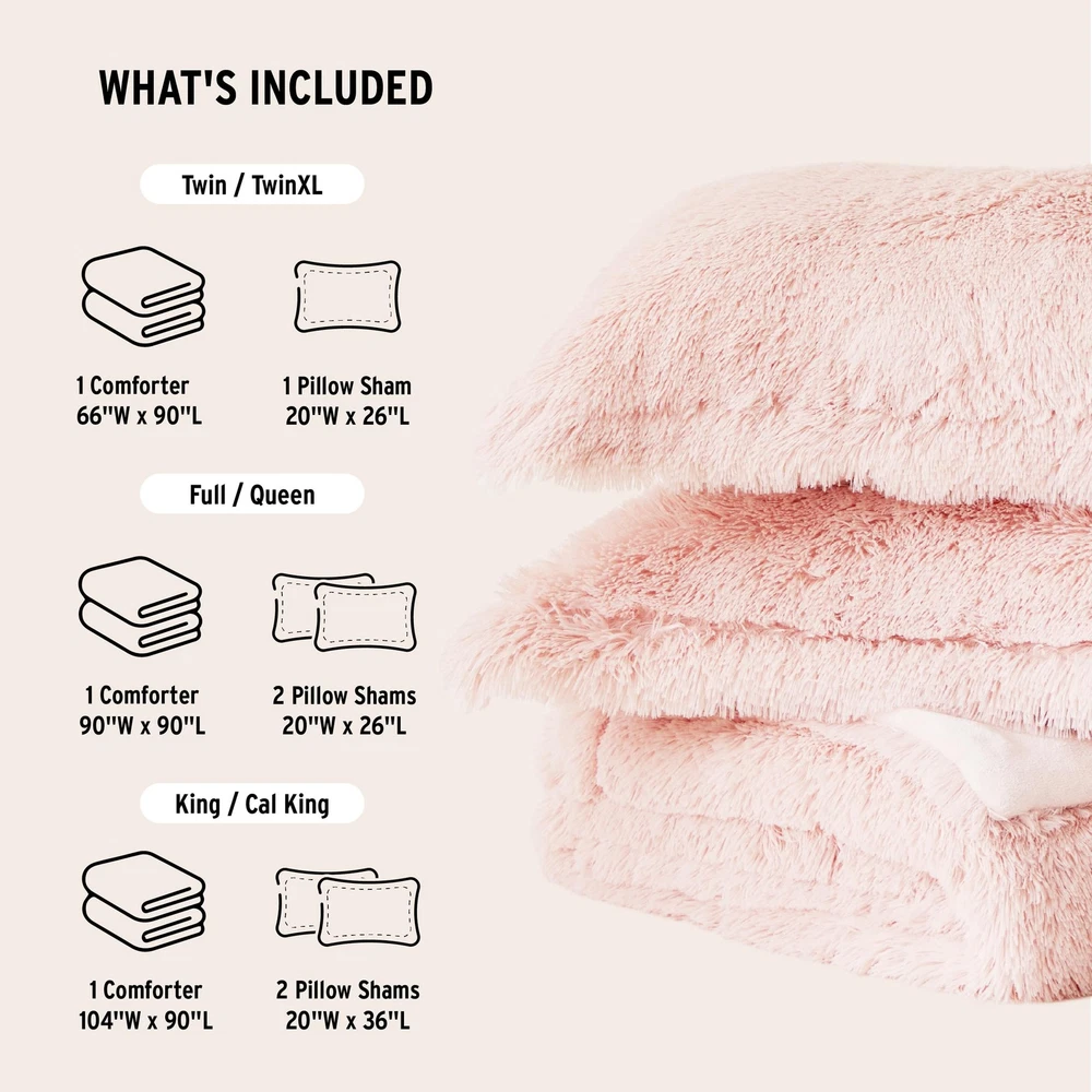 STYLE - Modern, casual and cozy comforter set to upgrade your bedroom with a luxe bedding and a hint of glam. Featuring ultra cozy long faux fur comforter that reverses into soft plush with end-to-end box quilting and comes with matching shams fuzzy shams. MATERIAL - Feel the gentle long faux fur comforter set which offers ultra soft material to give you comfort and warmth. The comforter features double sided box quilting to fasten this fluffy comforter set. The brushed microfiber solid reverse will make you feel extra cozy giving you a better quality rest every night. Oeko-Tex Certified, includes no harmful substances or chemicals ALL SEASON - Our all season comforter set offers a soft plush fabric reverse. bedding collection aims to offer you a better quality sleeping experience. Our cozy bedspread will give you the right amount of warmth and comfort no matter the season WHAT'S INSIDE? - Full/Queen Comforter: 90"W x 90"L, Matching Standard Sham: 20"W x 26"L + 2"D (2) CARE: Machine wash cold on gentle cycle, tumble dry on low heat, and do not bleach to keep the color vibrant. Commercial size washer is recommended. Minor shedding is expected with faux fur material and should subside after 3-4 washes