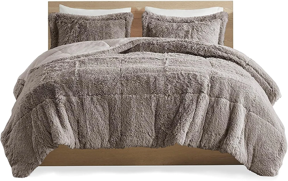 Faux Fur STYLE - Modern, casual and cozy comforter set to upgrade your bedroom with a luxe bedding and a hint of glam. Featuring ultra cozy long faux fur comforter that reverses into soft plush with end-to-end box quilting and comes with matching shams fuzzy shams. MATERIAL - Feel the gentle long faux fur comforter set which offers ultra soft material to give you comfort and warmth. The comforter features double sided box quilting to fasten this fluffy comforter set. The brushed microfiber solid reverse will make you feel extra cozy giving you a better quality rest every night. Oeko-Tex Certified, includes no harmful substances or chemicals ALL SEASON - Our all season comforter set offers a soft plush fabric reverse. Intelligent Design bedding collection aims to offer you a better quality sleeping experience. Our cozy bedspread will give you the right amount of warmth and comfort no matter the season WHAT'S INSIDE? - King/Cal King Comforter: 104"W x 90"L, Matching King Sham: 20"W x 36"L + 2"D (2) CARE: Machine wash cold on gentle cycle, tumble dry on low heat, and do not bleach to keep the color vibrant. Commercial size washer is recommended. Minor shedding is expected with faux fur material and should subside after 3-4 washes The Intelligent Design Malea Shaggy Long Faux Fur Comforter Mini Set brings a soft contemporary update to your bedroom. The comforter and shams feature stylish shaggy faux fur that creates a soft fluffy texture and modern look. The solid plush reverse adds a soft and warm touch. Items in the set may come in a rolled or compressed packaging, which will need to be fluffed up or steam ironed before use to remove wrinkles.