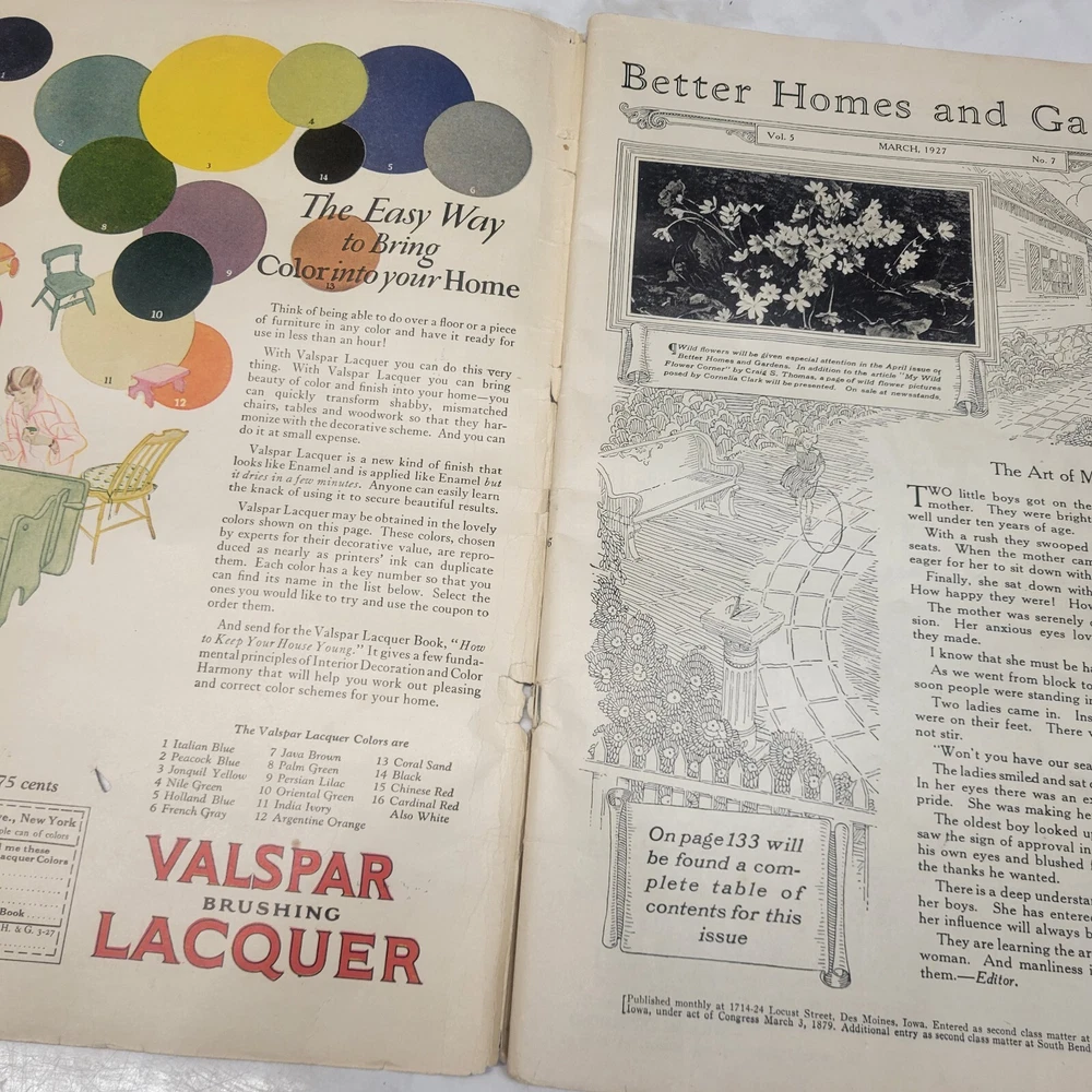 This March 1927 issue of Better Homes and Gardens Magazine is a treasure trove of information on a variety of subjects. It features many contributors and is illustrated throughout. Whether you're interested in home and garden topics or just enjoy reading magazines from the past, this publication is sure to delight. The magazine was published by Better Homes and Gardens in the United States and has a publication frequency of monthly. It is written in English. 12 x 8.25 Wear is consistent for its age. Please see the pictures