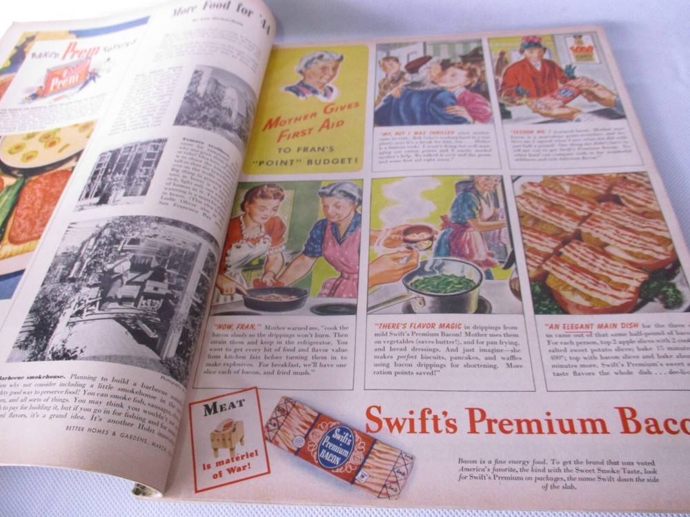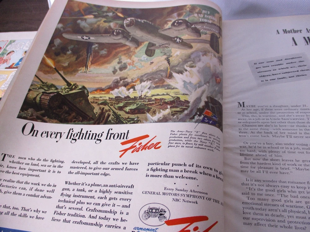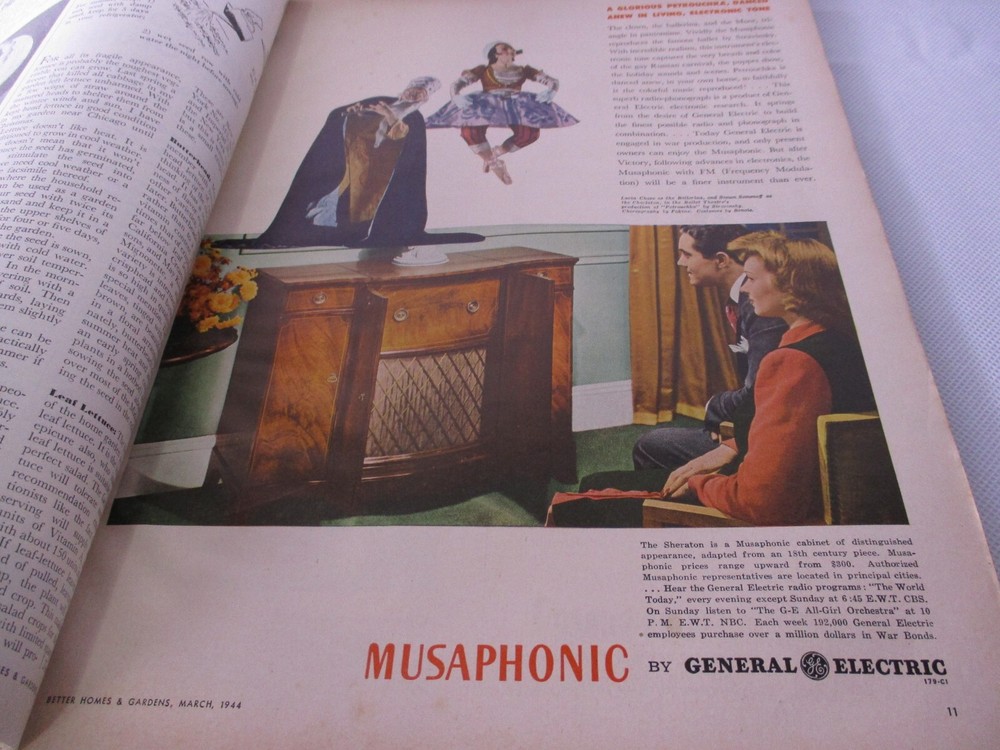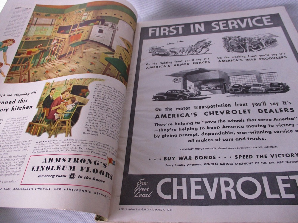 March 1944 WW2 Better Homes & Gardens Magazine Chevrolet, Chesterfields, Zenith, Musaphonic Vintage Ads, solid vintage issue, has some wear from reading and storage, dings on the spine and edge dings, spine is solid and pages are tight, good looking magazine for its age. (50743 Hi! And thanks for looking. Hope I can send something good your way. I pack items with care and work my best to get items to you in the best of condition. I have been collecting for over 30 years and do my best to describe everything as well as possible. If I missed something feel free to ask.