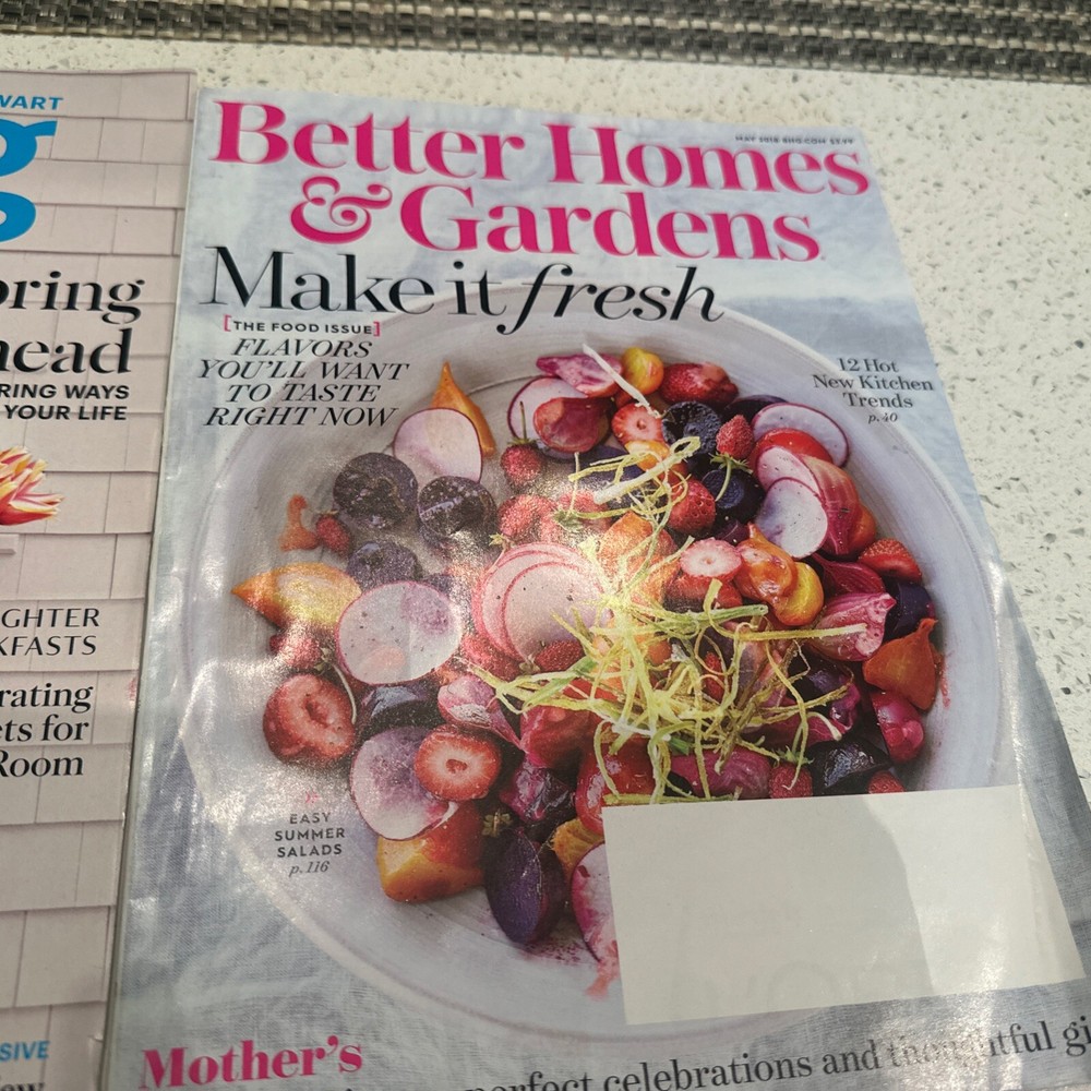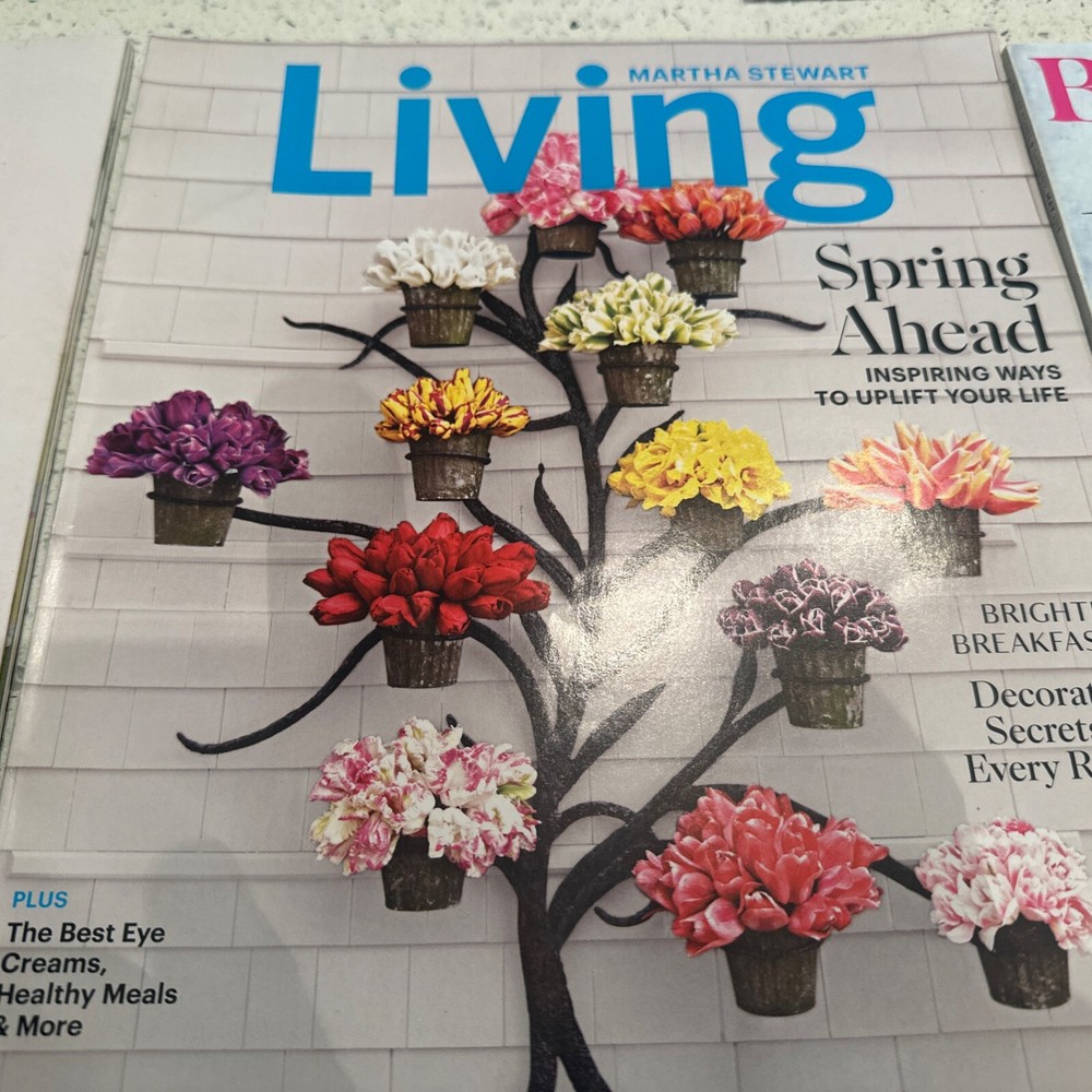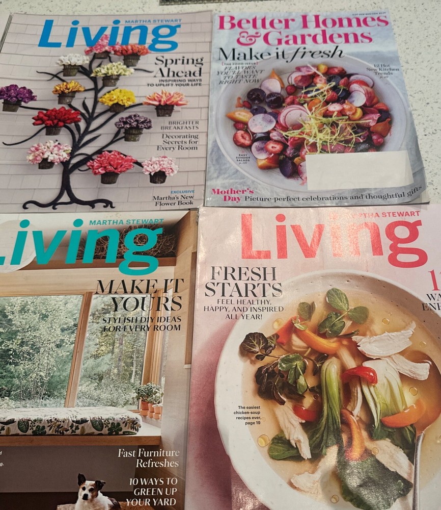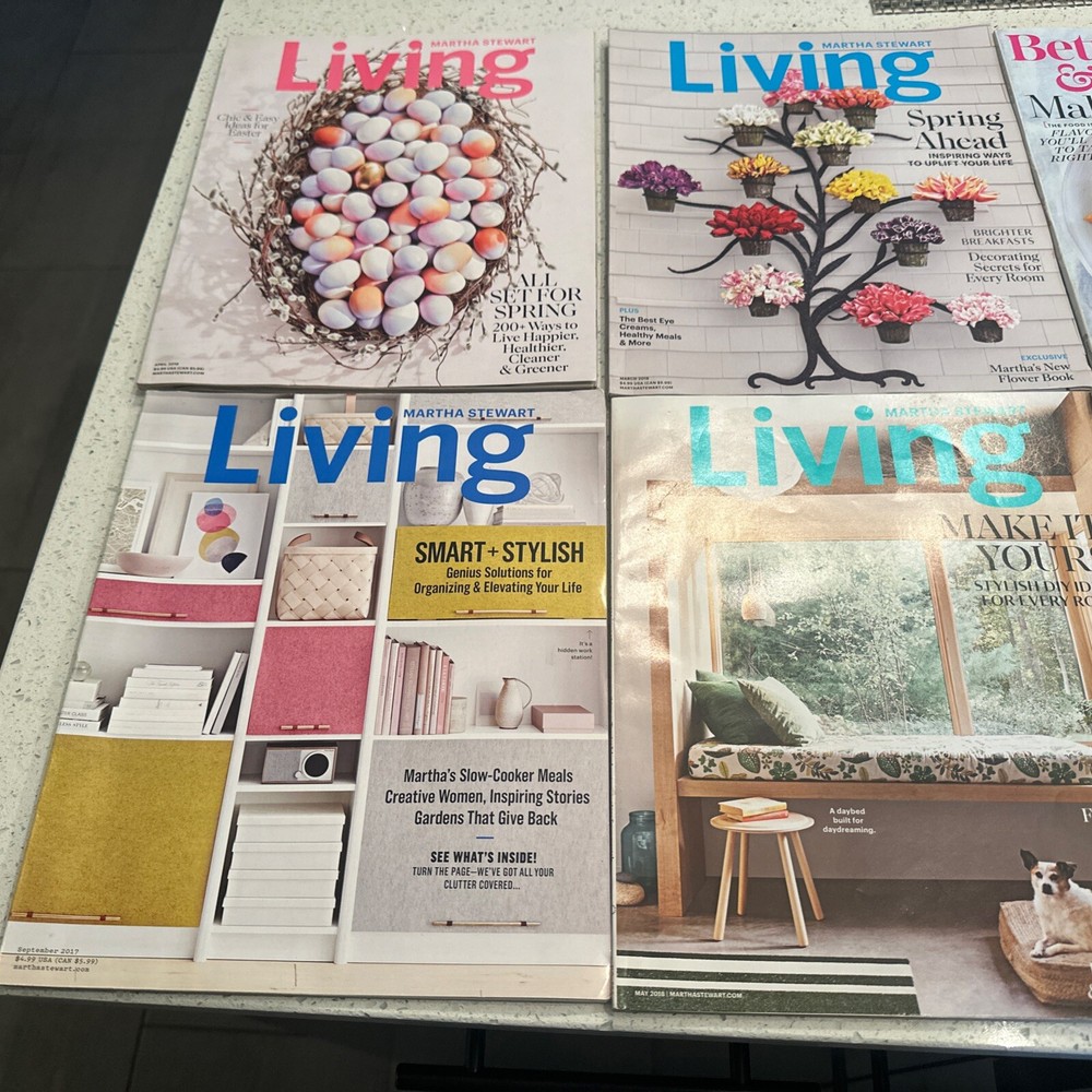 The product is a lot of mostly springtime issues of the Martha Stewart Living magazine, along with a Better Homes spring magazine. Published in 2003 in English, Martha Stewart Living is a monthly magazine featuring illustrations and covers various genres such as home and garden, cooking, architecture, hobbies, crafts, lifestyle, and more. The magazines were manufactured in the United States and offer a wealth of content related to food, drink, antiques, collectibles, holidays, and other springtime topics.