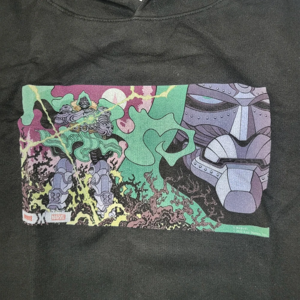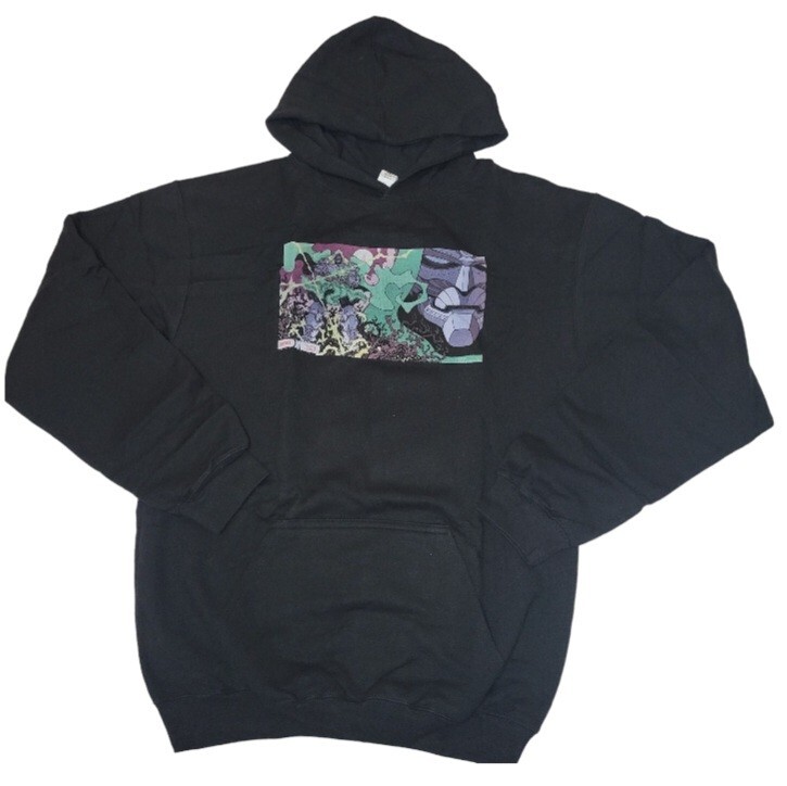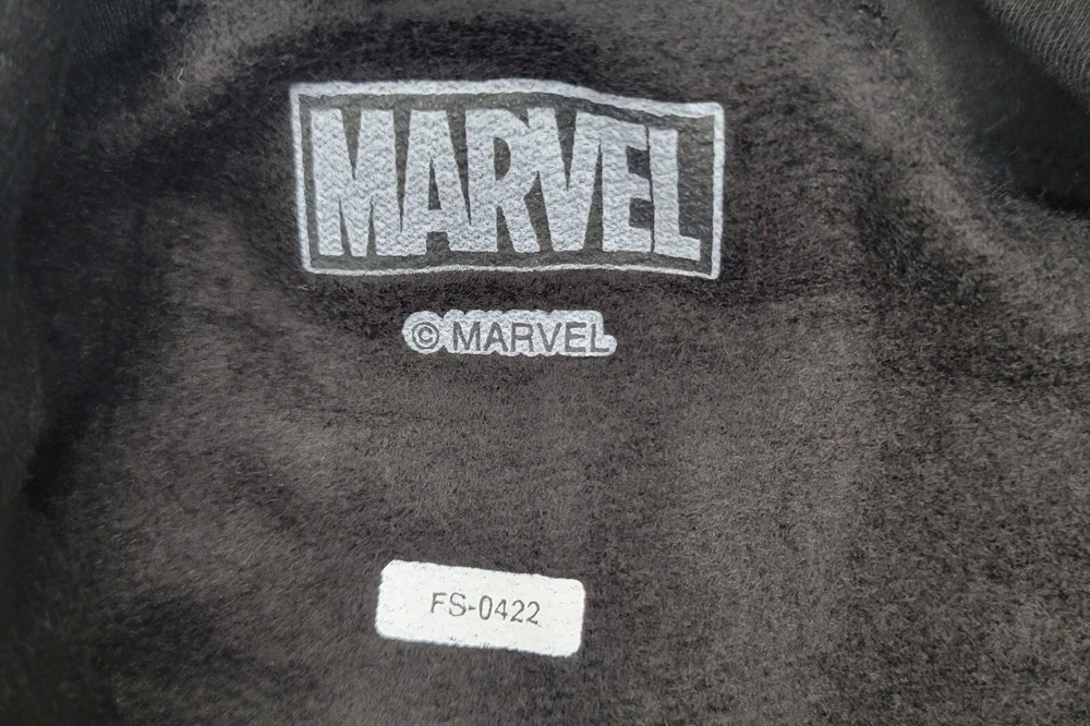 This Marvel hoodie is the perfect addition to your wardrobe! With a high neckline, long sleeves, and a comfortable fit, this sweatshirt is perfect for any season. The black color and solid pattern make it a classic choice, while the graphic print adds a touch of 90s nostalgia. The hooded sweatshirt is made of a blended fabric of polyester and cotton, making it easy to care for with machine washable instructions. This XL hoodie is a regular fit and features a pullover closure. It's a great choice for teens who love to walk and be active during fall, winter, and spring. The Marvel hoodie is not personalized but has hooded accents that give it a stylish look. This product is made in Mexico and belongs to the Marvel product line.