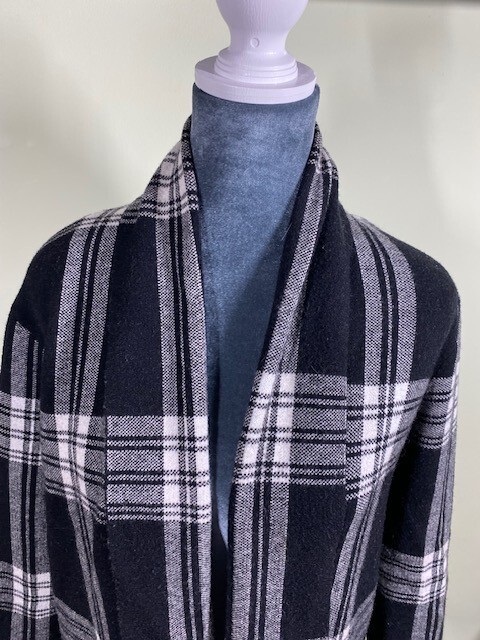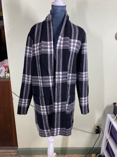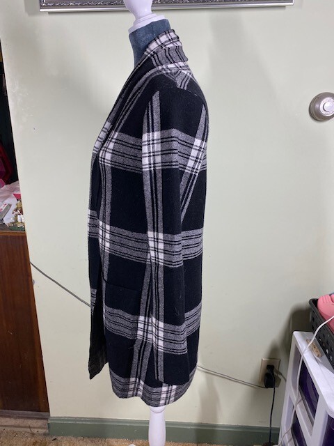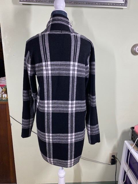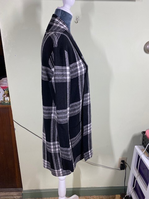 Max Studio Womens Sz S Open Cardigan Sweater Black White Plaid Warm Comfort Cozy Wrap yourself in the cozy warmth of this Max Studio open cardigan sweater, a perfect addition to your wardrobe for a touch of comfort and style. In a classic plaid pattern with a twist of black and white, it's a versatile piece that suits casual outings, travel, or even a business setting. The size small fits true to size, crafted for a regular silhouette and designed to keep you snug with its heavyweight fabric. The knit cardigan is made from a blend of viscose, polyester, and nylon, offering a soft touch and durability for everyday wear. With its long sleeves and an open neckline, it's easy to layer over your favorite outfits. Machine washable for convenient care, it's a practical choice for those who value both aesthetics and functionality. Embrace the cooler seasons with this academia-inspired, Lagenlook sweater that promises to keep you cozy without sacrificing style. Size & Fit can be affected by garment’s age/brand/style/type/wash/wear. To ensure proper fit, always compare provided measurements to a similar garment of yours that fits you well. All measurements are approximate (garment lying flat): Arm pit to Arm pit: 19" Neck to end of sleeve: 31" Neck to bottom of garment: 34" Nice condition from a non-smoking home. - Minor signs of wear from use. See pictures for exact condition of the item you'll be receiving. No visible rips, holes, tears or stains. Thank you! Please check out my store for other great items! Office - 1618