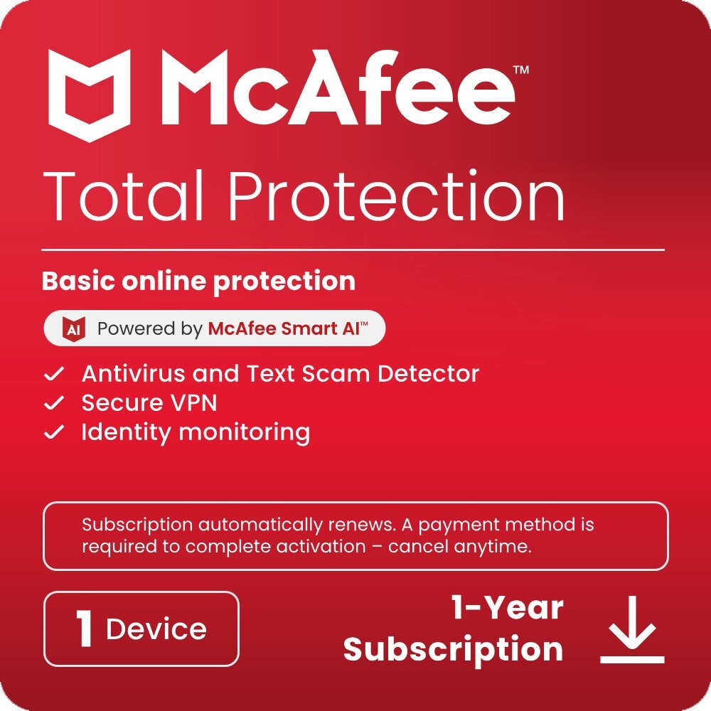 New McAfee Total Protection | Antivirus Internet Security Software | Download Protect your digital life with McAfee Total Protection. Stay secure with award-winning antivirus, AI-powered Text Scam Detector, identity monitoring and VPN. Stay safe from text-based scams with our AI-powered Text Scam Detector, which can even block risky links if you accidentally click on them. Protect your online privacy with our unlimited VPN, ensuring your personal data and activities remain secure, especially when using public Wi-Fi. Take control of your digital identity with our Identity Monitoring service, providing you with timely alerts and guidance to safeguard your personal information. Browse safely and securely with our color-coded safe browsing feature. Create and store strong passwords with our easy-to-use password manager. Instant code download: Digital code and activation instructions will be emailed to you after purchase (within 30 minutes). Subscription and Auto-Renewal Notice: Subscription automatically renews annually to provide hassle-free protection. A payment method is required to complete activation, but don't worry, you won't be charged at that time. You will be charged 30 days before the subscription ends and annually thereafter at the renewal price applicable. We will remind you 30 days before you are charged. You can cancel any time from your 'My Account' page by logging in to mcafee.com. Live Freely & Confidently Online with Total Protection Privacy Protection Keep your personal info private on public Wi-Fi with Secure VPN. Identity and Financial Protection‡ Secure your finances and data from identity theft with 24/7 monitoring and timely alerts. AI-Powered Antivirus and Scam Protection Get real-time protection against viruses, hackers, and risky links with McAfee's advanced technology. McAfee Total Protection Additional Features Password Manager While we use passwords to help prevent unauthorized access to accounts, many aren’t following best practices. A password manager is crucial to creating and storing strong passwords for important online accounts. Our password manager helps you secure your accounts by generating complex passwords , storing them and auto-filling your info for faster logins across devices. It’s secure and, best of all, you only have to remember a single password. Identity Monitoring Proactively protect your personal info from identity theft Data breaches, identity theft, and fraud are top-of-mind for most people. An identity monitoring service brings peace of mind by monitoring everything from email addresses to IDs and phone numbers for signs of breaches so you can take action to secure your accounts before they’re used for identity theft. We'll monitor the dark web for your personal info, including email, government IDs, credit card and bank account info, and more . We'll help keep your personal info safe, with early alerts if your data is found on the dark web, an average of 10 months ahead of similar services. Secure VPN (Virtual Private Network) Have you ever connected to public Wi-Fi at a coffee shop, airport, shopping mall or hotel? Your credit card info, account login, and password, browsing activity, or even your physical location could be exposed. A VPN can help ensure your personal info and online activity remain private and secure. You can bank, shop or browse confidently online knowing your personal info is protected and your online activity is private whenever you're online. Our VPN creates an encrypted "tunnel" that makes it impossible for cybercriminals or advertisers to access so that what you do online remains anonymous. McAfee Total Protection 1-Device offers standard protection for your personal information, devices, and online privacy. This comprehensive security solution includes award-winning antivirus software powered by McAfee Smart AI™, real-time threat detection, Text Scam Detector, Secure VPN, identity monitoring, safe browsing, and a password manager. With McAfee Total Protection, you can rest assured that your devices and data are safe from the latest online threats. McAfee’s award-winning antivirus software stands as a leader in PC protection. Continuously updated with the latest security definitions, it ensures your device remains guarded against the evolving threats of the digital landscape. Rest easy knowing that your device is shielded from malware, ransomware, and phishing attempts. In today’s interconnected world, safeguarding your identity is paramount. McAfee Total Protection provides comprehensive identity monitoring, keeping a watchful eye on your personal information. Receive timely alerts of potential data breaches or suspicious activities, allowing you to take prompt action and protect your sensitive information. Stay safe from text scams with McAfee’s AI-powered Text Scam Detector. This advanced technology detects and blocks risky links and suspicious text messages, preventing you from falling victim to fraudulent schemes. Enjoy secure and private internet access with our no-log VPN. It automatically activates on untrusted Wi-Fi networks, shielding your online activities, account credentials, and personal data from prying eyes.