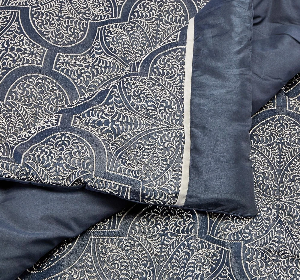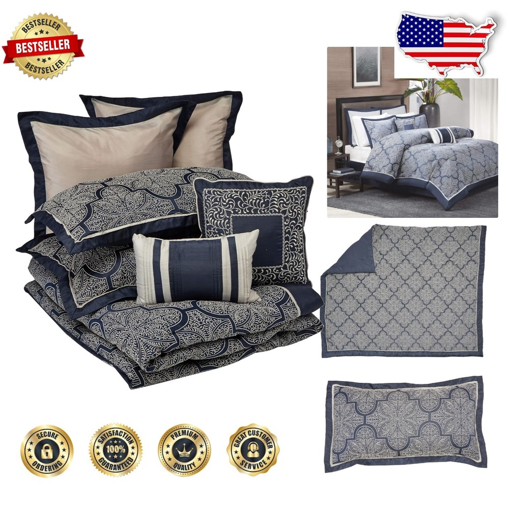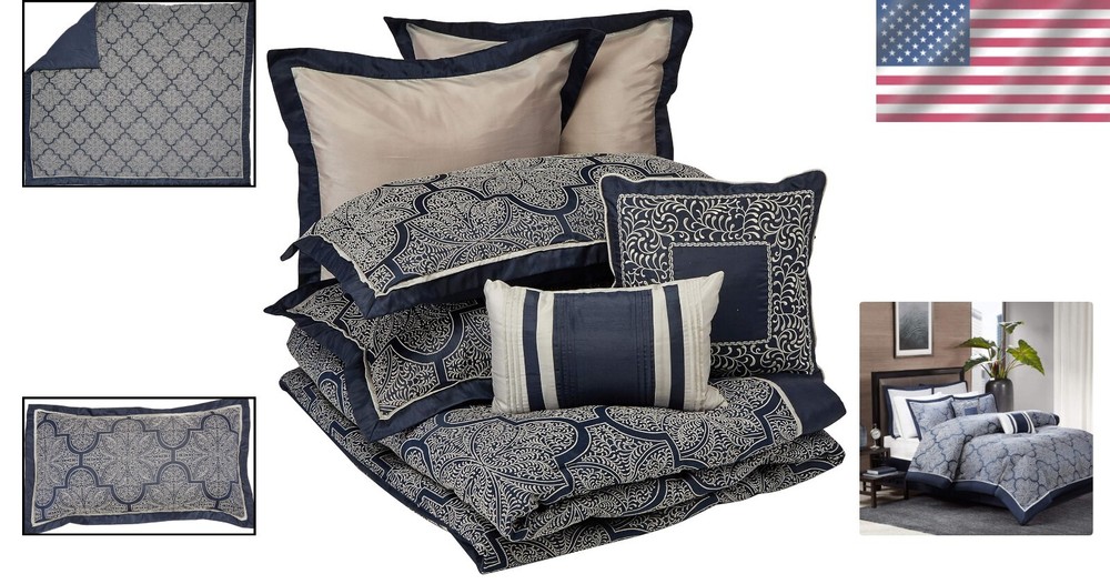 Medina King Comforter Set - All Season Cozy Bedding with Matching Accessories ‹ › ‹ › ‹ › ‹ › ‹ › ‹ › ‹ › ‹ › ‹ › ‹ › ‹ › ‹ › Medina King Comforter Set Experience the epitome of elegance and comfort with the Medina King Comforter Set. Transform your bedroom into a luxurious retreat with this all-season cozy bedding ensemble that exudes sophistication and charm. Product Specifications: Material: 100% Polyester, Imported Includes: 1 Comforter: 104"W x 92"L 2 King Shams: 20"W x 36"L 2 Euro Shams: 26"W x 26"L 1 Bed Skirt: 78"W x 80"L + 15"D 2 Decorative Pillows: 18"W x 18"L / 12"W x 18"L Key Features: Beautiful woven jacquard fabrication with silver thread on a navy blue base. Stunning key design that adds visual intrigue to your top of bed. Luxurious faux silk fabric that boasts a natural sheen for an opulent touch. Includes a variety of matching accessories that complete the look with elegance. Care Instructions: Machine wash cold, gentle cycle, and separately. Do not bleach. Tumble dry low, remove promptly. Do not iron. Spot clean decorative pillows. If there is no free movement in the washer or dryer, use a large capacity commercial washer/dryer. Why Choose the Medina King Comforter Set? The Medina King Comforter Set is not just bedding; it's an enhancement to your sleeping environment. The intricate craftsmanship of the jacquard design harmonizes seamlessly with the luxurious texture of faux silk, creating a bedroom piece that is both functional and striking. Elevate your space and indulge in your personal sanctuary with this exquisite set. Don’t wait to experience the comfort and style you deserve. Make the Medina King Comforter Set a centerpiece of your home today! Shipping Free & Fast Shipping - We offer free shipping to most of the USA with a normal delivery time of 3-7 days. However, due to the current situation, additional delivery time (up to 3 weeks) may be required for some items. Alternative Carriers - We may use alternative carriers (e.g. USPS, FedEx, UPS, etc.) to ensure your package arrives safely and on time. Due to the use of multiple carriers, we are unable to provide a tracking number automatically. Handling Time - Orders are processed and shipped within 1-2 business days of receiving cleared payment. Shipping Restrictions - Shipping to Alaska, Hawaii, Puerto Rico, Guam, and other US territories may incur shipping charges or delivery restrictions. Please contact us before ordering, or your order can be refunded/cancelled. State Restrictions - There may be restrictions based on your state of purchase. For example, certain items may not be shipped to California due to state regulations. Contact for Tracking Updates - If you require tracking updates or have any concerns about the delivery of your order, please feel free to contact us, and we will be happy to assist you. Return 30-Day Hassle-Free Returns - We want you to be completely satisfied with your purchase. If you are not, you can return the item within 30 days of receiving it for a full refund or exchange. Easy Return Process - To start a return, simply contact us and we will provide you with a prepaid return shipping label and detailed instructions. Restocking Fee - There are no restocking fees for returns. However, the buyer is responsible for return shipping costs if the return is not due to a seller's error. Refund Processing Time - Refunds will be processed within 5 business days of receiving the returned item in its original condition. Payment We accept all major credit cards, PayPal, and Apple Pay for your convenience. Your payment information is secure and encrypted to ensure a safe and seamless transaction. Please complete your payment within 3 days of purchase to avoid any delays in shipping. Feedback Your feedback is extremely important to us. We strive to provide the best products and customer service possible. If you are satisfied with your purchase, please take a moment to leave us a positive review. If you have any concerns or issues with your order, please contact us before leaving negative feedback. We are committed to resolving any problems and ensuring your satisfaction. Contact Us If you have any questions or concerns, please feel free to reach out to our customer support team. You can contact us through the eBay messaging system. We are available Monday to Friday, 9:00 am to 5:00 pm EST, and we will do our best to respond to your inquiry within 24 hours. Buy it now and enjoy a pleasant shopping experience! UPC: Not Set Model: Not Set Set Includes: Bed Skirt,Comforter,Decorative Pillow,Pillow Sham,Euro Sham Material: Faux Silk,Polyester Features: Breathable,Lightweight,Machine Wash Cold Character: Not Set Theme: Seasonal Care Instructions: Do Not Bleach,Do Not Iron,Machine Wash Cold,Tumble Dry Low Department: Adults,Unisex Adult Room: Bedroom Labels & Certifications: Not Set Size: King Type: Comforter Set Brand: Unbranded Color: Navy Fill Material: Synthetic Pattern: Solid Item Width: Not Set Item Length: Not Set MPN: Not Set Insulation: All Seasons Number of Items in Set: 8 Style: Contemporary Character Family: Not Set Season: All Country/Region of Manufacture: Not Set Closure Type: No Closure Drop Length: Not Set Thread Count: 200 or Less GSM (Grams per Square Meter): Below 150 Product Line: Not Set Personalize: Not Set