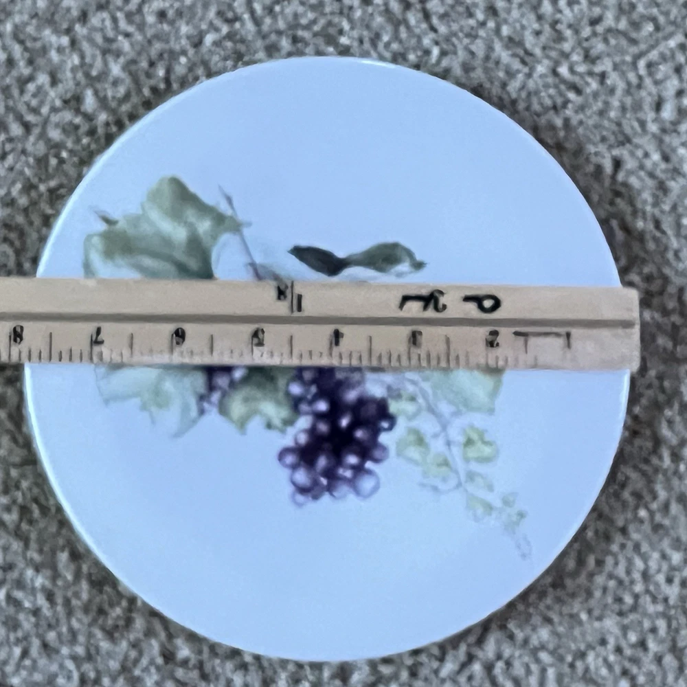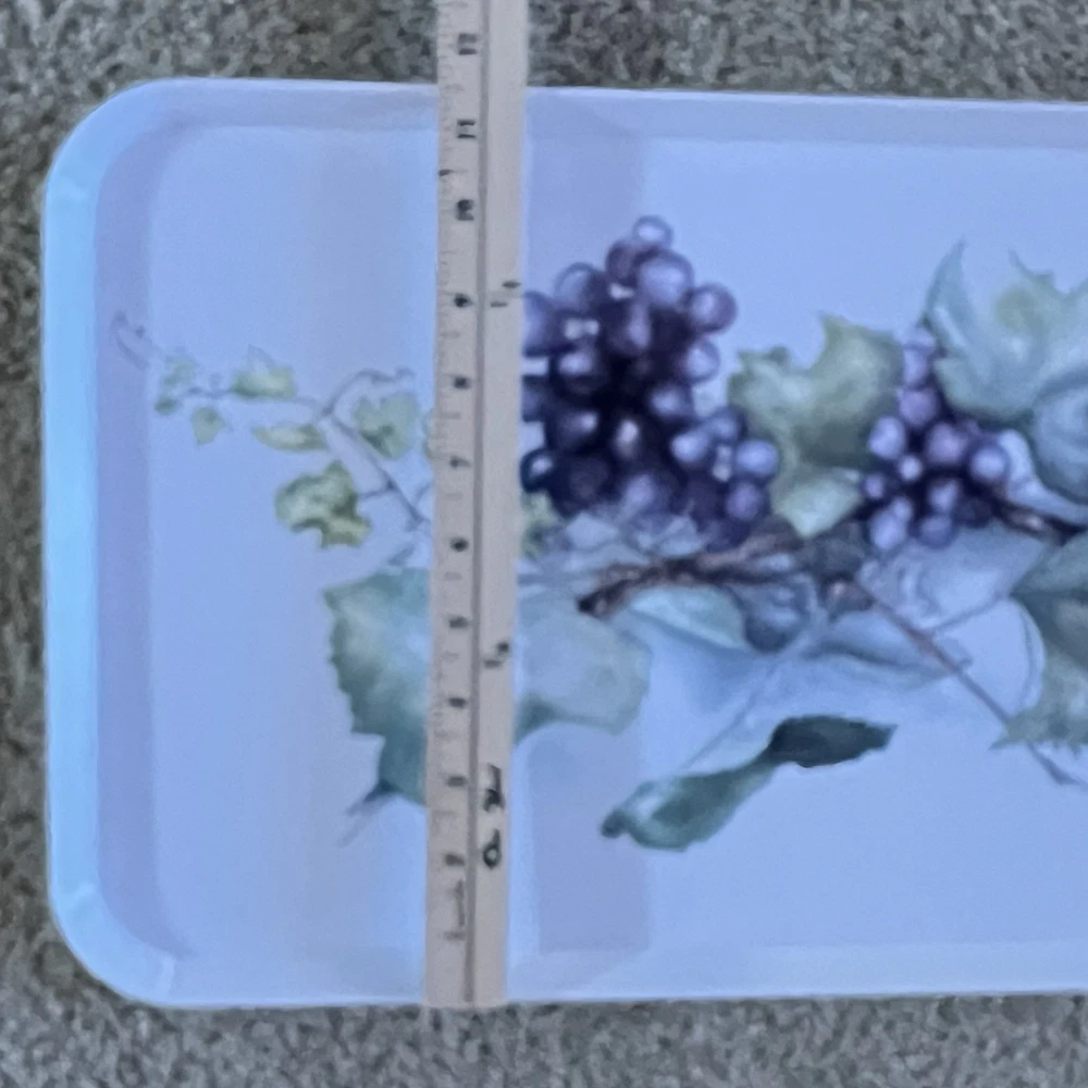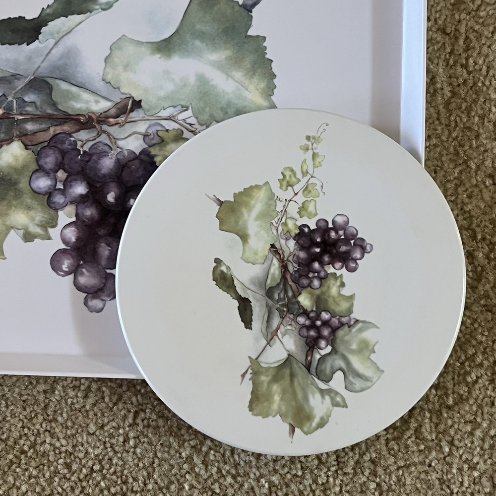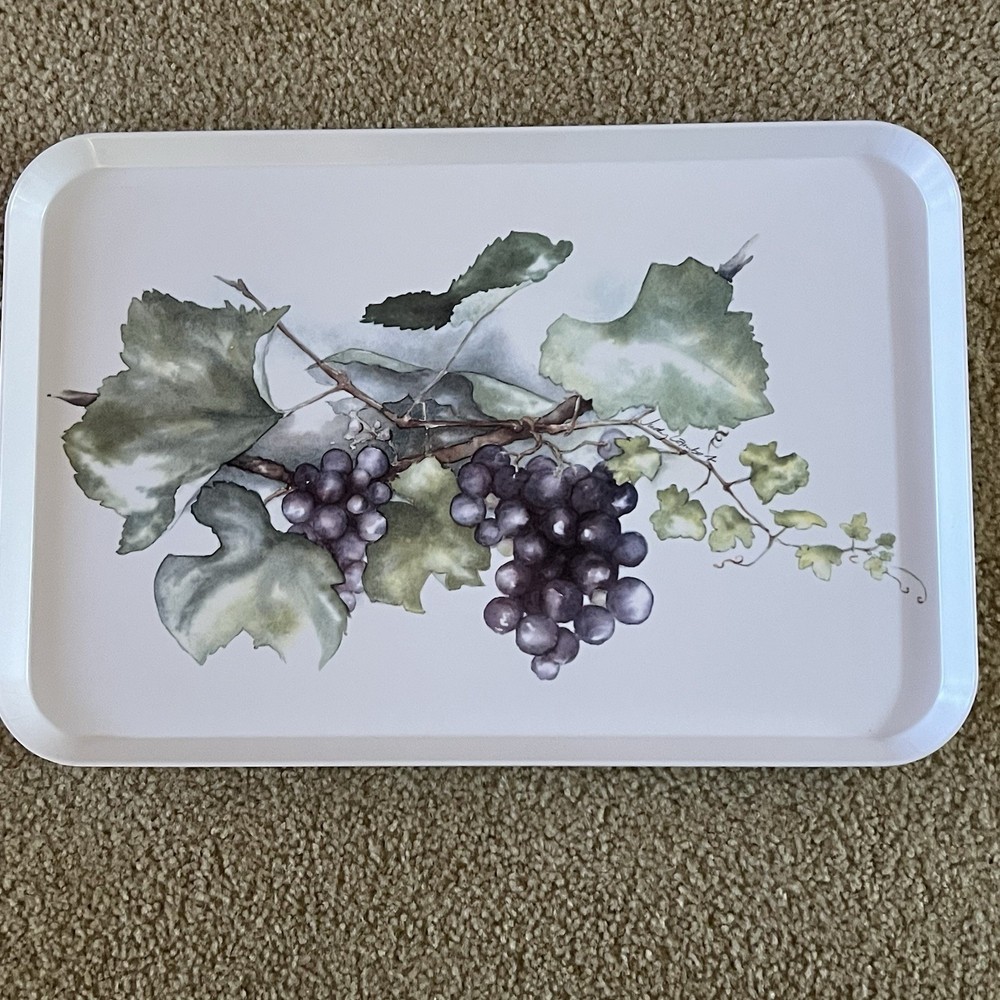 Elevate your serving game with the Design Imports Ltd melamine tray, showcasing vibrant grapes on a vine pattern. Crafted in Italy, this 17" x 12" rectangular tray is perfect for showcasing an array of appetizers, beverages, or desserts to your guests. Its durable melamine construction ensures longevity and ease of use, while the matte finish adds a touch of elegance to your table setting. The tray features a colorful design that captures the essence of Italian style, making it a versatile piece for any occasion. Whether hosting a dinner party or serving brunch, this tray is both functional and decorative, seamlessly blending with your dining ensemble. I found the matching 8" melamine trivet weeks after discovering this lovely tray, which I have included. They are both in pristine pre-owned condition. Please review the included photos and email any questions you might have. While there are no returns, I am confident you will be delighted with your purchase. I encourage you to explore the other unique items in my store.
