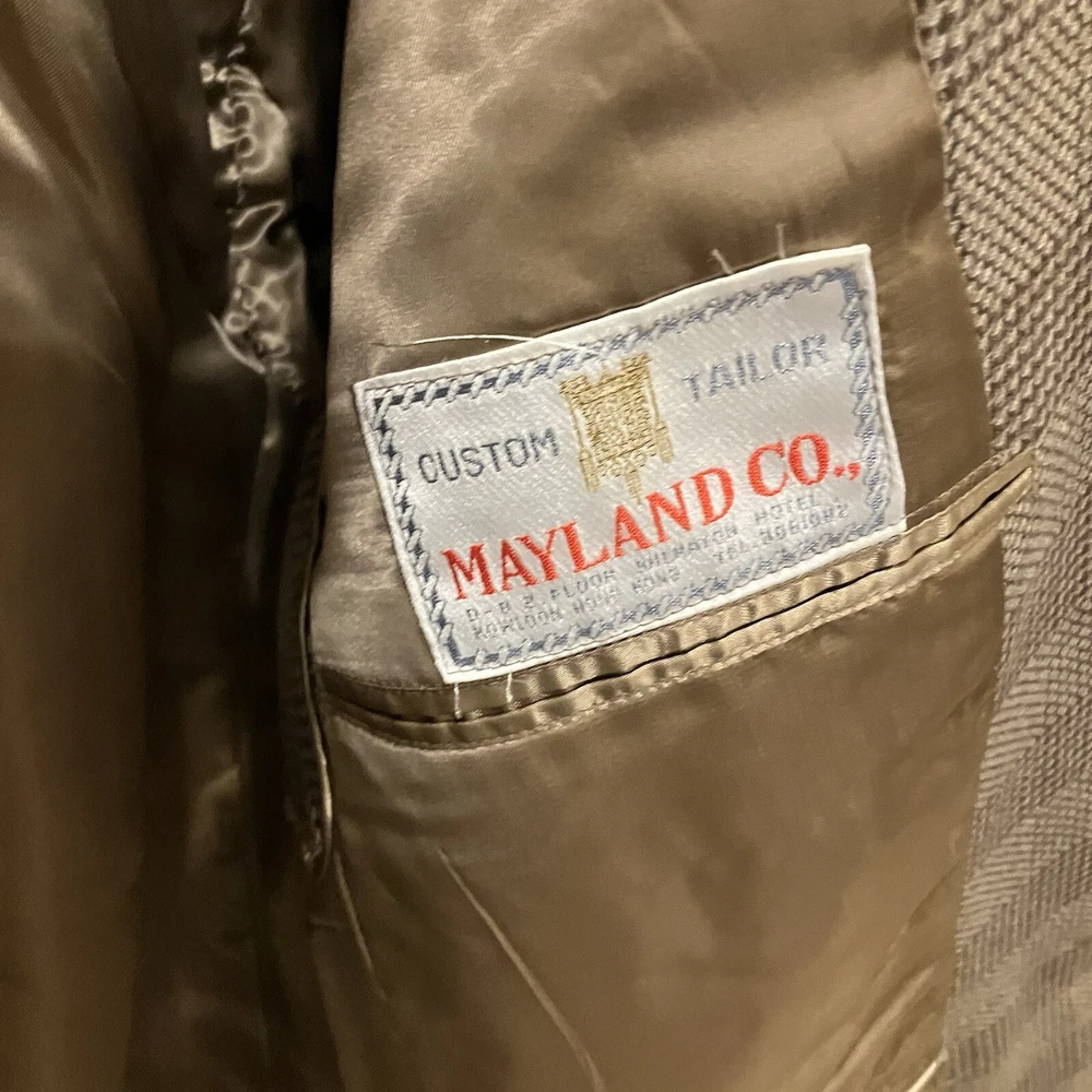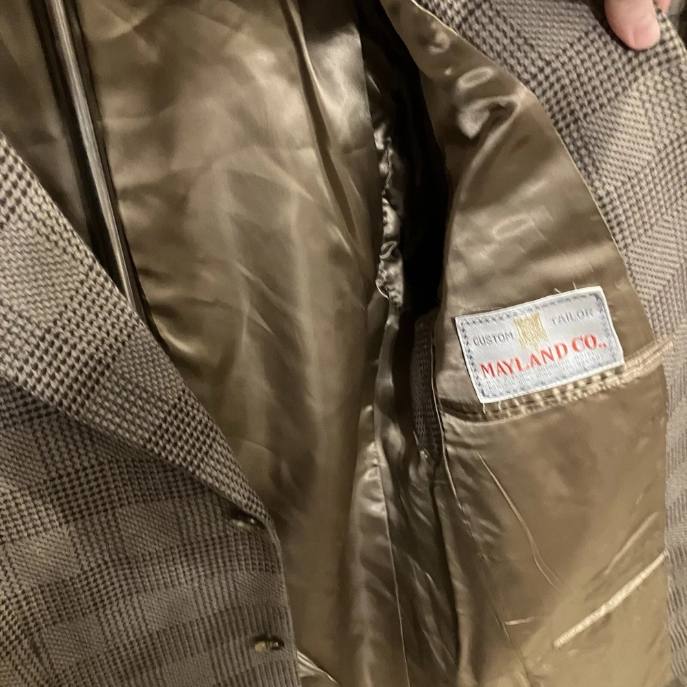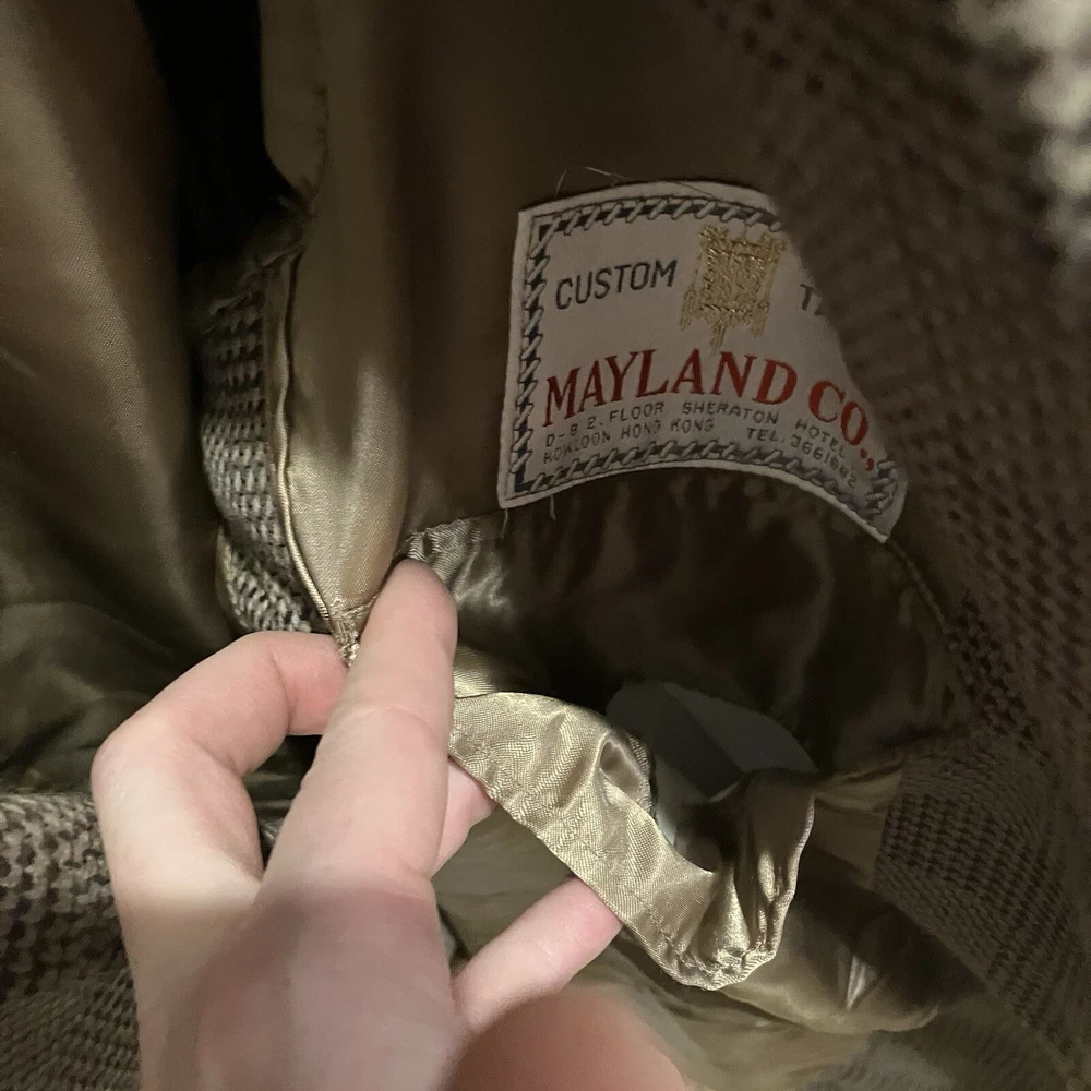 This men's vintage Mayland Co. blazer from the 60s-70s features a classic Glen Plaid pattern in brown wool fabric. It has a button closure, stand-up collar, and is lined with silk or rayon. This mid-length jacket is lightweight, wind-resistant, and suitable for all seasons. Handmade in Hong Kong, it is a stylish choice for various occasions from casual to formal wear.