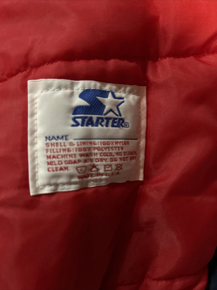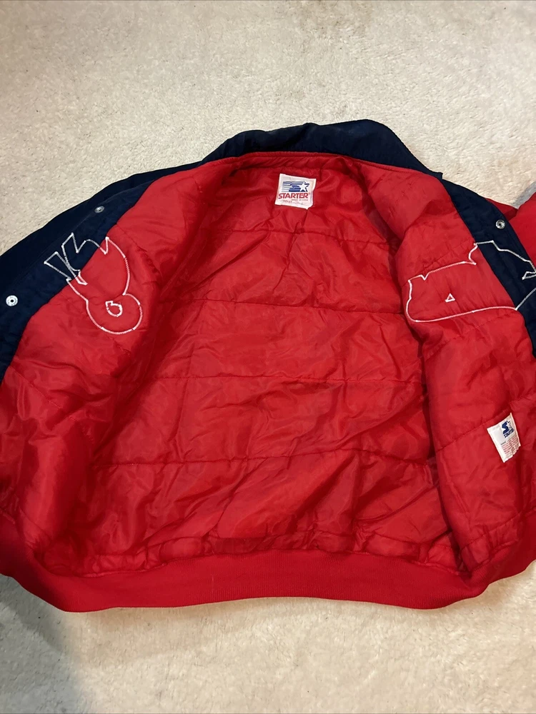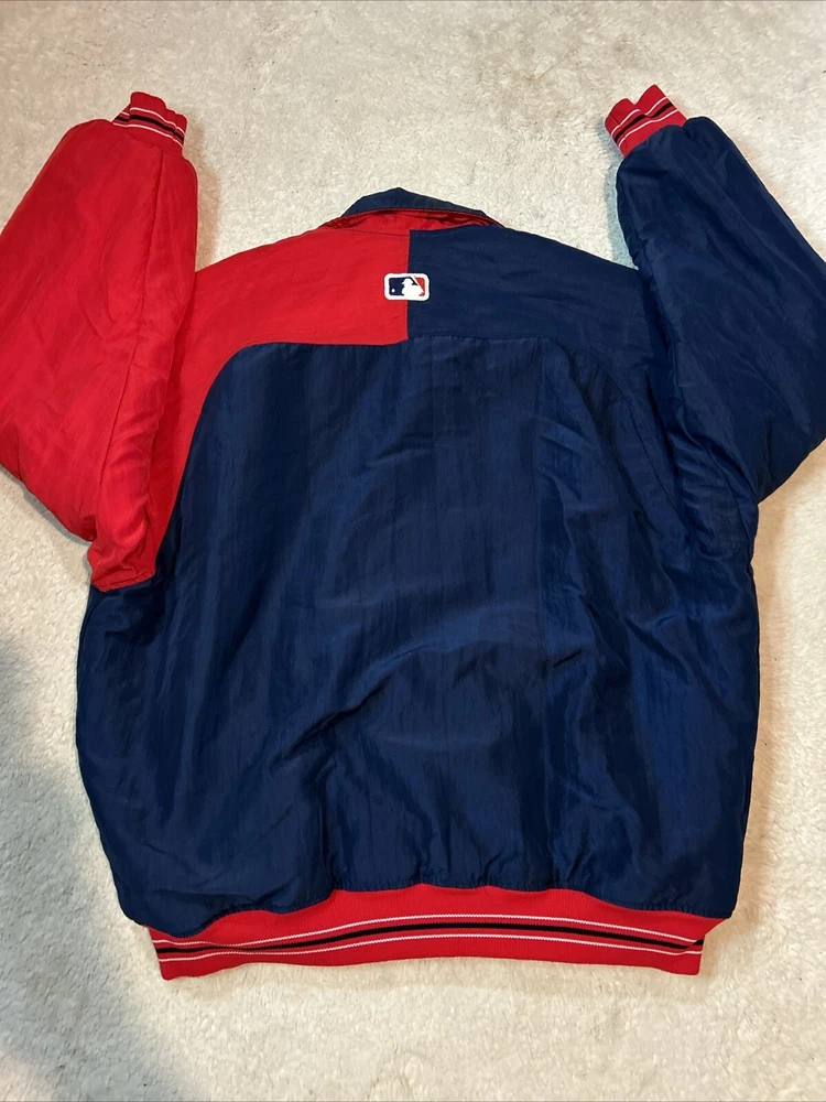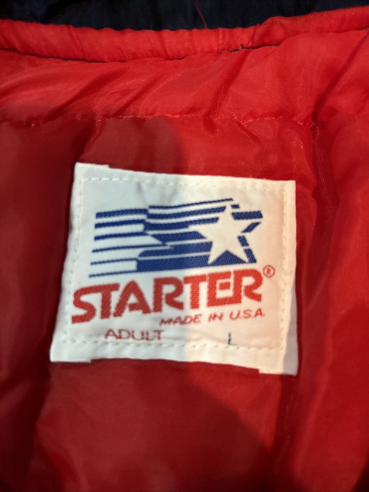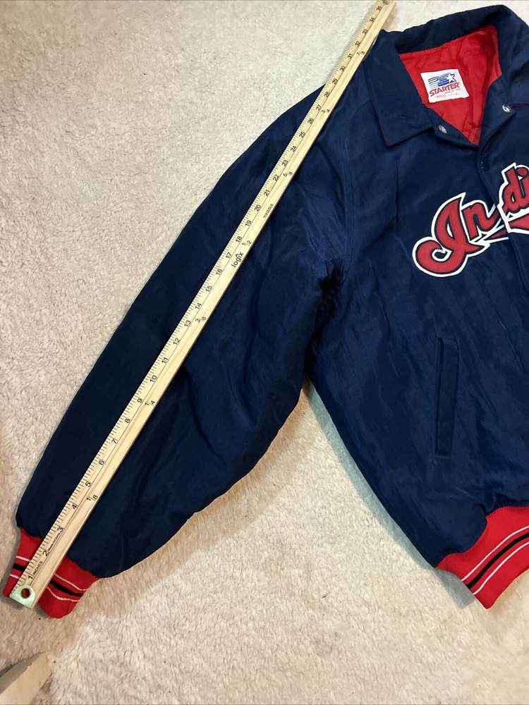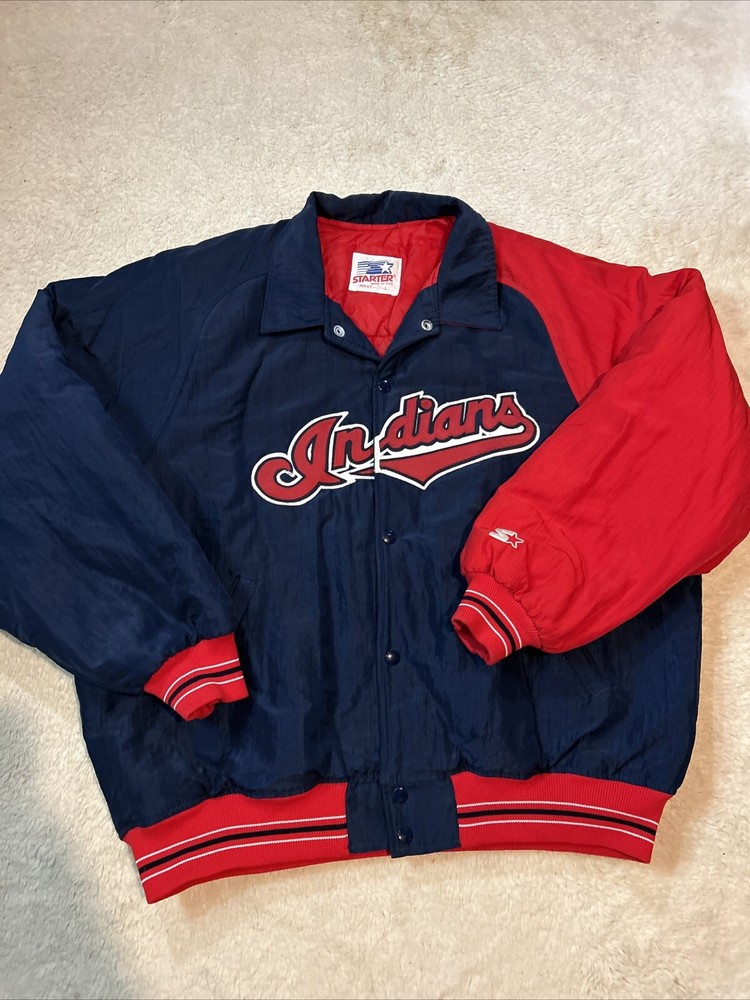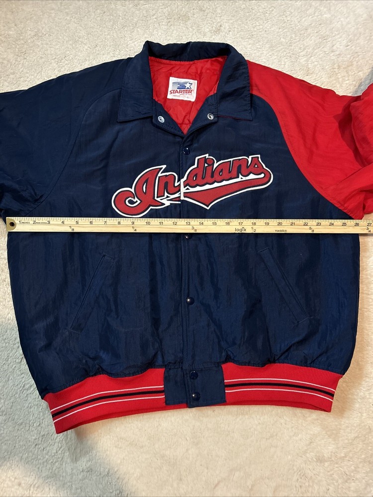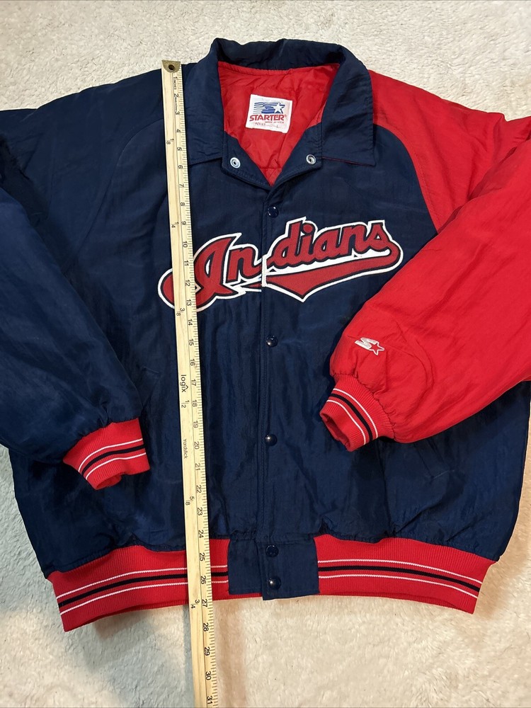 Show off your love for the Cleveland Indians with this vintage 90's Starter MLB jacket. Made in the USA with high-quality nylon material, this mid-length windbreaker features a snap closure and padded insulation for all seasons. The blue and red color combination with the Indian logo accents makes it the perfect addition to any casual outfit. This jacket is not just stylish but also practical, with its water-resistant and wind-resistant features. The collared design and pockets add to its functionality, making it a great choice for any occasion. Whether you're going to a baseball game or just running errands, this jacket is sure to make a statement.