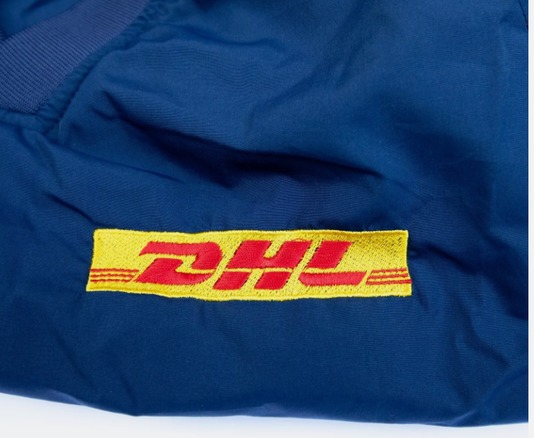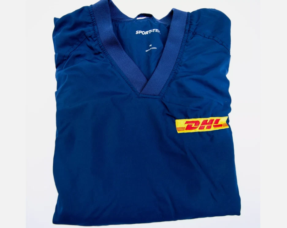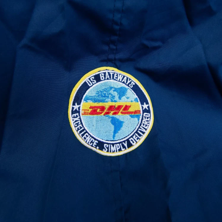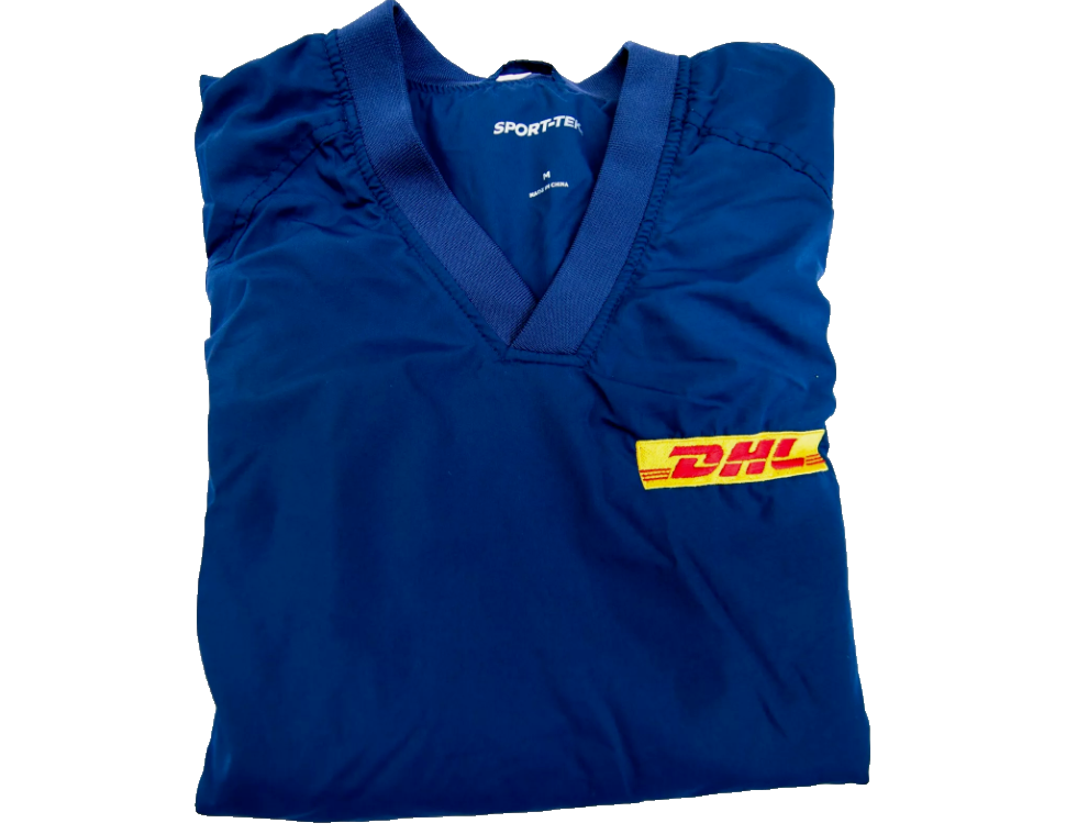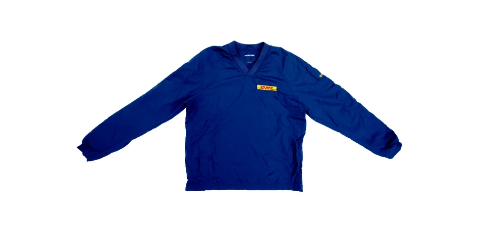 Navy Designer-Style Amazing Vintage Medium Sweatshirt Windbreaker V-Neck Jumper Marley DHL Sport-Tek Vintage Windbreaker V-Neck Postal Medium Material: 100% Polyester Size: Medium Neck to Shoulder- No shoulder seam Sleeve Length- No shoulder seam Sleeve Opening- 4 in. Shoulder to Shoulder- No shoulder seam Chest- 24 in. Waist- 23 in. Hem- 22 in. Front Length- 29 in. Brand: Sport-Tek Lined, Elastic Sleeves, Hanging hook, Zipper on the side, Windbreaker material Country Made In- Made in China