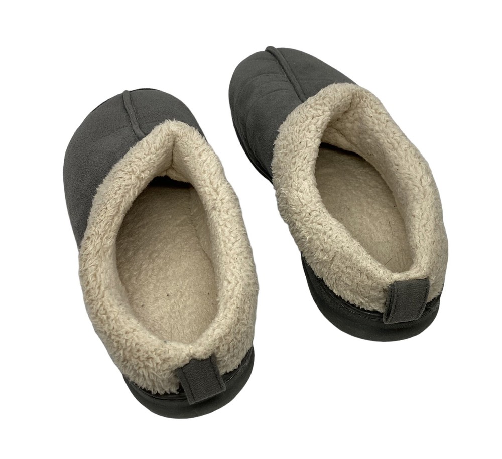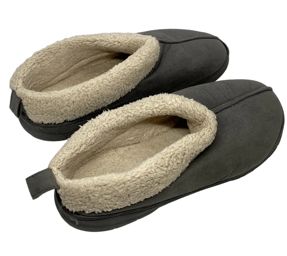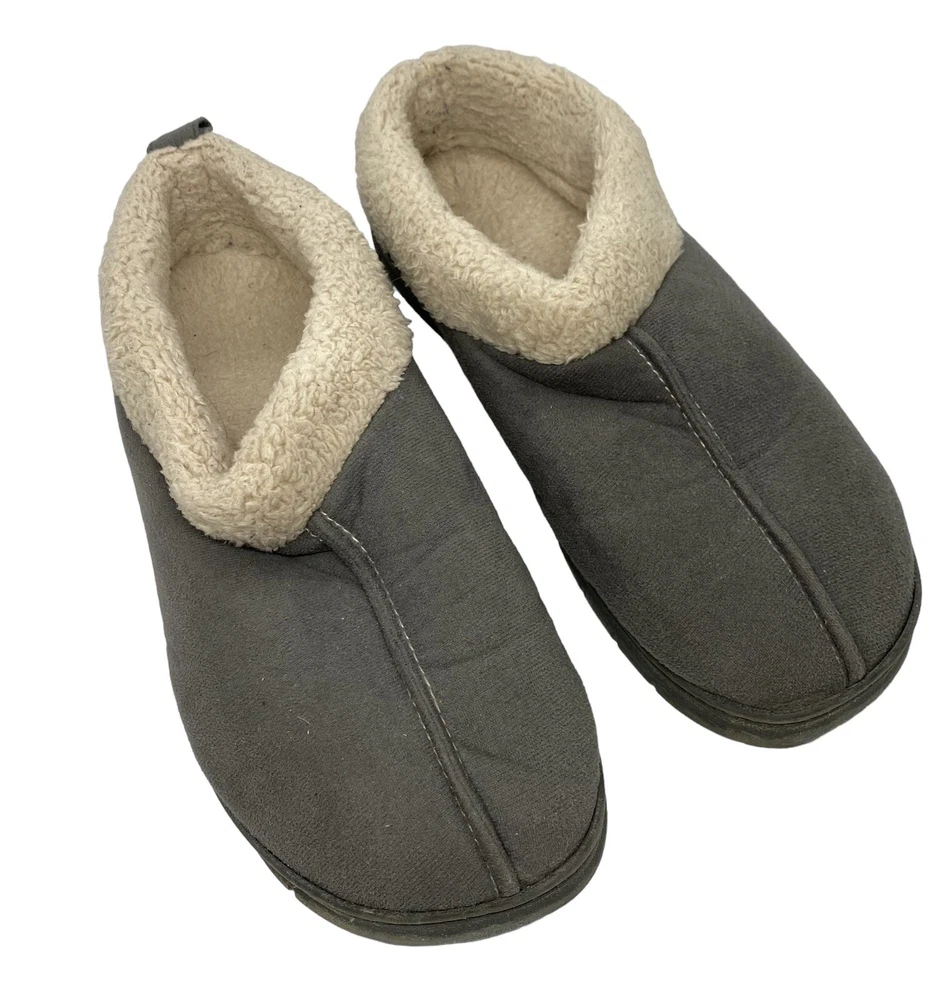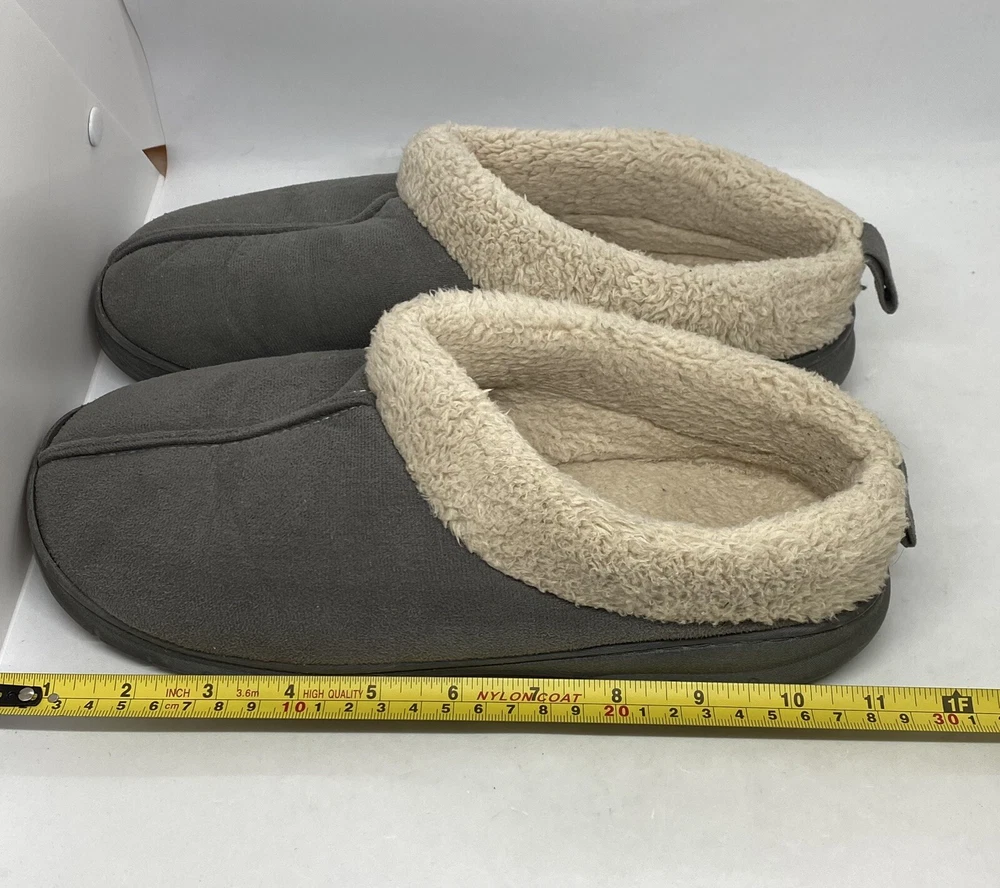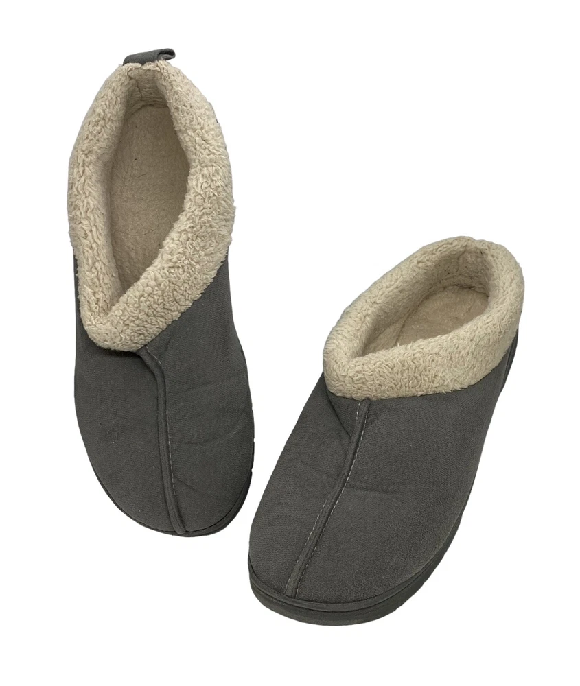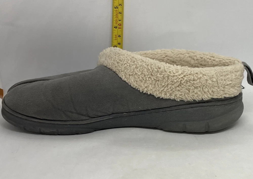 Men's Fuzzy House Slippers Gray SIZE M (9-10) Warm Cozy Comfort Fleece Rubber Soles. Cozy & Warm - The woolen felt, and fleece collar stitched upper keep in warmth and is breathable. Soft fuzzy sherpa lining offers next-to-skin comfort to keep you warm and cozy in the cooler seasons. Wool-felted and microsuede upper. Faux fleece lining. Soft foam footbed. Rubber soles. The Shoes measure 11.5' Length x 4 1/2" Width x 3 3/4" Tall. They weigh a total of 13.86 ounces or 398 grams.