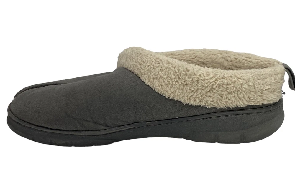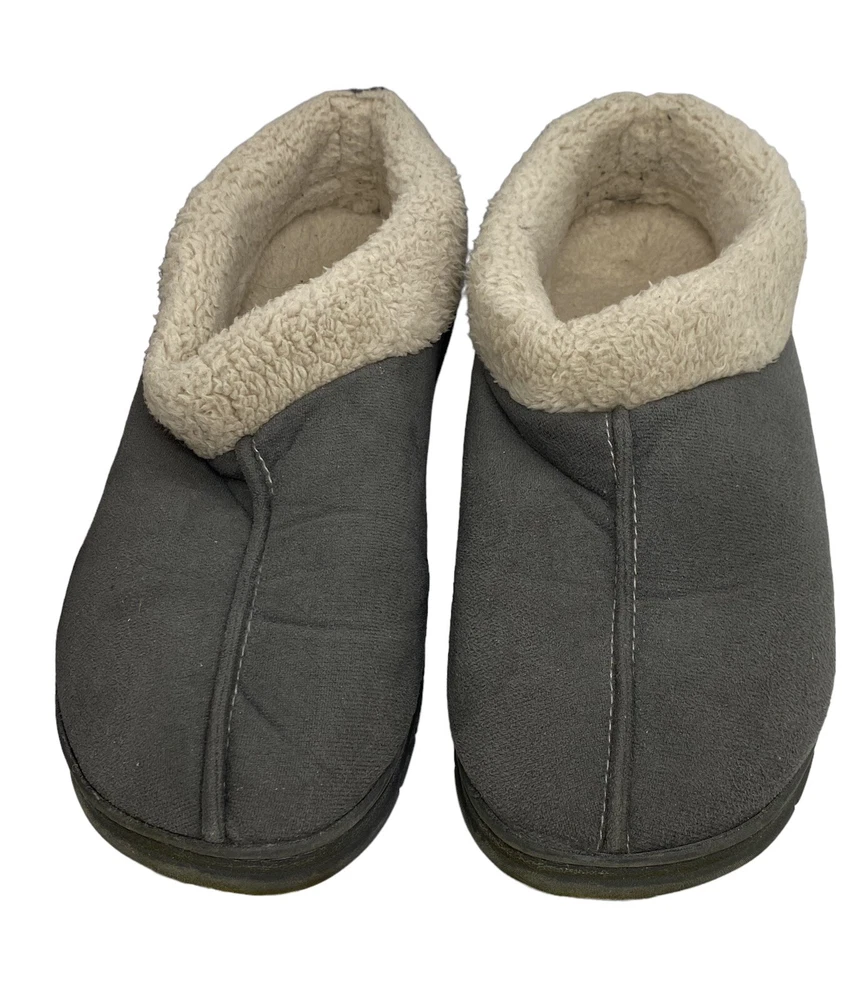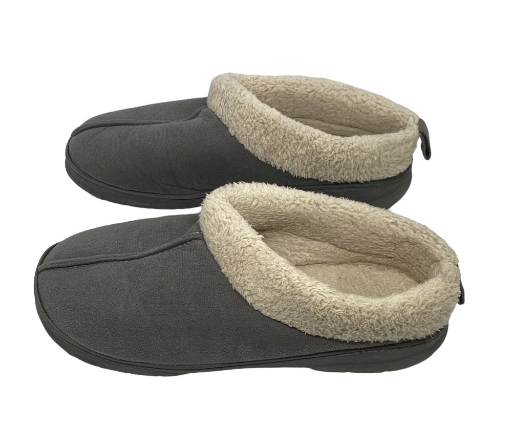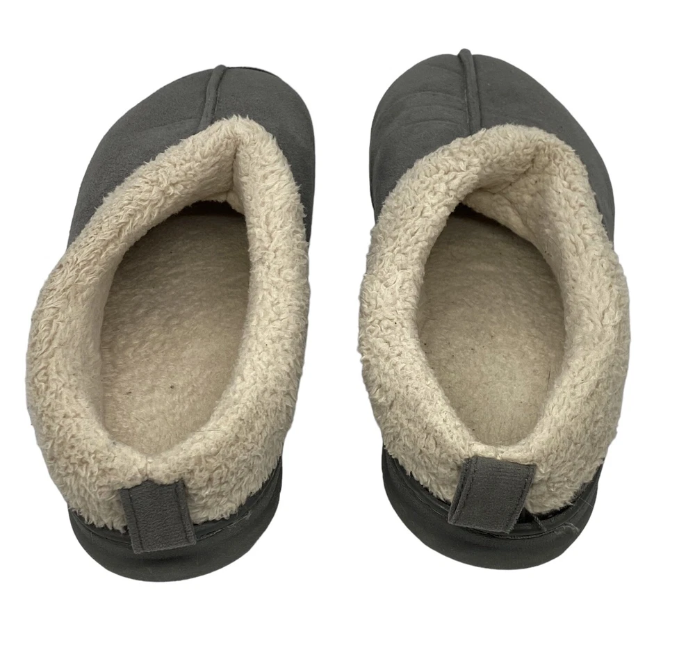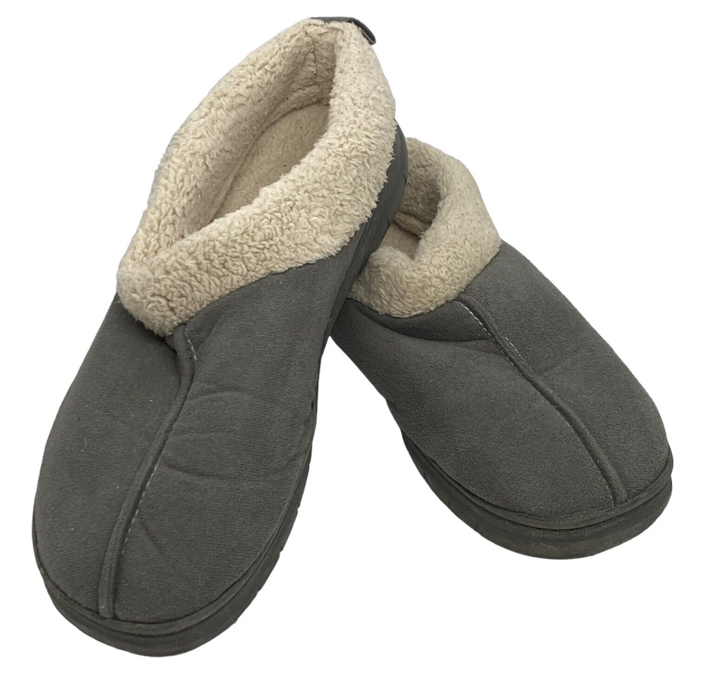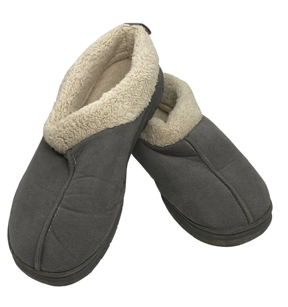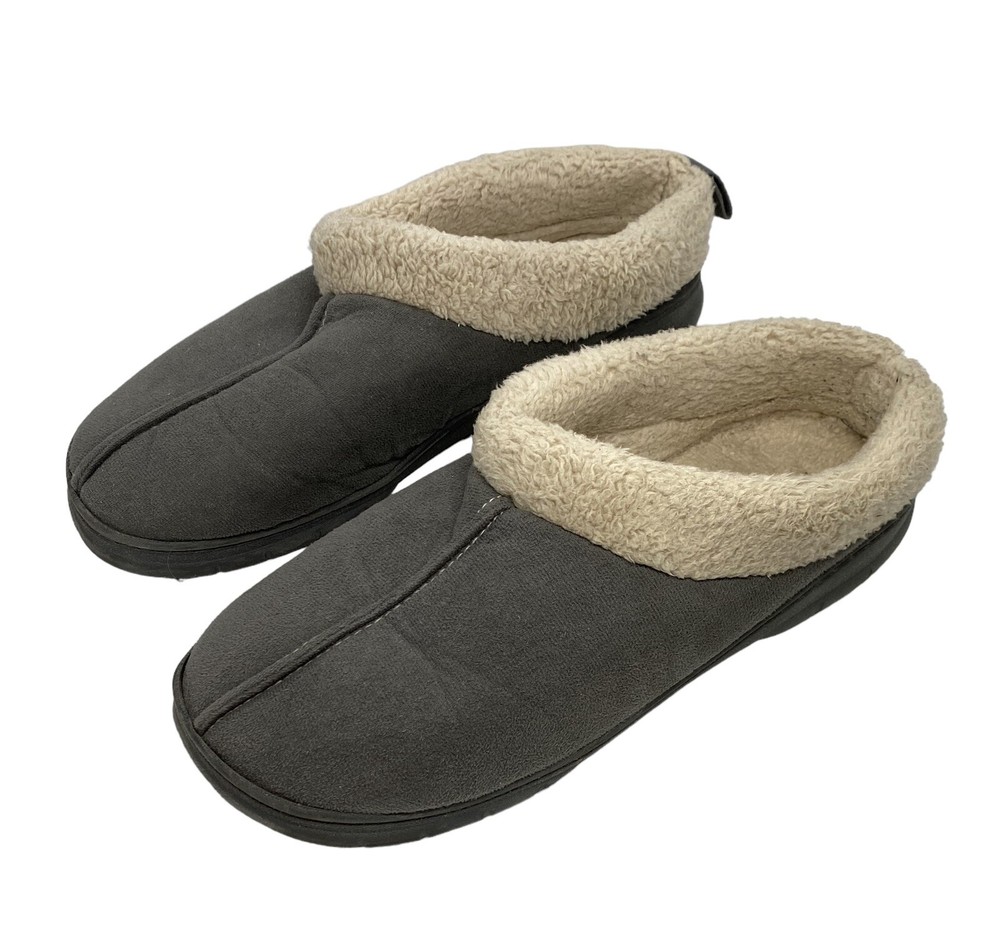 Men's Fuzzy House Slippers Gray SIZE M (9-10) Warm Cozy Comfort Fleece Rubber Soles. Cozy & Warm - The woolen felt, and fleece collar stitched upper keep in warmth and is breathable. Soft fuzzy sherpa lining offers next-to-skin comfort to keep you warm and cozy in the cooler seasons. Wool-felted and microsuede upper. Faux fleece lining. Soft foam footbed. Rubber soles. The Shoes measure 11.5' Length x 4 1/2" Width x 3 3/4" Tall. They weigh a total of 13.86 ounces or 398 grams.