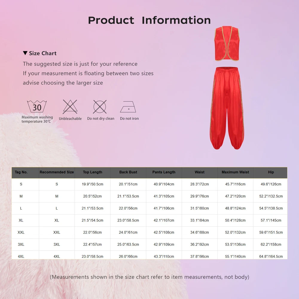 New Arrivals Hot Sale Women's Dresses Women's Swimsuit Girls'Dresses Girls'Sleepwear Girls'Swimwear Boys'Clothing Baby Clothing NEW ARRIVALS PRODUCT DETAILS Mens Vest And Pants Satin Arabian Prince Party Halloween Uniform Costume Top #1 Set Include : 1Pc Vest, 1Pc Pants Condition : New With Tag Material : 100% Polyester Features : Made of skin-friendly polyester, satiny surface is smooth and no wrinkles, premium fabric is breathable and comfortable to wear. The vest is designed with sleeveless, open front and curved hem. The pants have elastic waistband, loose fitting and elastic leg opening. Gold lace trims add gorgeous details to make you more attractive. Stain surface has unique luster and brings a luxurious look. Dressing up you as an Arabian or Indian prince, fairytale character with magic. This outfit is also suitable for belly dancing performances. Suitable for Halloween, stage costumes, clubwear, fairytales shows, masquerade, belly dance, carnivals, photography and so on. Size Chart The suggested size is just for your reference. If your measurement is floating between two sizes, advise choosing the larger size. (Measurements shown in the size chart refer to item measurements, not body) Tag No. Recommended Size Top Length Back Bust Pants Length Waist Maximum Waist Hip S S 19.9’’/50.5cm 20.1’’/51cm 40.9’’/104cm 28.3’’/72cm 45.7’’/116cm 49.6’’/126cm M M 20.5’’/52cm 21.1’’/53.5cm 41.3’’/105cm 29.9’’/76cm 47.2’’/120cm 52.2’’/132.5cm L L 21.1’’/53.5cm 22.0’’/56cm 41.7’’/106cm 31.5’’/80cm 48.8’’/124cm 54.5’’/138.5cm XL XL 21.5’’/54.5cm 23.0’’/58.5cm 42.1’’/107cm 33.1’’/84cm 50.4’’/128cm 57.1’’/145cm XXL XXL 22.0’’/56cm 24.0’’/61cm 42.5’’/108cm 34.6’’/88cm 52.0’’/132cm 59.6’’/151.5cm 3XL 3XL 22.4’’/57cm 25.0’’/63.5cm 42.9’’/109cm 36.2’’/92cm 53.5’’/136cm 62.2’’/158cm 4XL 4XL 23.0’’/58.5cm 26.0’’/66cm 43.3’’/110cm 37.8’’/96cm 55.1’’/140cm 64.8’’/164.5cm Friendly Tips: The size is measured by hands, please allow 1-3cm errors of measurement. Photo color might be a little different from the actual product due to color display of different monitors. #2 Set Include : 1Pc Vest Condition : New With Tag Material : 90% Satin, 10% Shiny Lace Features : Made of skin-friendly satin, breathable, no-pilling and wrinkleless, soft fabric keeps you comfortable all the time. Designed with open front, curved hem, gold braided trim and smooth satin fabric, which is an ideal choice for role playing. Simple design brings deluxe and gorgeous look. Classic color let people know you are imitating Arabian prince immediately. Pairing with shirt, jeans, harem pants and other costumes, recreating Arabian or Indian prince and bringing more fun to the party. Suitable for Halloween, stage costumes, cosplay, clubwear, fairy tales shows, masquerade, role play, carnivals and so on. Size Chart : The suggested size is just for your reference. If your measurement is floating between two sizes, advise choosing the larger size. (Measurements shown in the size chart refer to item measurements, not body) Tag No. Recommended Size Back Center Length Back Bust S S 20"/50.5cm 20"/51cm M M 20.5"/52cm 21"/53.5cm L L 21"/53.5cm 22"/56cm XL XL 21.5"/54.5cm 23"/58.5cm XXL XXL 22"/56cm 24"/61cm 3XL 3XL 22.5"/57cm 25"/63.5cm 4XL 4XL 23"/58.5cm 26"/66cm Friendly Tips: The size is measured by hands, please allow 1-3cm errors of measurement. Photo color might be a little different from the actual product due to color display of different monitors. Product names are trademarks of the listed manufacturer or other owners, and are not trademarks of easysports88. The manufacturer does not necessarily endorse use of these products. Terms and Conditions Shipping Combined shipping is limited only to the items listed under this seller account : easysports88 All the free shipping item don't offer discount. We REDUCE US$1.00 on shipping cost for each additional item. Please contact us to send you the update invoice once you finish your purchase. Please note that only the item in same currency can be combined.Please note that we do NOT offer shipping discount for bidding orders or item value less than $5.00 Please verify your address during checkout. We are not responsible for any wrong or undeliverable addresses. Your item will be sent to your ebay address. Please make sure your ebay address is correct. Any non- received items caused by invalid address are not in our full refund or replacement policy. All items will be shipped within 1 business day after full payment is received. It takes about 10-20 days to US UK AU DE; about 20-35 days to other countries.Shipping may influenced by holidays, events and other uncertainties. We could not guarantee the arrival time. If you can't accept the shipping time, please check the extra charge with us to ship your item via express. Please check my other products below: 3Pcs Cutting Fixture Commercial Places Foam Pipe Simple Cutter Tool Easy To Use USD 12.99 Unisex Knee Pads Reusable Ski Protection Mat Detachable Costume Accessory New USD 14.99 6Pcs Door Handle Cover Color Block Hardware Decoration Cabinet Soft Wardrobe USD 11.99 1Pcs Photography Props Masquerade Costume Accessory Multilayer Armor Medieval USD 31.99 2Pcs Magic Trick Christmas Bend Spoon Metal Gimmick Festival Magic Tricks Funny USD 10.99 Kids Adults Hook And Loop Fastener Full-Covered Helmet Kickboxing Soft Durable USD 19.99 1Pcs Cup Drying Rack Bottle Stand Dryer Family Household Accessory New Cup Base USD 13.99 1Pcs Salt Dispenser Cooking Table Seasoning Bottle Barbecue Flavour Shaker USD 21.99 100Pcs Dispensing Needle Kit Universal Accessory Tool Wear-resistant Syringe USD 12.99 Unisex Headgear Patent Leather Mask Non-toxic Clubwear Cool Cosplay Masquerade USD 14.99 6Pcs Mute Tools Non-toxic Silencers Safe Gel Pads Sturdy Drum Dampeners Band USD 10.99 Unisex Headwear Funny Costume A