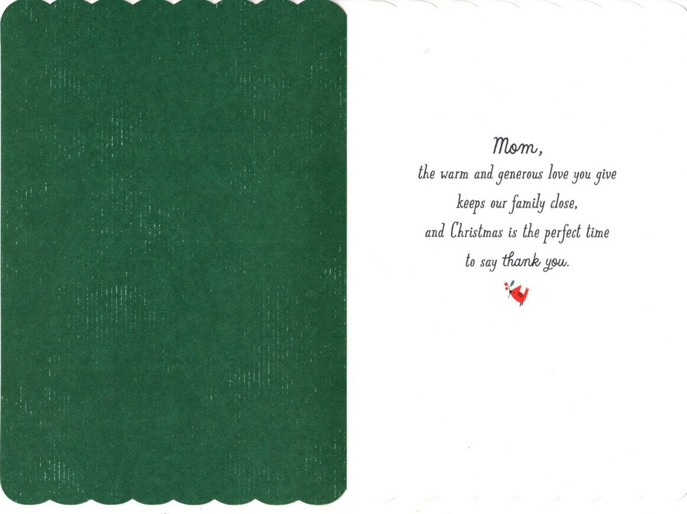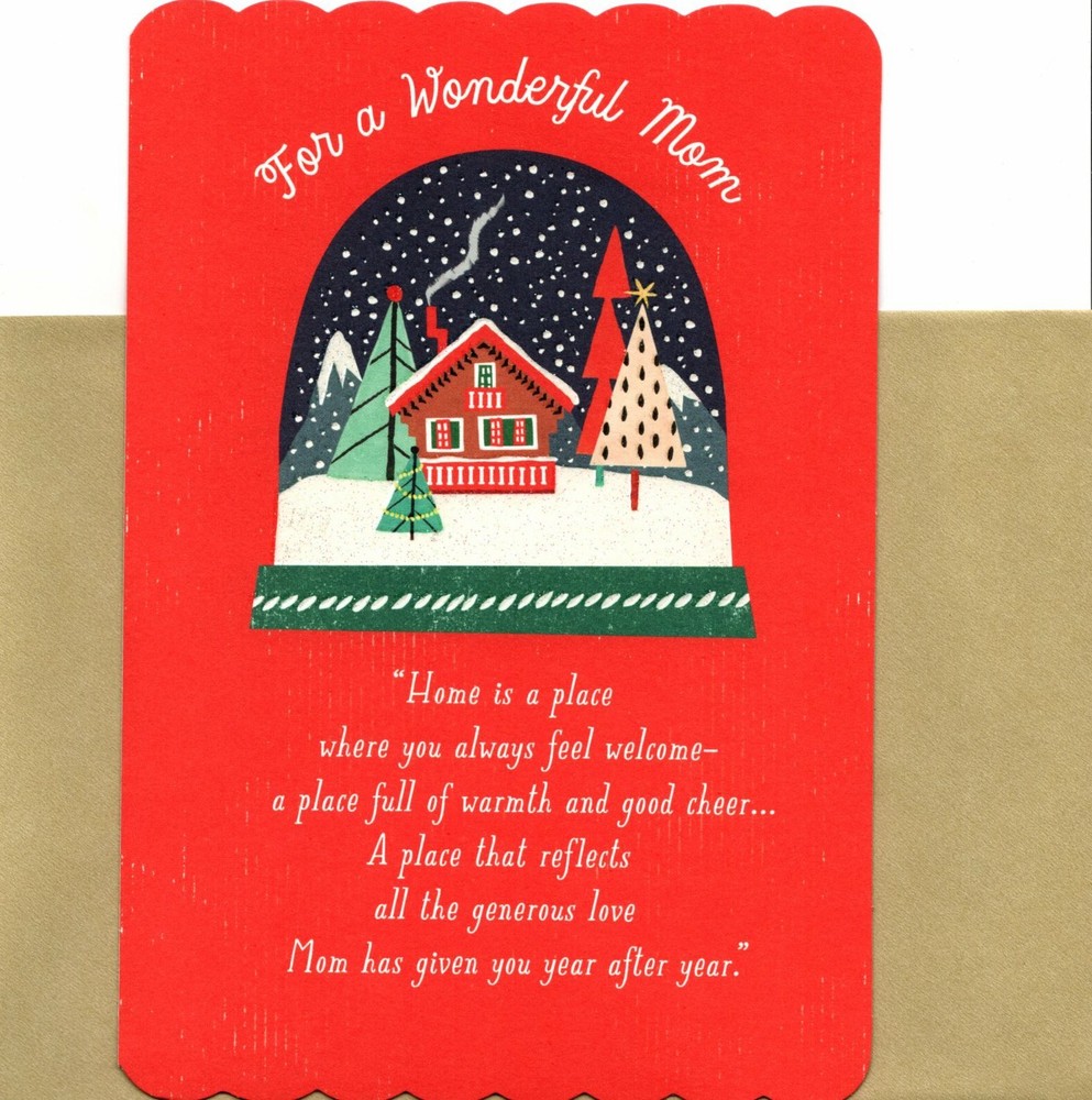 Merry Christmas Mom Home Is Where You Feel Welcome Rustic Theme Hallmark Card Includes card, and tan envelope Card Size: 5-1/2 " x 8" Excellent condition from an immaculate home with no pets and no smoking By Hallmark Made in the USA Card ships in a bubble envelope with cardboard support so that your card arrives in perfect condition **Combined Shipping Available: Simply add the items to your cart, and click "Request Total".