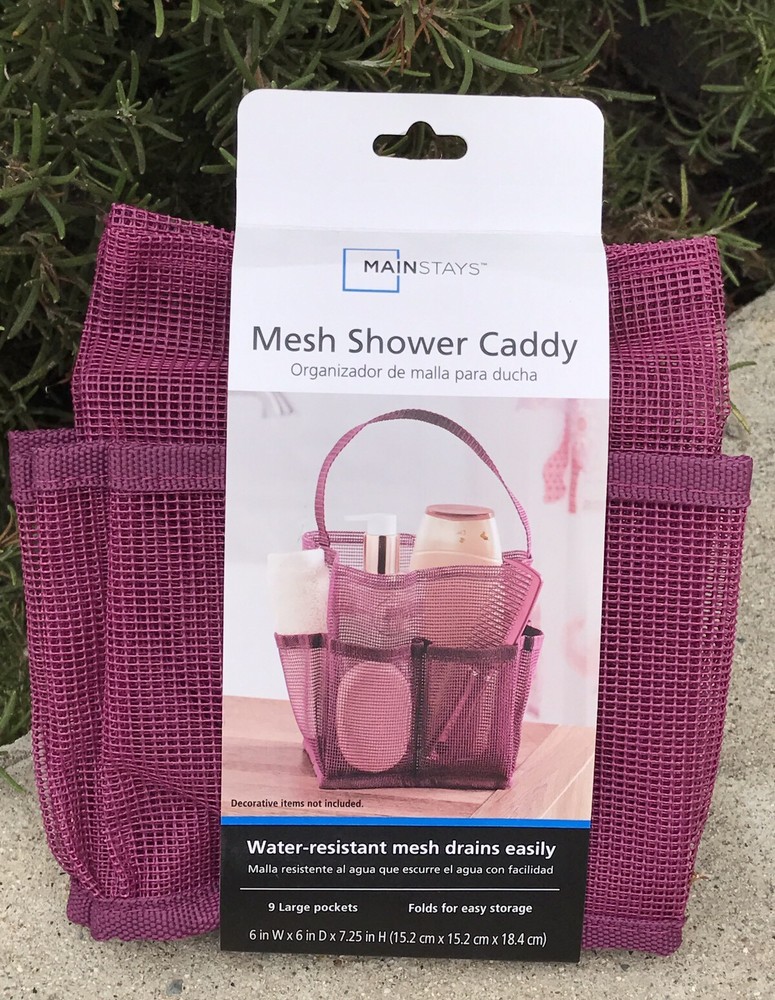 Shower Caddy Bag: Keep your essentials close with the Mainstays Mesh Shower Tote. It's made of breathable fabric that's reinforced along the top of each pocket and the base for added strength. This pink shower tote has nine open storage areas. The water-resistant mesh allows for easy drainage. It's ideal for holding shampoo, conditioner, soap, a razor, loofah, gels and more. Mainstays Mesh Shower Tote, Burgundy. Features: Water-resistant and drains easily 9 Large Pockets Reinforced handle