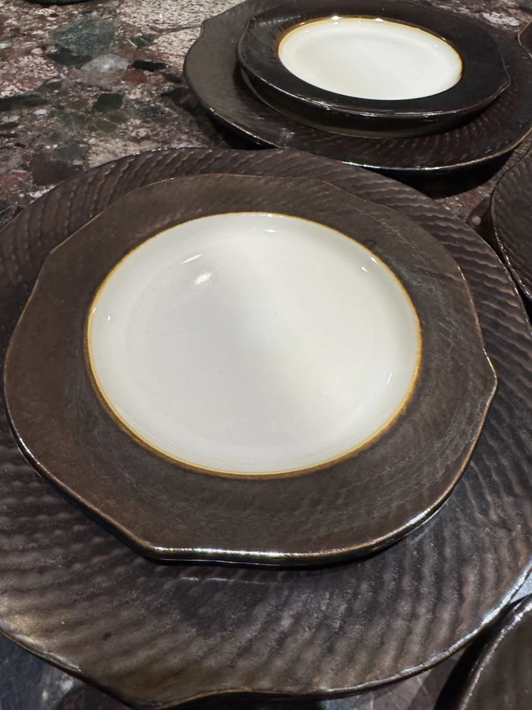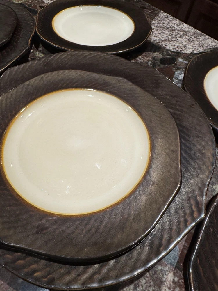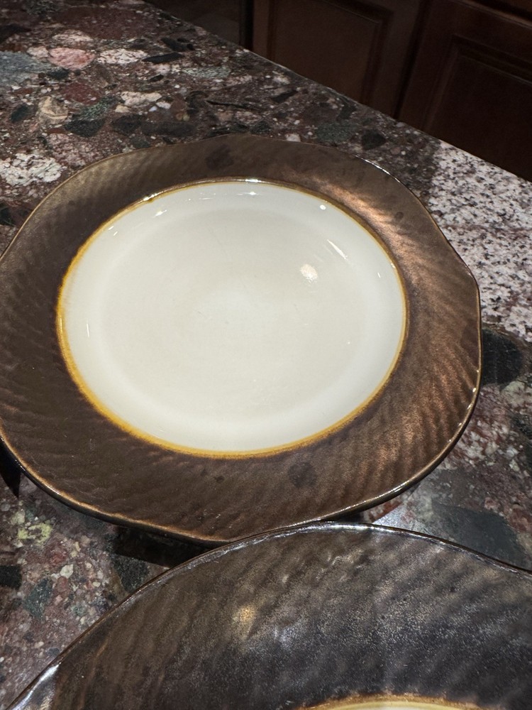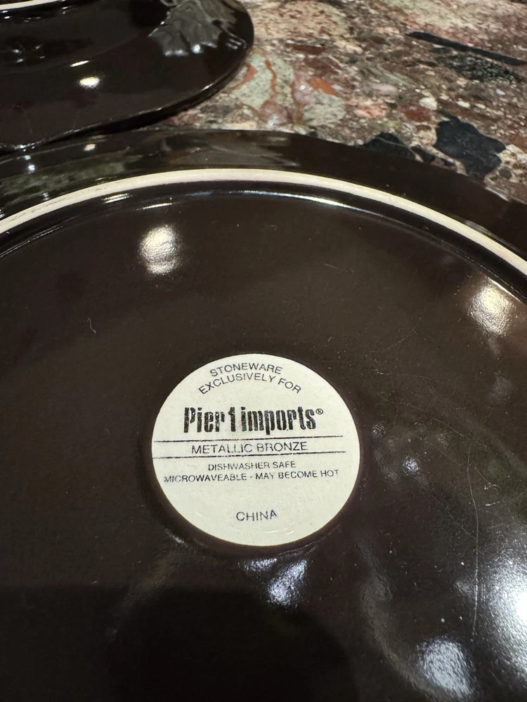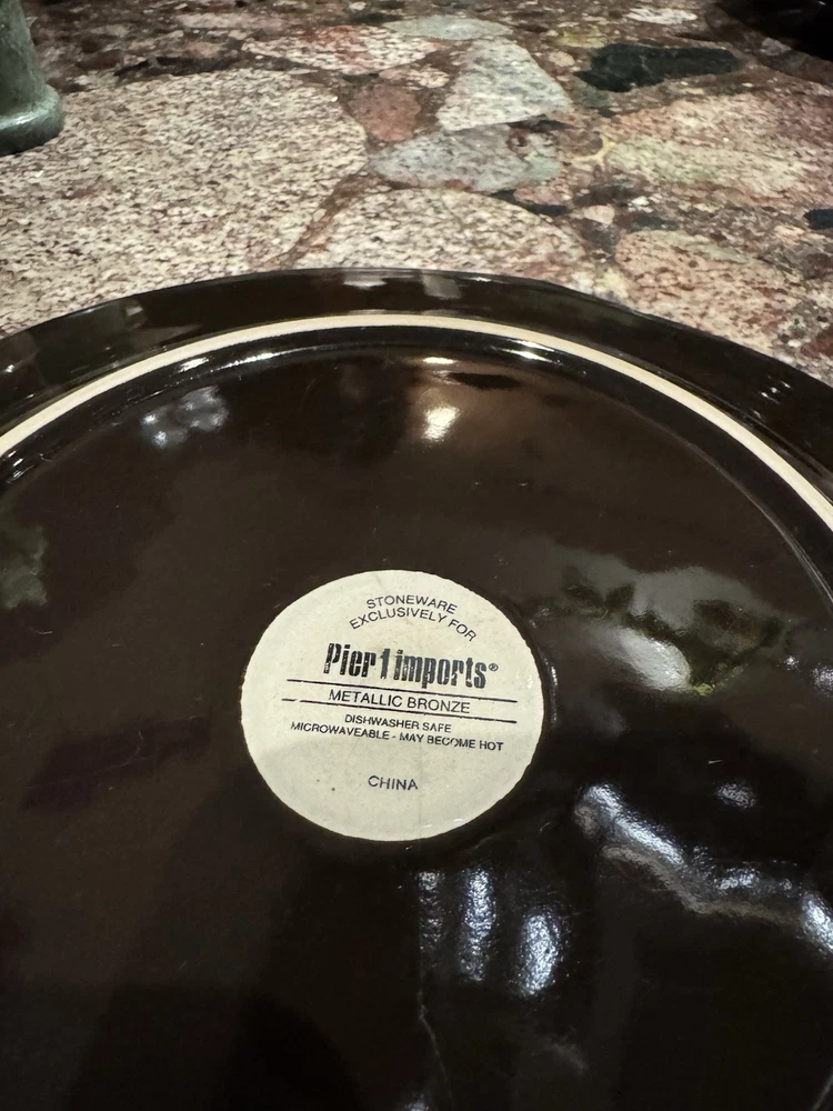 Elevate your dining experience with these contemporary Pier 1 Imports salad plates, featuring an elegant metallic bronze pattern that brings a touch of sophistication to any table setting. The set includes four round stoneware plates, each measuring 8 5/8 inches in diameter and four plates measuring 11 inches with a scalloped rim that adds a distinctive edge to your salads and appetizers. Crafted with care, these plates showcase a glossy finish and an iridescent theme that's perfect for all occasions. Whether you're hosting a formal dinner or enjoying a casual meal, these beige, black, and golden glaze plates are sure to impress. Their original printed backstamp confirms their authenticity and timeless design, making them a valuable addition to your collection. Note: plates show signs of wear with some spots on rim. A couple plates have a chip on the backside as depicted in the pictures. Price reflects imperfections. Items still look good and can be used as replacements or as sets.
