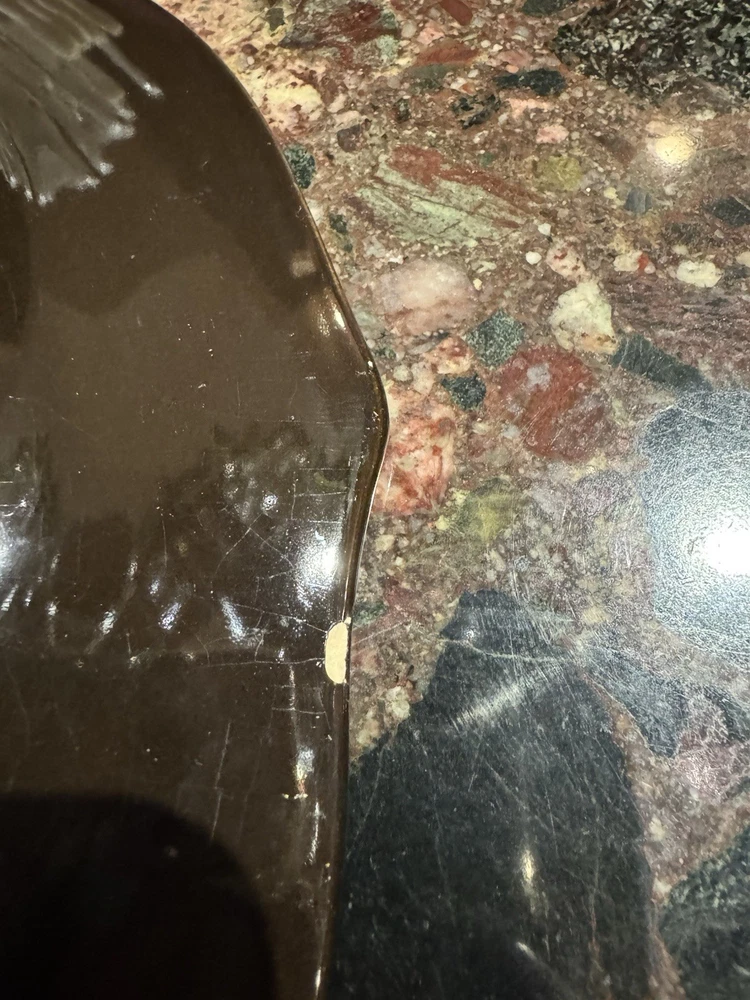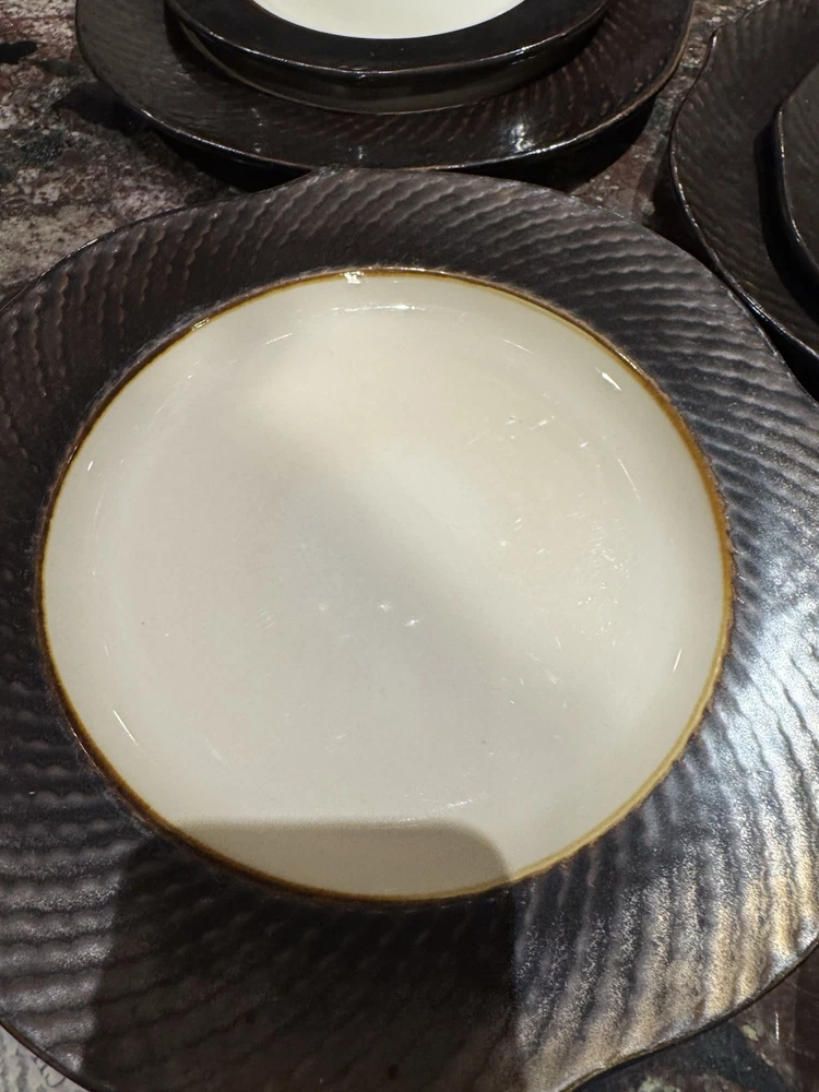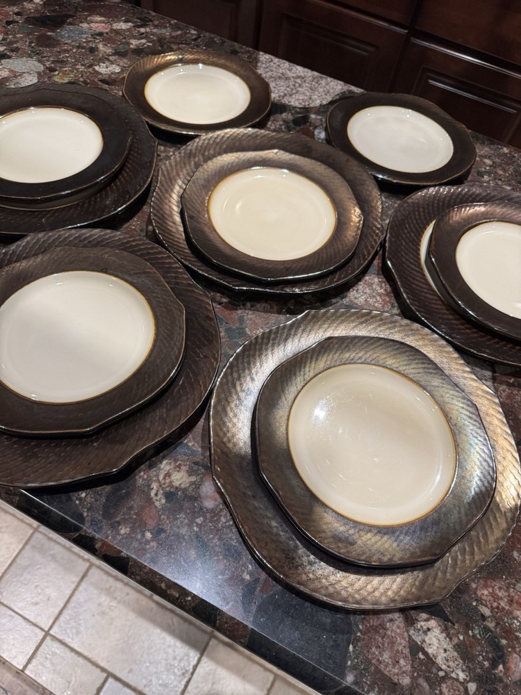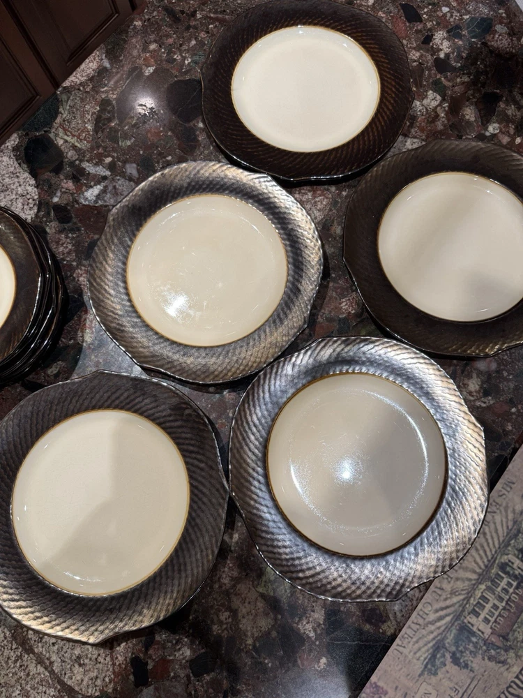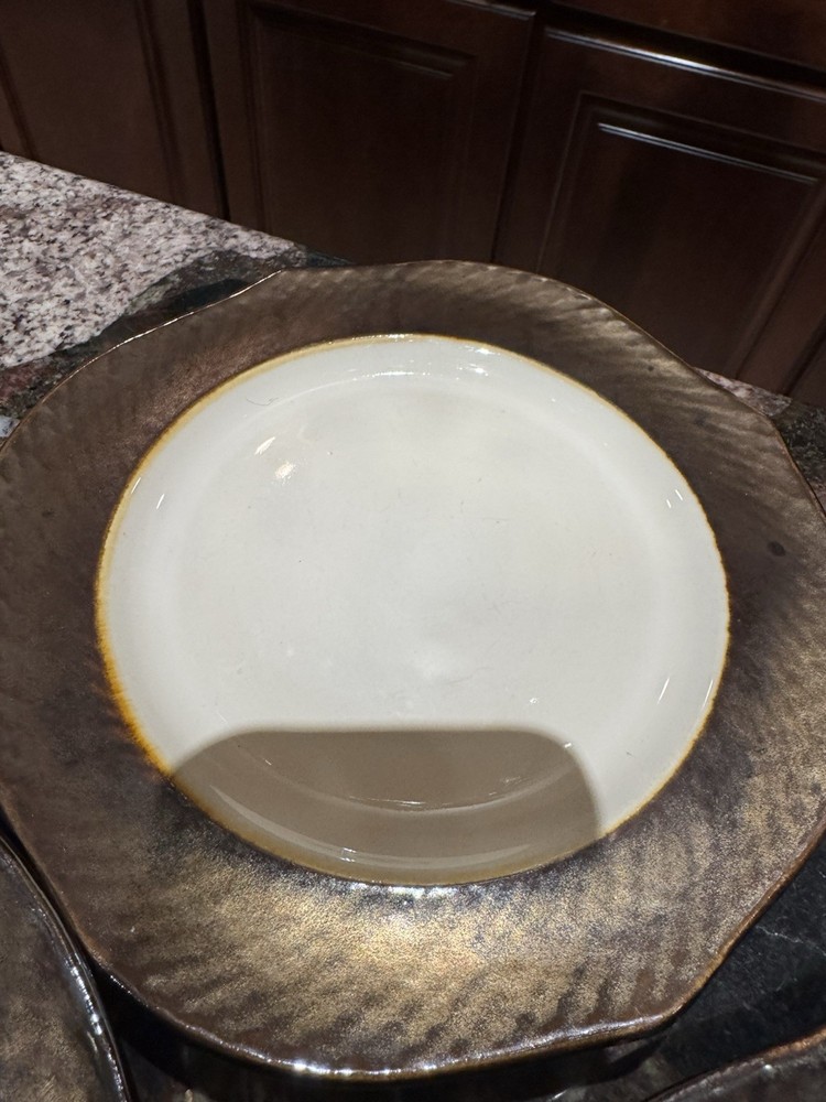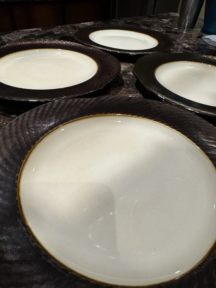 Elevate your dining experience with these contemporary Pier 1 Imports salad plates, featuring an elegant metallic bronze pattern that brings a touch of sophistication to any table setting. The set includes four round stoneware plates, each measuring 8 5/8 inches in diameter and four plates measuring 11 inches with a scalloped rim that adds a distinctive edge to your salads and appetizers. Crafted with care, these plates showcase a glossy finish and an iridescent theme that's perfect for all occasions. Whether you're hosting a formal dinner or enjoying a casual meal, these beige, black, and golden glaze plates are sure to impress. Their original printed backstamp confirms their authenticity and timeless design, making them a valuable addition to your collection. Note: plates show signs of wear with some spots on rim. A couple plates have a chip on the backside as depicted in the pictures. Price reflects imperfections. Items still look good and can be used as replacements or as sets.