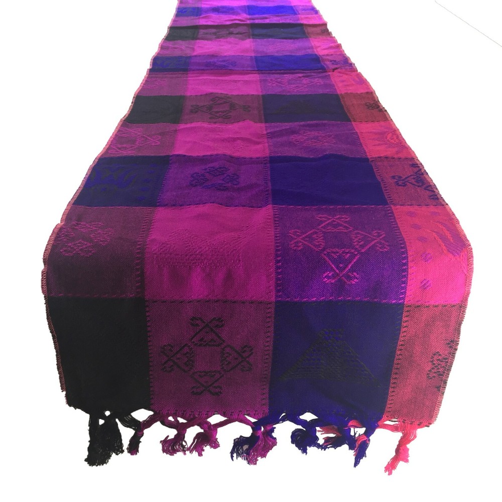 Mexican Mayan Table Runner Colorful Geometric Engraved Designs Lightweight Size: 14" width x 62" Length *Note: Colors and pattern designs may have a slight variation Washing Instructions: Machine washable in gentle cycle (single item) with mild soap, dryer in low heat Enjoy a complimentary FREE SHIPPING!