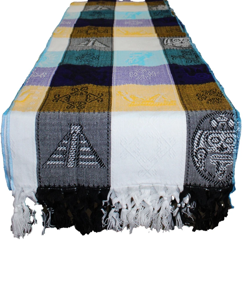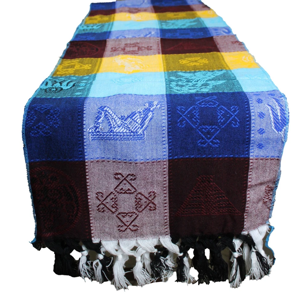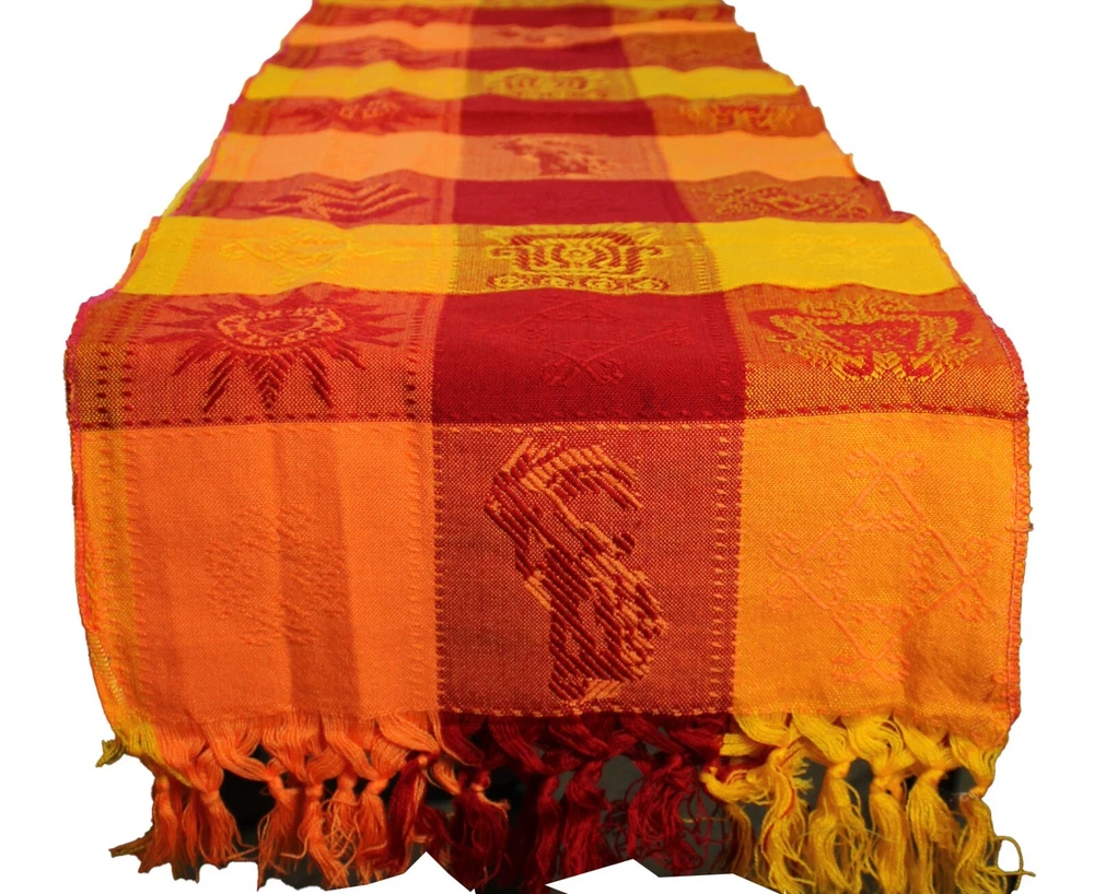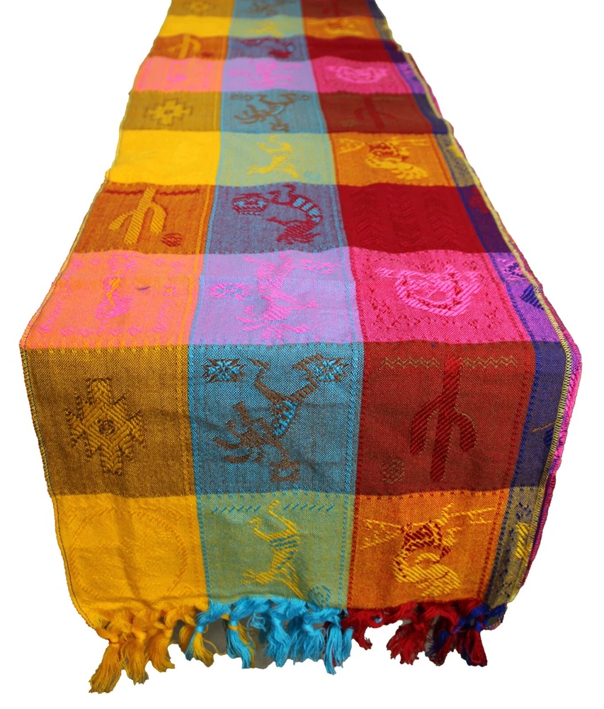 Mexican Mayan Table Runner Colorful Geometric Engraved Designs Lightweight Size: 13.75" width x 100" Length *Note: Colors and pattern designs may have a slight variation Washing Instructions: Machine washable in gentle cycle (single item) with mild soap, dryer in low heat Enjoy a complimentary FREE SHIPPING!