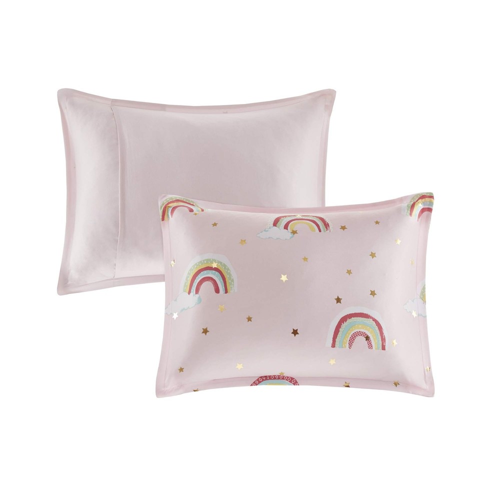 STYLE - Modern fun, adorable, and cozy comforter set to update your kids bedroom decor with a whimsical charm décor or a playful design. Featuring colorful rainbow motif on a pink base color highlighted with sparkling metallic print stars decoration. Matching sham and a complete sheet set mirror the design and complete the fun on this adorable styling bedding set, while the solid pink color reverse balances the look. The decorative pillow features sophisticated embroidery of novelty unicorn design in colorful rainbow color hues matching the complete sheet set MATERIAL - Feel the gentle brushed microfiber comforter set which offers ultra soft material to give you comfort and warmth. The comforter features sparkling metallic stars print filling up The cover and highlighting The adorable rainbow design on beautiful pink base color. The brushed microfiber complete sheet set will complete this bedding arangement. This ultra soft bedding set will make you feel extra cozy giving you a better quality rest every night. OEKO-TEX labeled textile certified as safe on skin ALL SEASON - Our all season comforter sets offers a soft fabric reverse. bedding collection aims to offer you a better quality sleeping experience. With the right amount of hypoallergenic down alternative filling, our cozy bedspread will give you the right amount of warmth and comfort for year round use WHAT'S INSIDE? - Twin Comforter: 66"W x 86"L (1), Matching Standard Sham: 20"W x 26"L + 1"D (1), Toss Pillow: 12"W x 16"L + 0. 25"D (1), Flat Sheet: 66"W x 96"L (1), Fitted Sheet: 39"W x 75"L + 12"D (1), Standard Pillowcase: 20"W x 30"L (1) CARE: Machine wash cold on gentle cycle, tumble dry on low heat, and do not bleach to keep the color vibrant. Pillows: Spot Clean. Commercial size washer is recommended