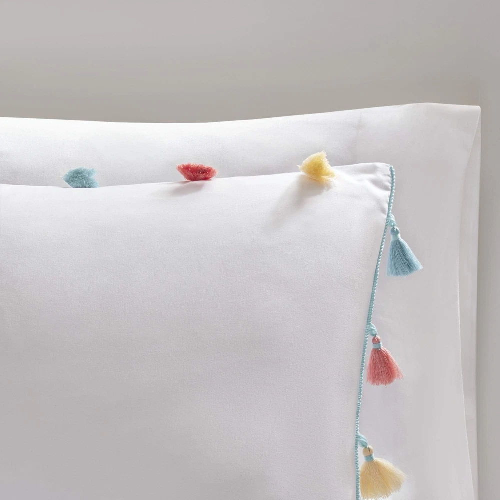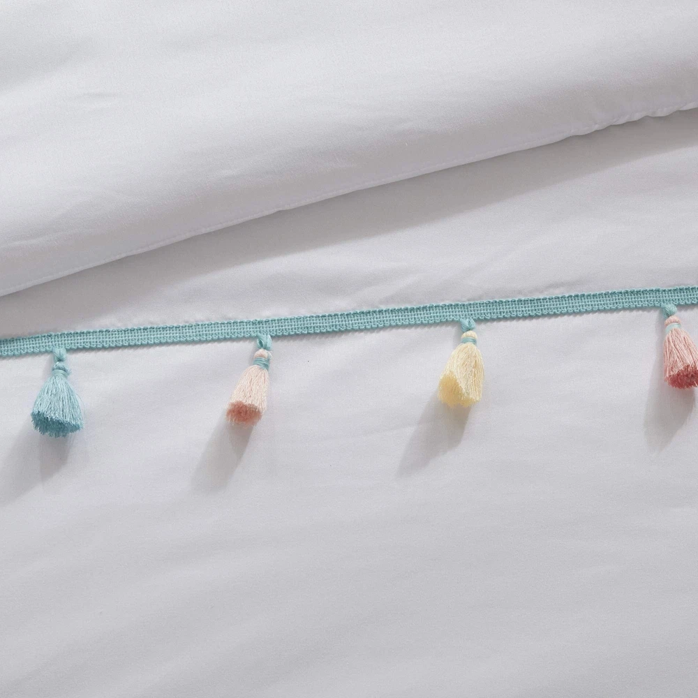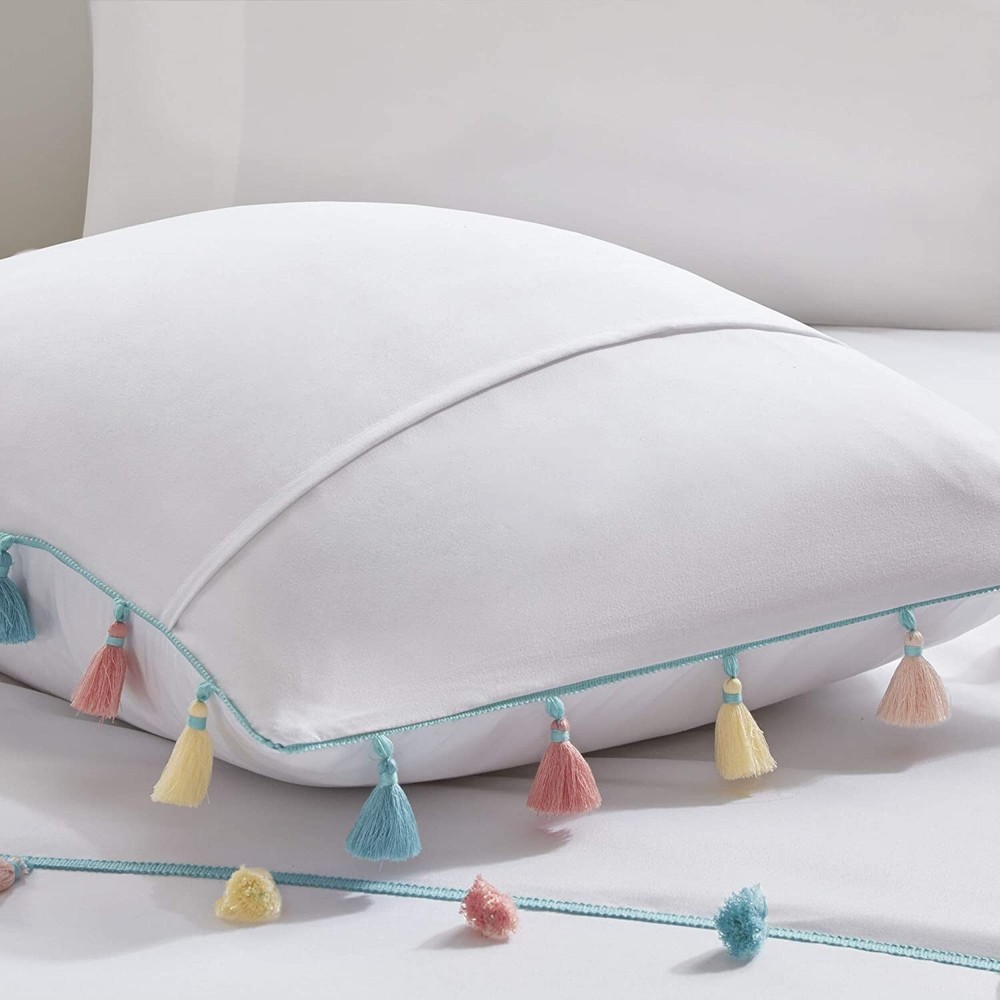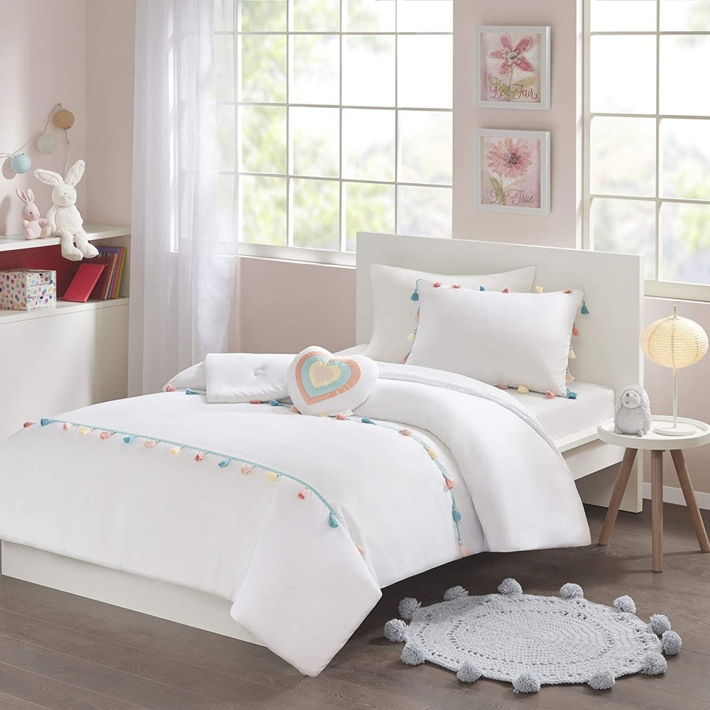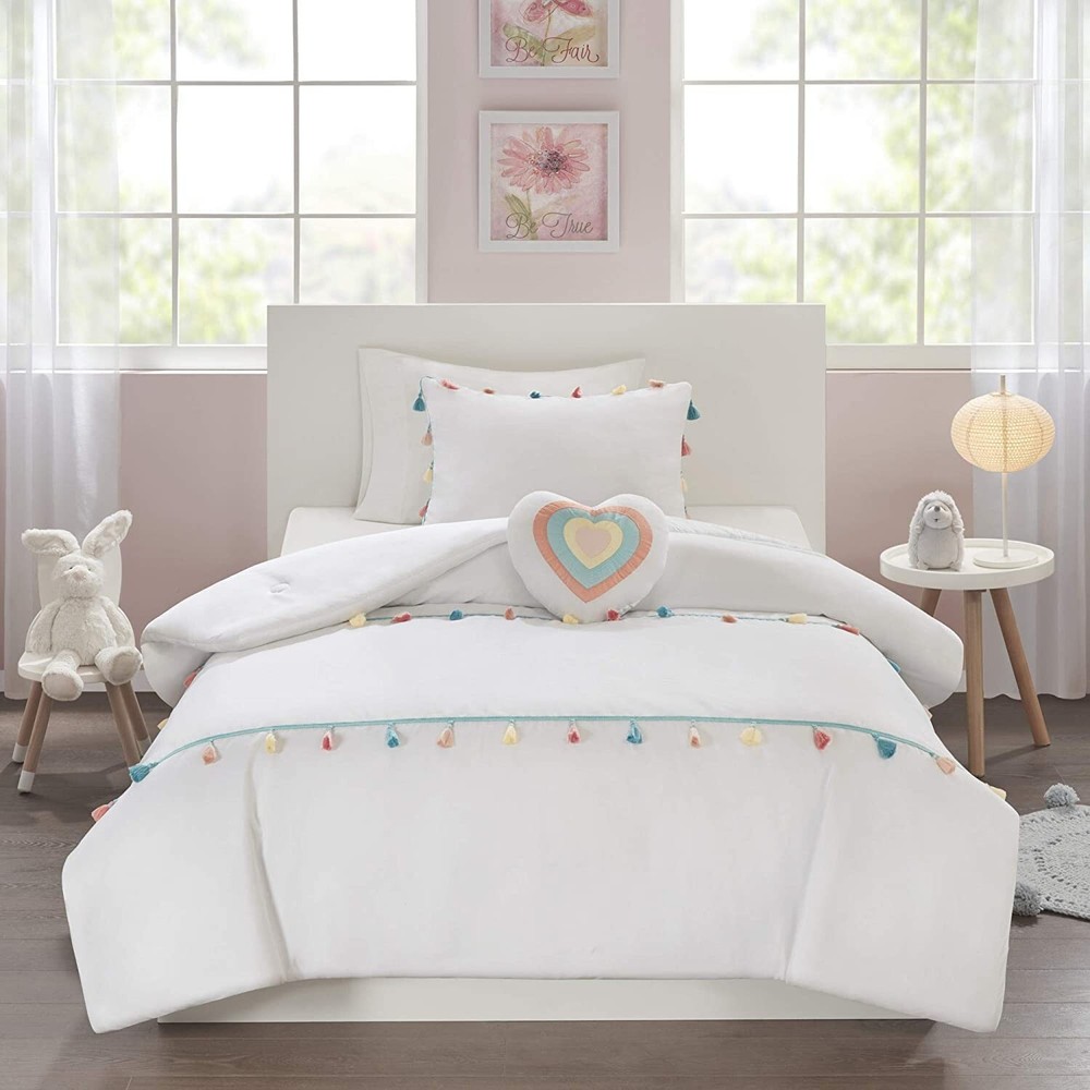 Mi Zone Kids Tessa Cozy Comforter Set, Colorful Fun Design All Season Children Bedding Girls Bedroom Décor, Twin, White with Colorful Tassel 3 Piece Product Details Size: Twin Comforter Color: White Brand: MI ZONE KIDS MPN: MZK10-168 UPC: 086569153807 EAN: 0086569153807 Size: Twin Comforter Included Components: 1 Comforter, 1 Standard Sham, 1 Decorative Pillow Color: White Style: Casual Brand: Mi Zone Kids Size: Twin Comforter Included Components: 1 Comforter, 1 Standard Sham, 1 Decorative Pillow Color: White Style: Casual Brand: Mi Zone Kids Theme: Children Pattern: Heart Material: Polyester Fabric Type: 100% Brushed Fabric Number of Pieces: 3 Seasons: All Product Care Instructions: Machine Wash. Spot Clean Pillow Manufacturer: E&E Co. Ltd DBA JLA Home UPC: 086569153807 Item dimensions L x W x H: 86 x 66 x 1 inches Global Trade Identification Number: 07 Product Dimensions: 86 x 66 x 1 inches Item Weight: 5.84 pounds Country of Origin: China Item model number: MZK10-168 Specifications: certified frustration-free Assembly required: No Batteries required: No 100% Brushed Fabric TECHNIQUE & COLOR - Our partial Bed in a bag set has a Twin size comforter is elegant ultra-soft brushed microfiber polyester added softness, two rows of color tassels with a solid reverse with the right thickness of most decor, perfectly matched Twin comforter set for a boy's or girl's room. This bed comforter Twin size balances the right amount of designs and color to make it look fantastic PRODUCT FEATURES - 3-Piece Twin-Comforter Set - Down alternative comforter Twin is soft, hypoallergenic, warm and snugly comfy. Twin size comforter is gift ready. Hidden bar tack technique to resist the fill from moving. Our Twin comforter sets for girls and boys is part of our bedding set collection that is part of dorm room essentials for comfy sleep WHAT IS INSIDE? - 1 Twin Comforter: 66"W X 86"L, 1 Standard Sham: 20"W X 26"L, 1 Decorative Pillow: 13"W X 13"L EASY CARE - To Clean the colorful Twin comforter: Machine wash cold the soft comforter on gentle cycle, tumble dry on low heat, do not bleach to keep the color vibrant. Pillows: Spot Clean. Clean new comforts instantly. Great selection of Twin duvet for girls or boys and easily reversed. Industrial size recommended YEAR ROUND - Our all season Twin bed comforter sets are part of our bedroom bedspreads collection has a soft reverse side. Designer creates the comforters bedding sets for a more comfortable bedroom experience. Not too thin nor too thick to be used all year without needing to pack away seasonal bedding Cute and simple, the Mi Zone Kids Tessa Tassel Comforter Set offers a fun update to your girl's bedroom. The white comforter and shams (1 in Twin/TwinXL) feature multi-colored tassels that add a fun and charming touch to the top of the bed. A heart-shaped decorative pillow with hypoallergenic polyester filling and embroidered details provides an adorable finishing touch. Machine washable for easy care, this child’s comforter set is sure to brighten your bedroom décor.