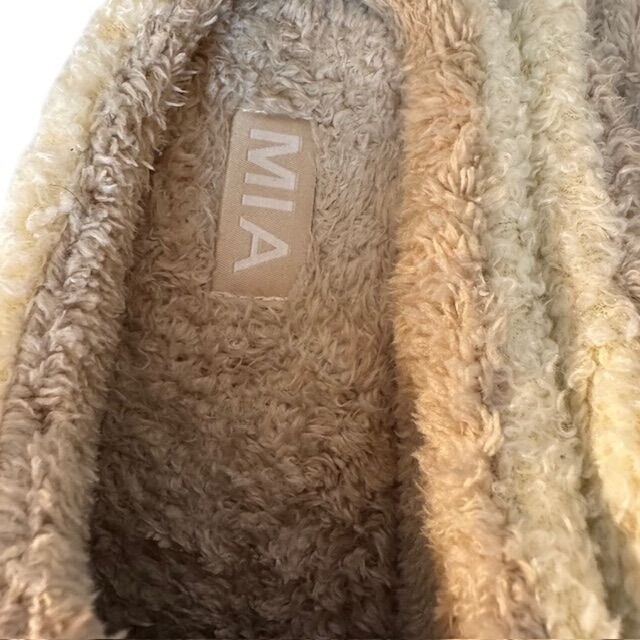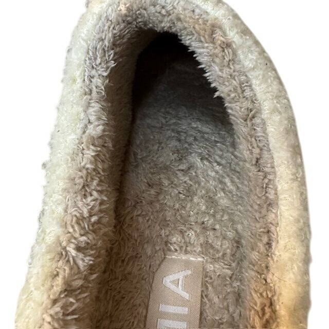 These Mia slippers feature a whimsical smiley face design. Ideal for keeping feet warm and comfortable, they are crafted from soft faux fur materials. The slippers are designed for a snug and cozy fit, providing both style and functionality for indoor wear. • Faux fur upper and lining • Textured fabric outsole • Smiley face design • Available in size 9M