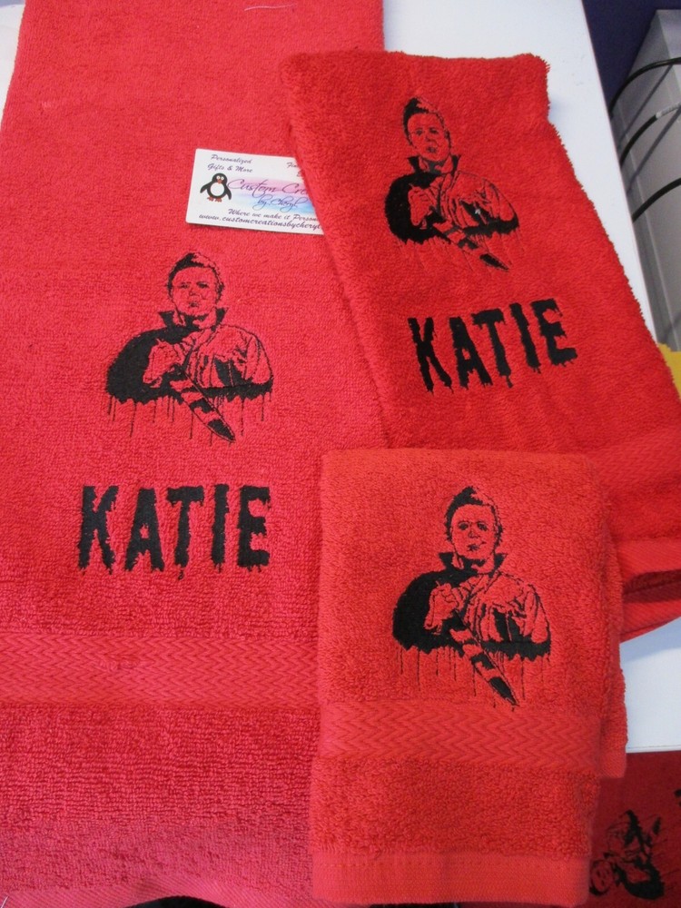Up for sale on this auction is a really nice PERSONALIZED 3 piece towel set: bath (50 x 26) hand (25 x 16) towel and washcloth combo set. This set is red set with Michael face sketch look alike with the name of your choice but I can do any towel, washcloth and or hand towel color that you would like just leave the info in the comment box when you checkout. I have green, purple, tan, chocolate, hot pink, black, dark gray, red, turquoise, white, navy blue, burgundy red, & royal blue. The washcloth is the design only. I do have other designs as well. I do have many thread colors to choose from. All of my items are custom made new and do come from a smoke free home. I will be more then happy to combine shipping charges. If you do not see a design that you are interested in please ask as I am sure I will have it. Designs range from sports, mascots, kids themes, weddings, teens, and many more.... Please leave the info in the comment box when you checkout. PLEASE LEAVE THE TOWEL COLOR AND THE NAME YOU WOULD LIKE IN THE MESSAGE COMMENT BOX WHEN YOU CHECKOUT !!! IF NO INFO IS LEFT THEN I WILL USE THE TOWEL COLOR LISTED IN THE MAIN PIC ALONG WITH THE DESIGN ONLY !!! THANKS FOR LOOKING!!!
