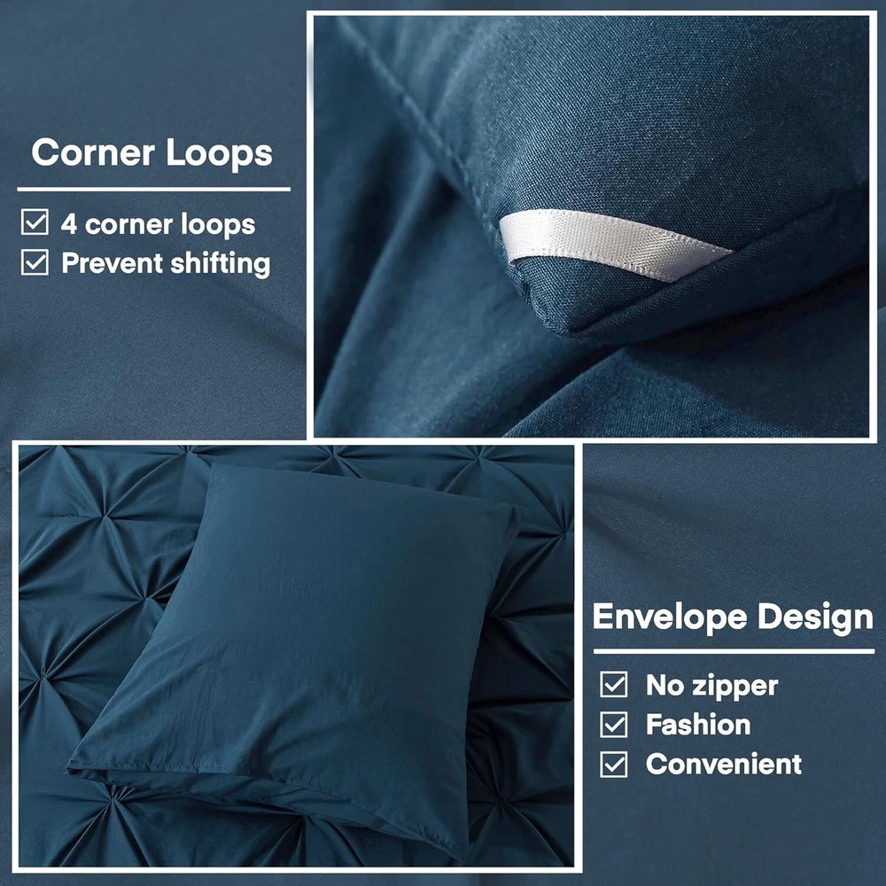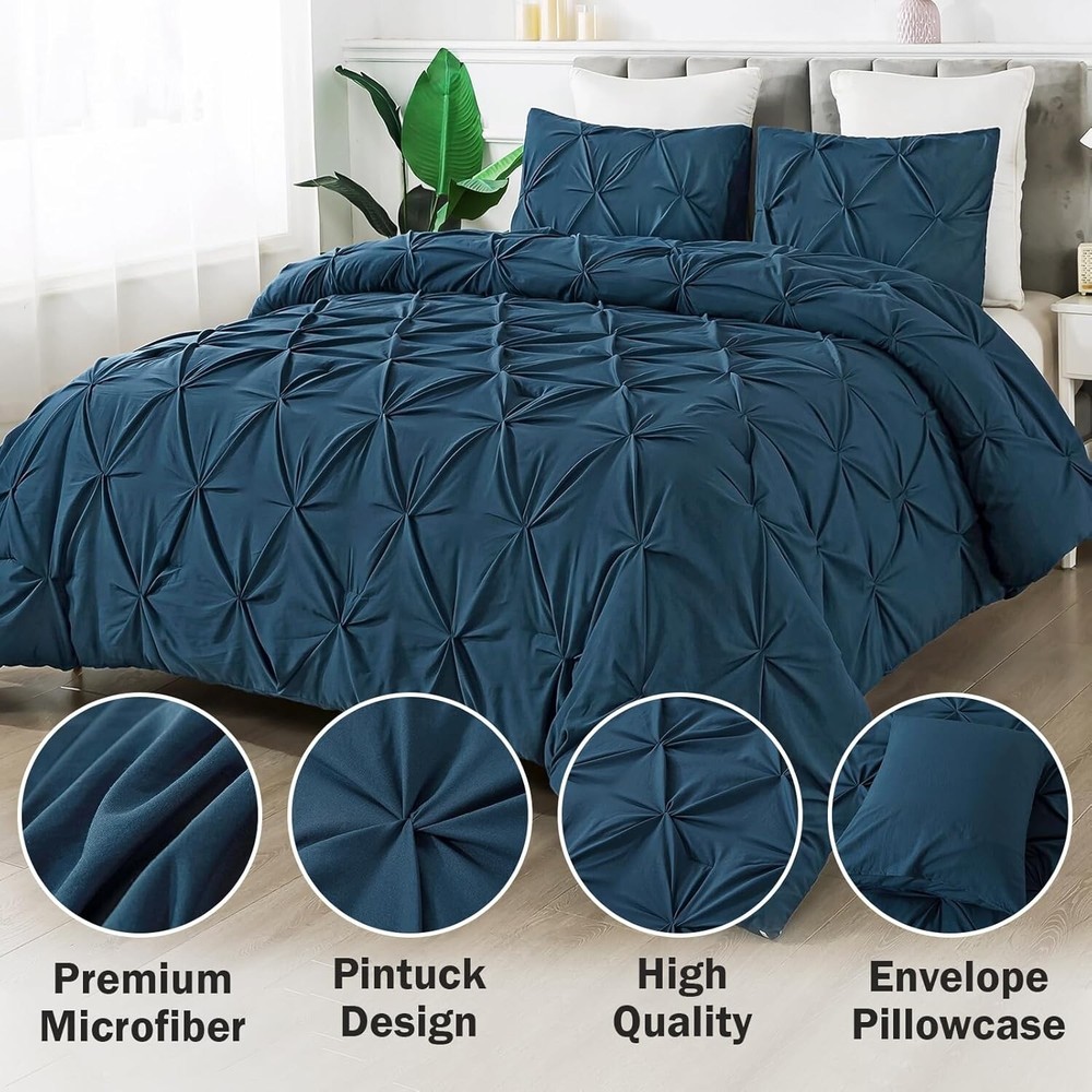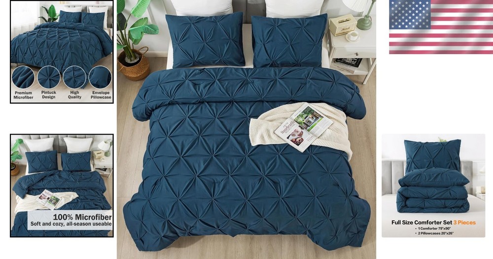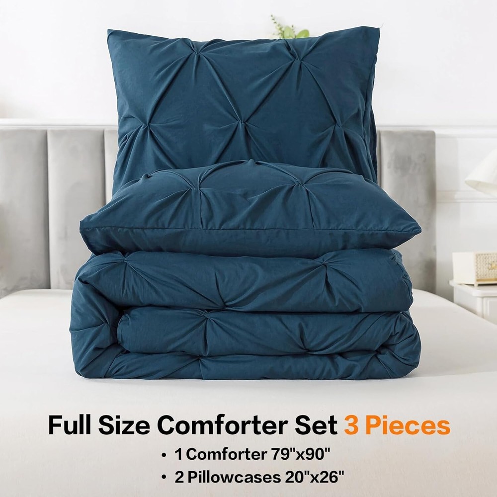 This comforter set is a game-changer! The ultra-soft microfiber feels amazing against the skin, and the down-alternative filling keeps me perfectly warm without overheating. The navy blue color is rich and elegant, while the pinch pleat detailing adds a luxurious touch to my bedroom. It's surprisingly lightweight yet cozy, washes well, and stays wrinkle-free. The full size fits my bed perfectly with just the right amount of drape. After a few weeks of use, it still looks and feels brand new – definitely worth every penny for the quality and comfort!