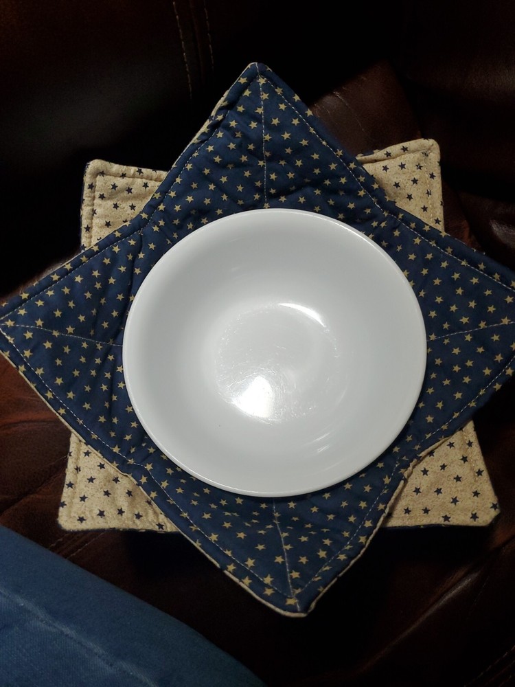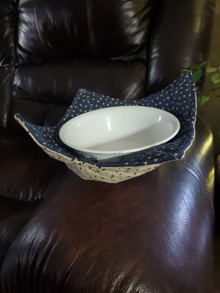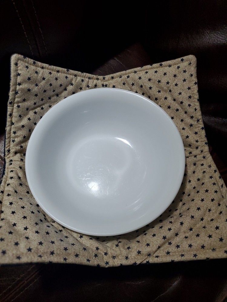 Microwavable Reversible Bowl Holder / Cozy. Machine washable. Put your bowl in this cozy and place directly in to the microwave. No more fumbling to remove hot dishes from microwave again! Just grab corners of the fabric and easily remove without burning fingers or spilling the contents. Works great for those messy kids. Just toss it into the washing machine and then the dryer. The holder/cozy is roughly 8.5 inches. It can hold a number of different size bowles. Made with 100% cotton fabric, 2 layers of Pellon Wrap-N-Zap microwavable batting. It is safer than using a potholder or paper towels. This bowl holder/cozy works well with ice cream too. It will keep your hands warm when you are enjoy your treat. It's great for anytime of the year. Makes a GREAT gift. Looking for something different for the new home owner?? It's awesome for college students. Made in a smoke free home.
