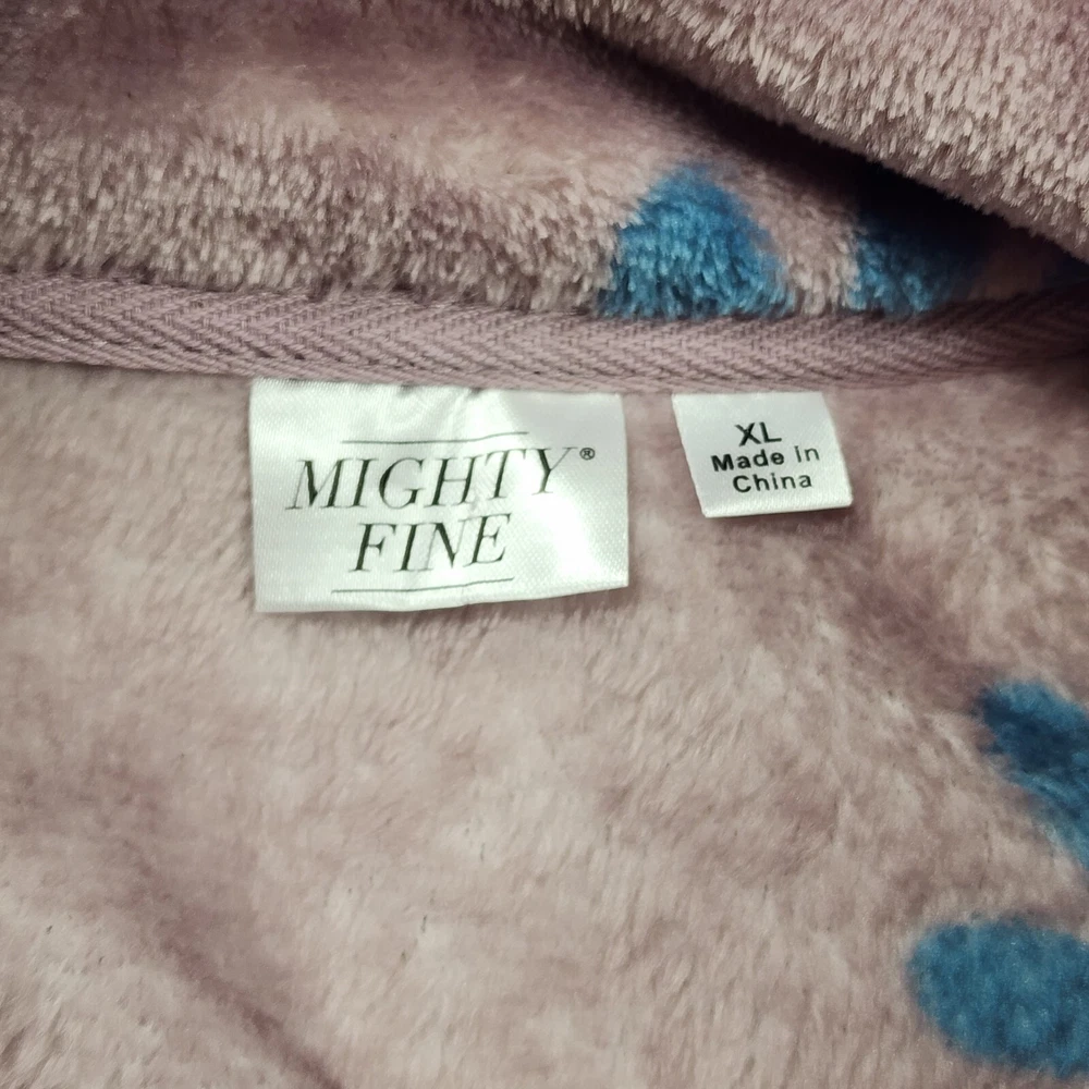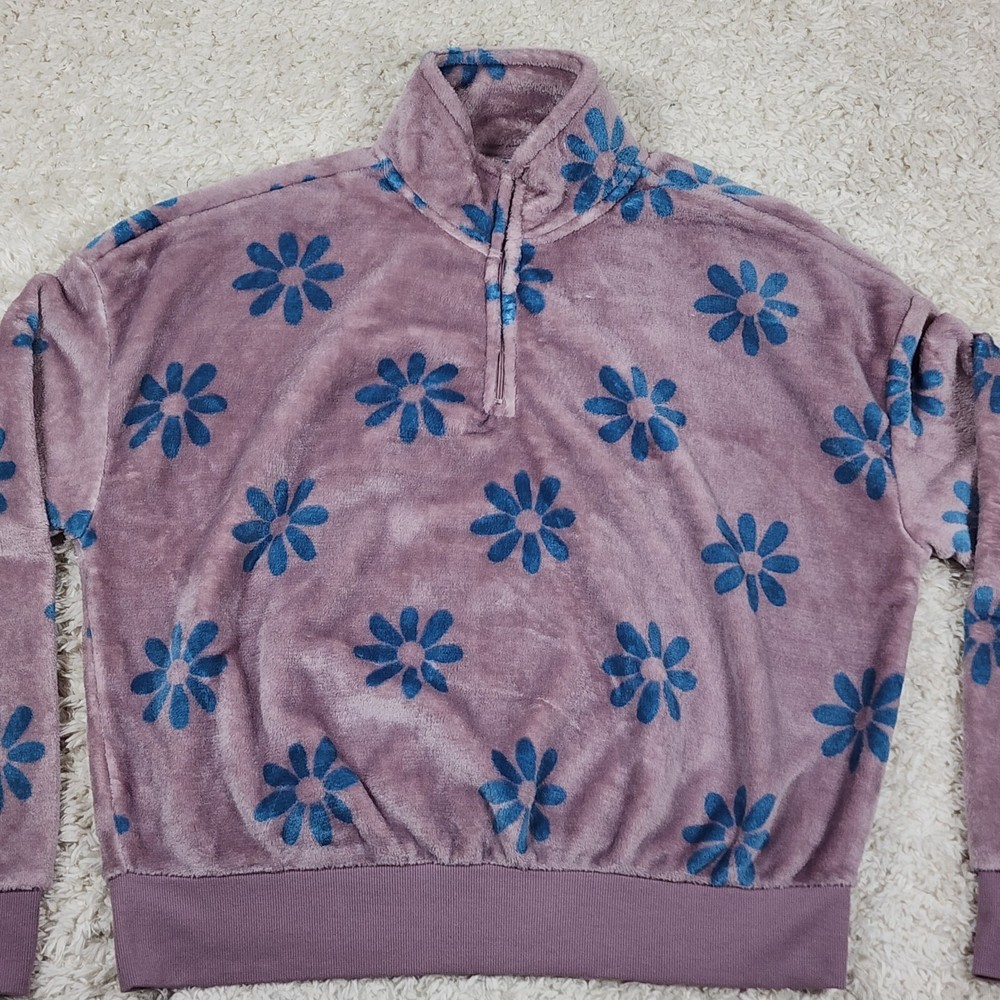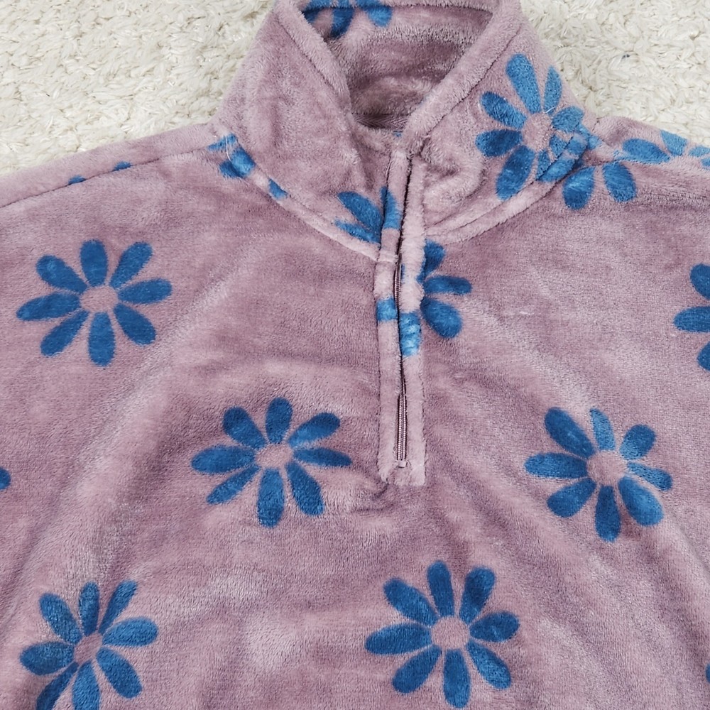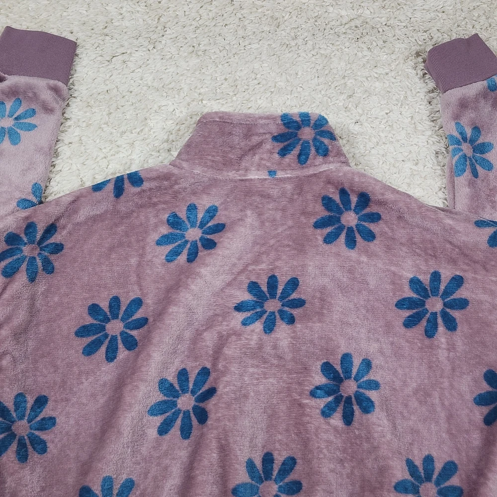 Mighty Fine Pullover Womens XL Purple Floral Super Soft Cozy Quater Zip Sherpa Size: XL Add a pop of color to your wardrobe with this Mighty Fine Pullover in XL size. The floral pattern and logo accent make it perfect for any occasion, be it travel, party, casual outings, or workwear. The mock neck and 1/4 zip closure provide both style and comfort, while the fleece fabric keeps you cozy in all seasons, whether it's winter, summer, fall, or spring. The long sleeves and regular fit add to the ease of wear, and the garment is easy to care for with machine washable fabric. This sweatshirt is made of 100% polyester and is perfect for walking, hiking, or school. Measurements Length: 25" Pit to pit: 25-1/2" A446